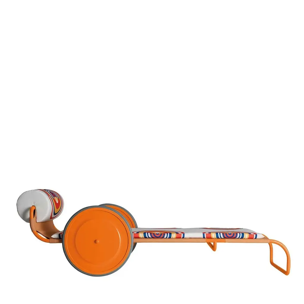 An effervescent mix of spherical and linear forms that echoes the iconic 1960s style define this striking sun lounger, brought to life by Exteta's unparalleled craftsmanship as a tribute to the contemporary significance of Gae Aulenti's legacy who designed the Locus Solus Collection in 1964. This sun lounger's bright orange tubular steel frame boasts two oversized wheels, a distinctive feature and a functional element to easily move it around, and a bolster-style headrest. The removable upholstery shown is an exclusive abstract print but all Exteta catalog fabrics are available upon request.