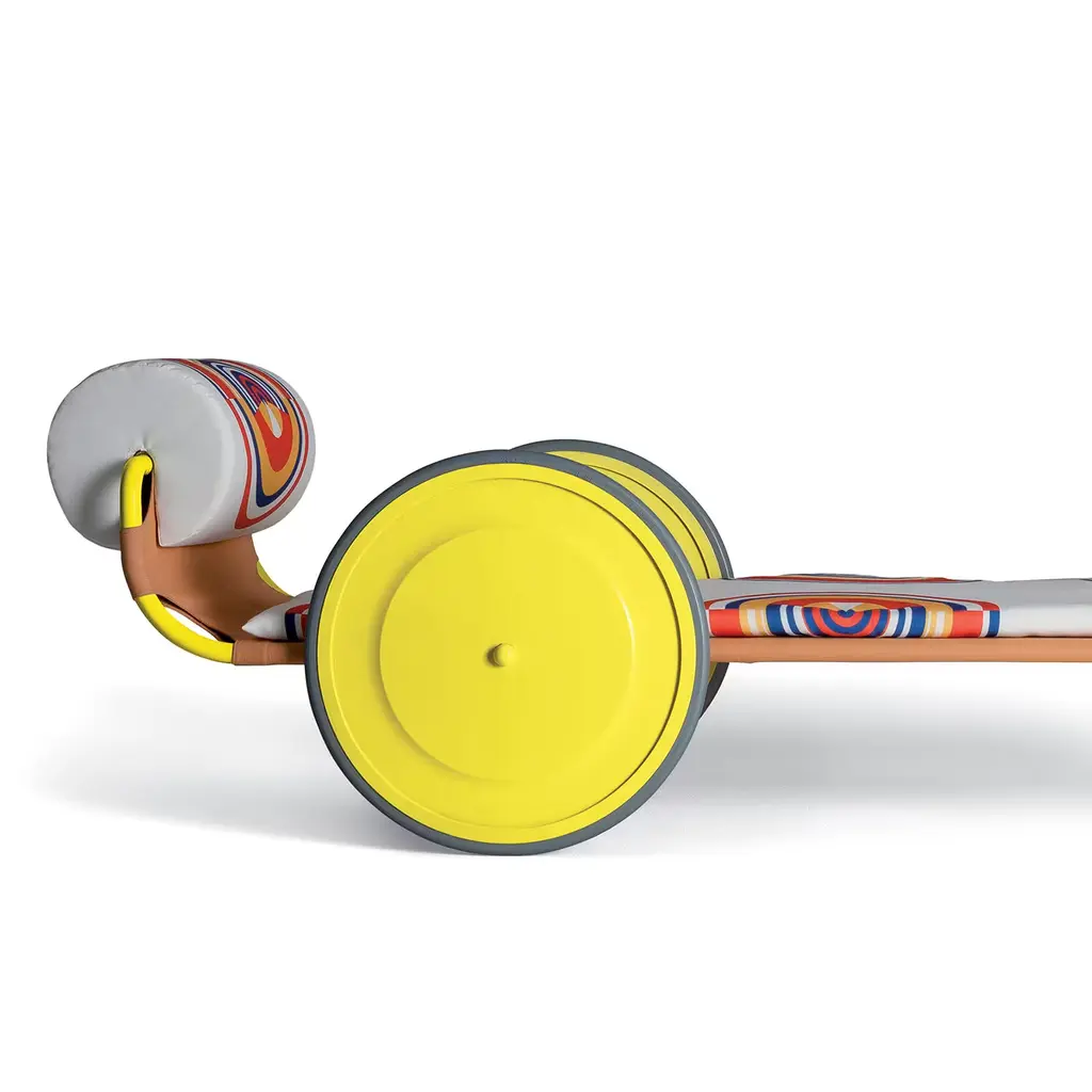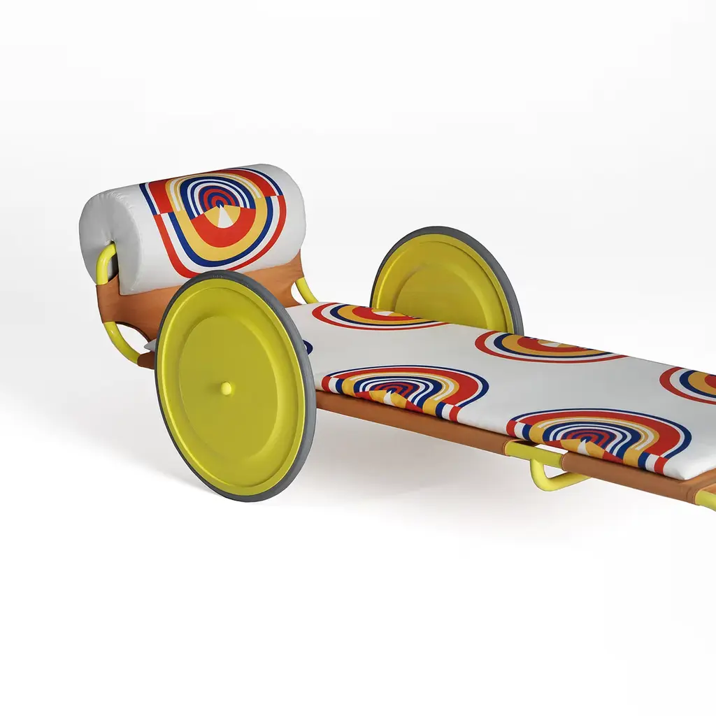 An exquisite design of extraordinary craftsmanship, this sun lounger is an harmonious combination of materials, lines and functionality that will create a style statement in any outdoor. This piece of the iconic Locus Solus Collection by Gae Aulenti, boasts an intriguing, architectural frame formed by a single winding piece of tubular steel finished in vibrant yellow, accessorized with an oversized headrest and wheels, that serve a functional and decorative purpose. The removable fabric cover is shown in an exclusive colorful print and is available in all Exteta fabrics on request. If the products are placed completely outside, nightcovers that can be purchased at an extra price are recommended. Please contact the Concierge for further information and options.
