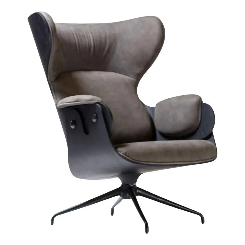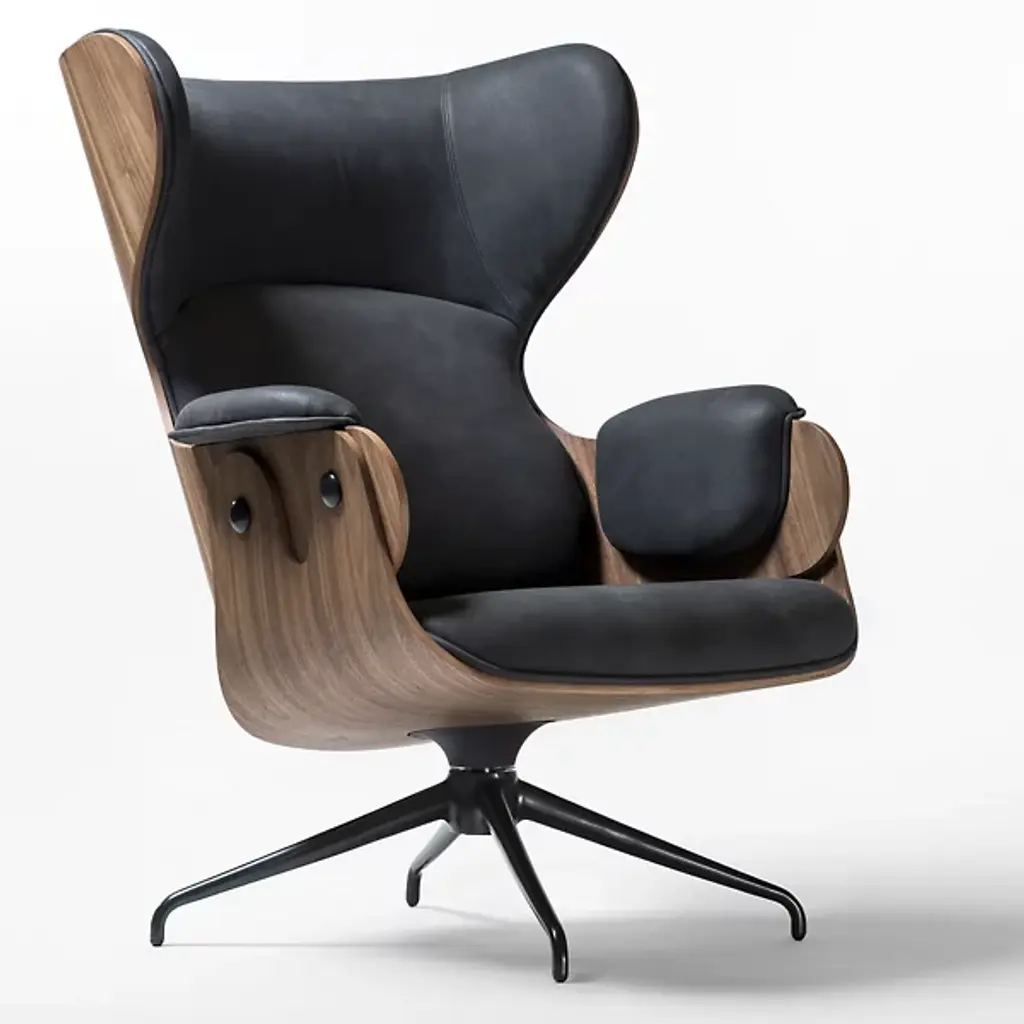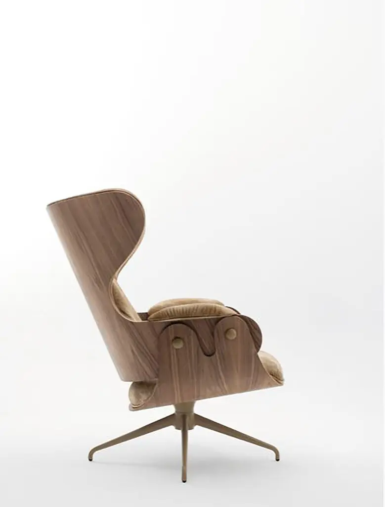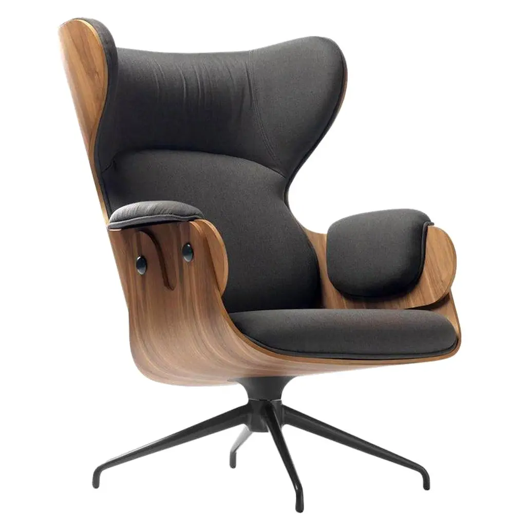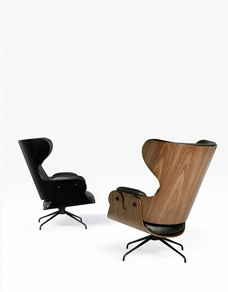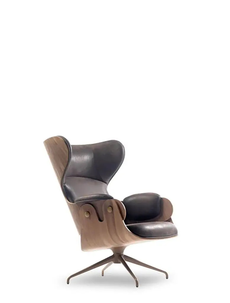 Lounger armchair designed by Jaime Hayon for BD Barcelona. Spanish artist-designer Jaime Hayon is one of the most acclaimed creators worldwide. Hayon’s esteem and knowledge of artisan skills and his inherent creativity have allowed him to push the boundaries of many mediums and functions, resulting in collections for very diverse clients. This lounger has an optional footstool and both have their base in powder coated cast aluminum. The seat, backrest, and footstool are made with plywood having the exteriors in different textures ranging from lacquered MDF to varnished walnut, natural ash, ashwood stained oak or ashwood stained black. Hayon has finished the structure with Fine decorative metallic buttons at Apt places to match the flawless design. The armrests, seat, backrest, and footstool are upholstered in various materials and leathers provided by BD, giving it a class of elegance for your interiors.Finishes:• Natural Ash • Stained Black Ash • WalnutMultiple configurations are available. Contact us for details.Indoor use.