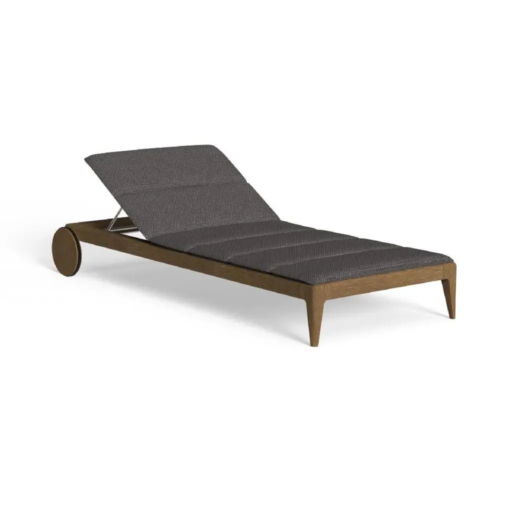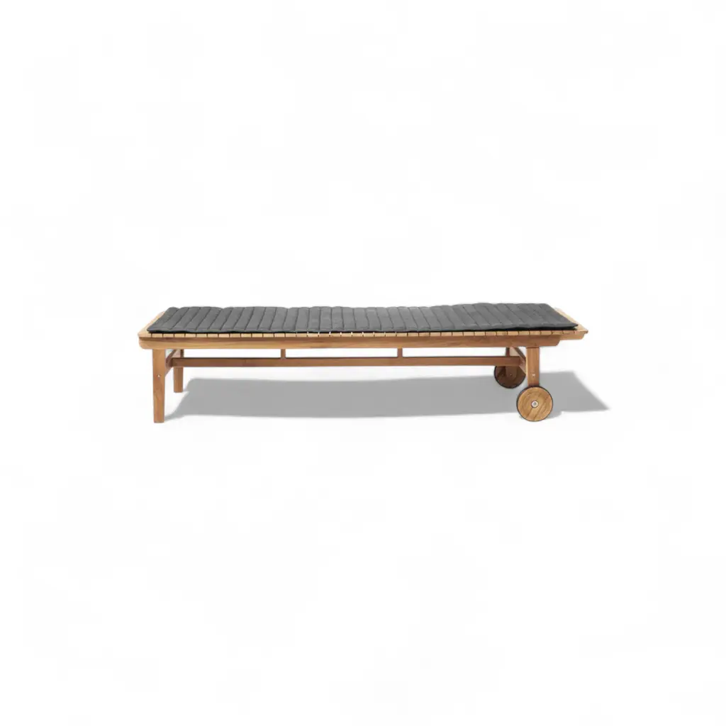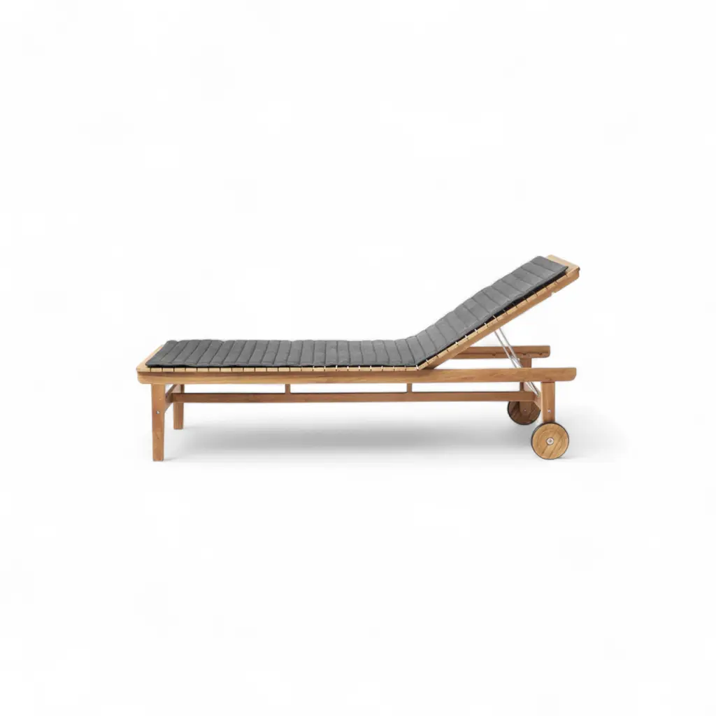 This long, single-piece cushion is made to fit the M8 Sammen sun lounger. It follows the full length of the frame, from headrest to foot, and bends cleanly with the adjustable backrest. The surface is stitched into slim horizontal channels that keep the filling even and the shape consistent. Made from weather-resistant fabric, it fastens securely so it stays put—even when you wheel the lounger to a sunnier spot. Soft enough to stretch out on for hours, without changing the profile of the design.