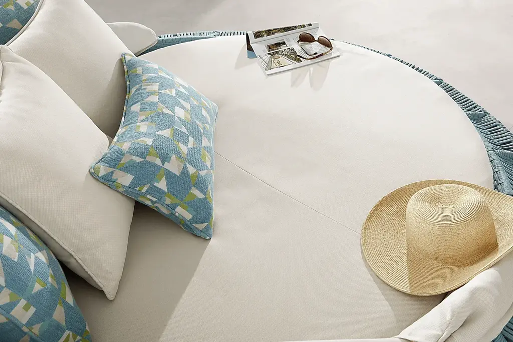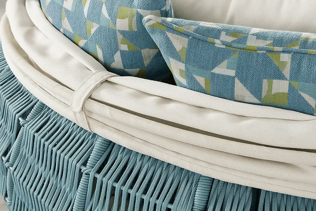 Moments spent stretched out in a dreamlike serenity are moments to cherish on the Malibu daybed, its ultra cozy profile balanced against a sophisticated look made to turn heads and get everyone buzzing. A round frame of rust-resistant aluminum is wrapped in marine grade rope in teal, UV-resistant for lasting color and enjoyment. The collapsible sunshade in beige can be tidied away and secured shut by a simple self-fastening closure when not in use. To add to the inviting comfort of the round beige cushion, six pillows are included in patterned and matching outdoor fabrics to create exactly the support and softness you want for those dreamy afternoon naps on the patio.