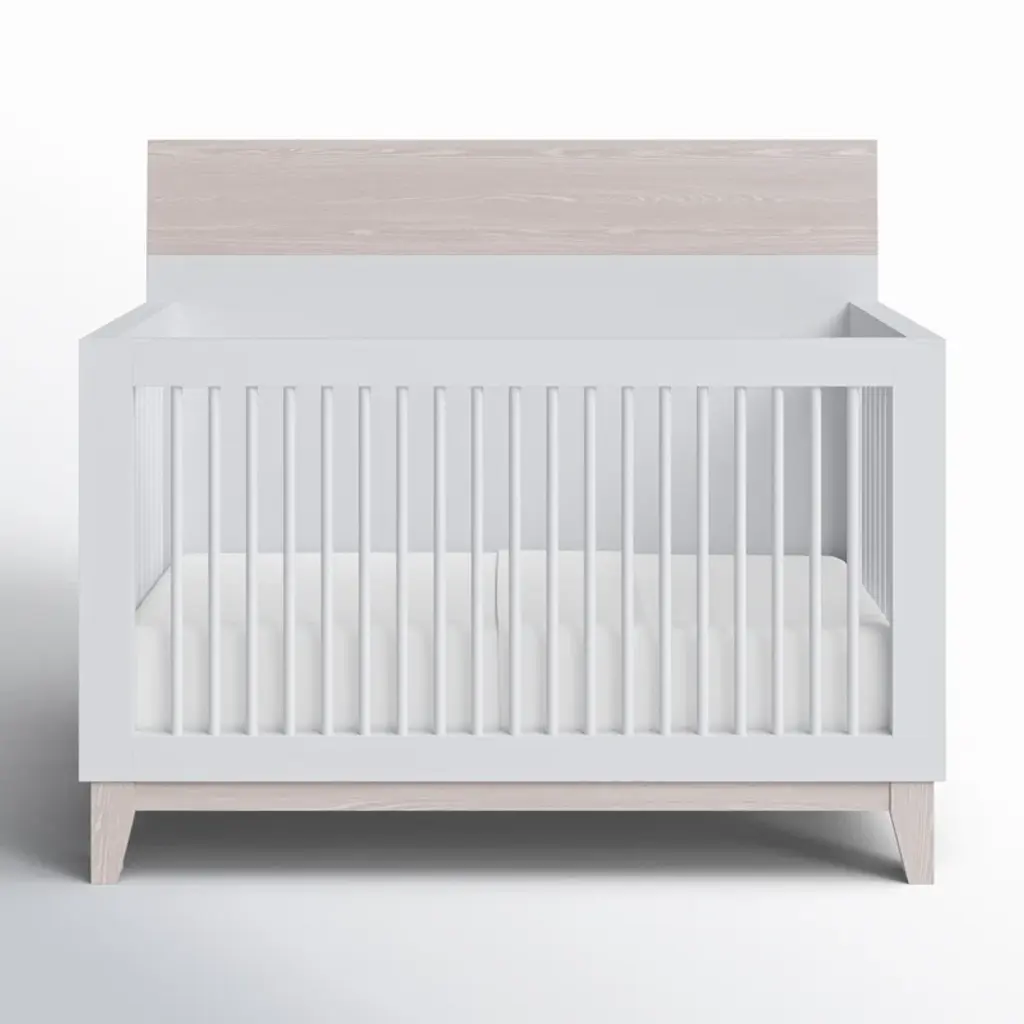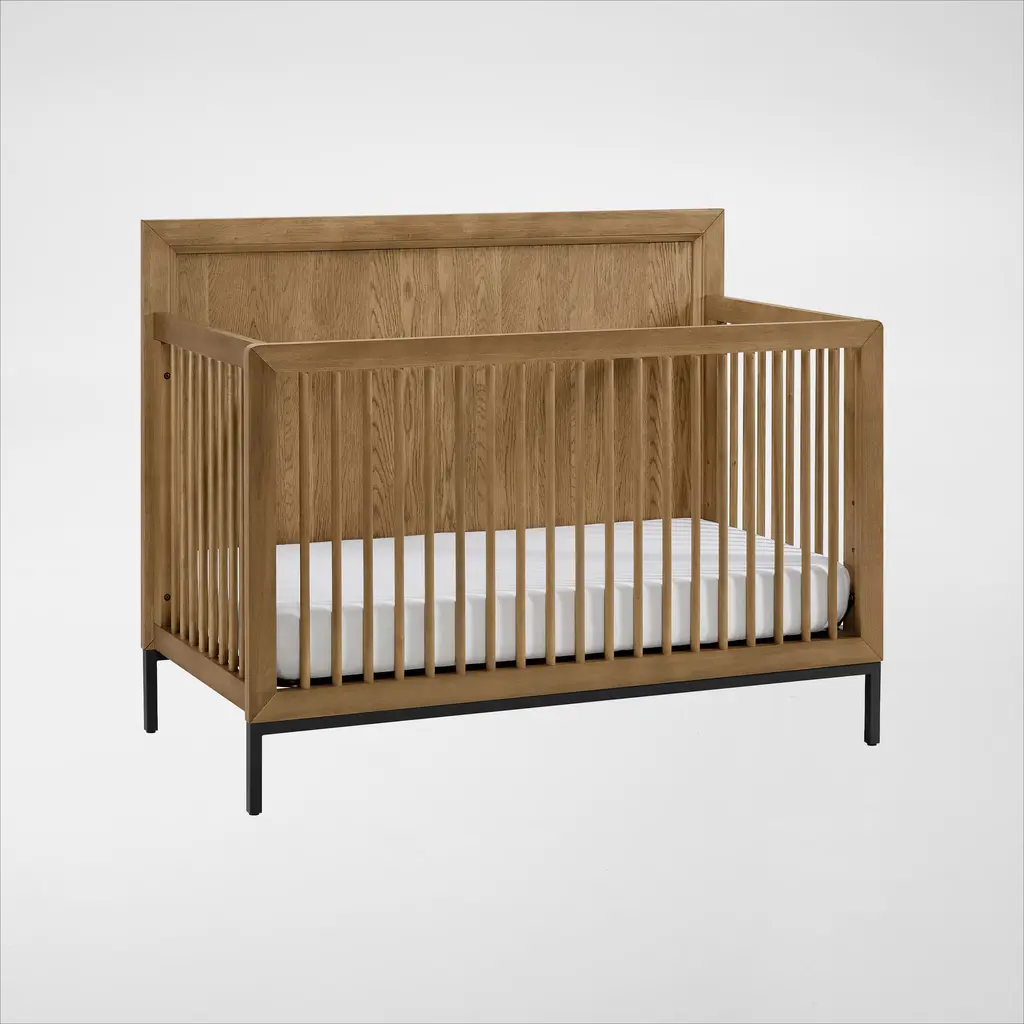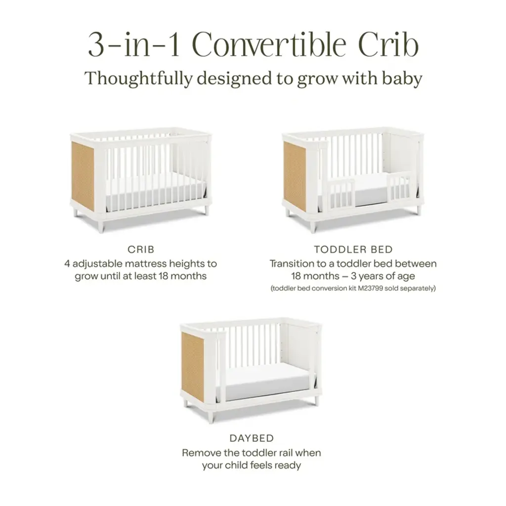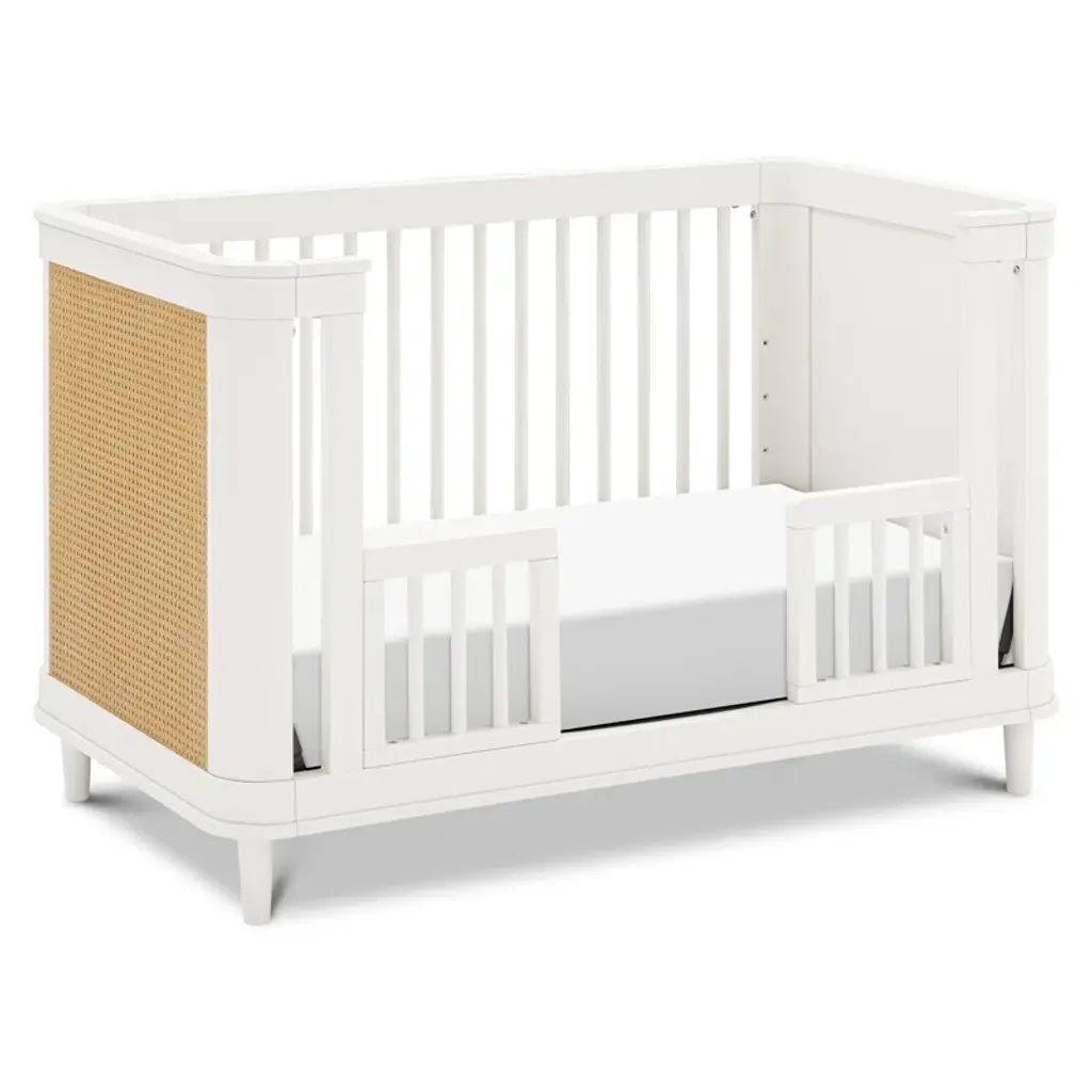 Ease into contemporary style with the Marin 3-in-1 Convertible Crib. Featuring a gently curved silhouette with solid rounded cane side panels, the Marin is an effortlessly transitional piece for the home. Crib converts to a toddler bed and daybed, and fits any standard full-size crib mattress