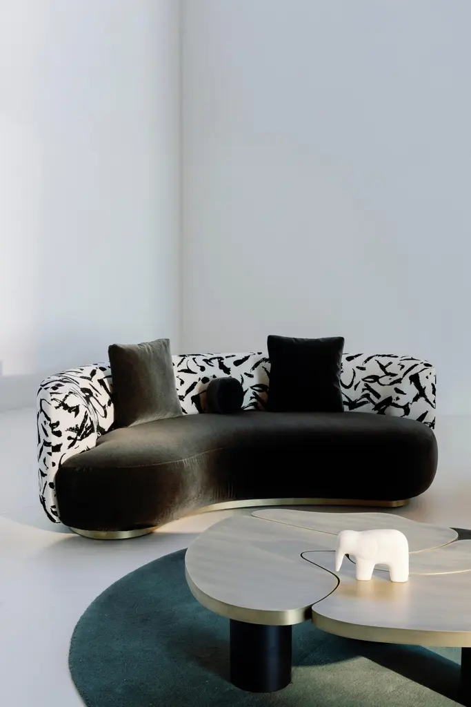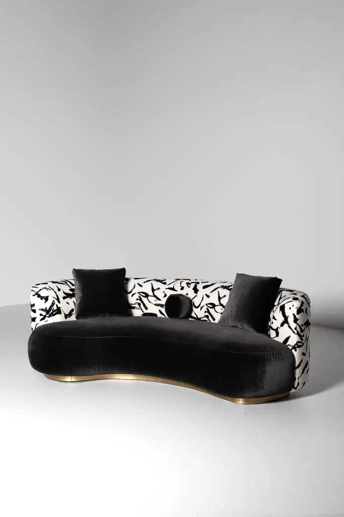 Mid-Century Modern Twins sofa, Contemporary Collection, Handcrafted in Portugal - Europe by Greenapple.The Twins curved sofa and its matching daybed share the same genes, yet each maintains a distinct identity, forming a pair defined by perfect asymmetry. With sculptural curves and sumptuous upholstery, the Twins curved sofa embodies both contemporary elegance and refined artistry, creating a lounging experience of unparalleled comfort. A favorite among designers, it stands as the ideal centerpiece for today’s most sophisticated interiors.The Twins sofa is upholstered in DEDAR beige velvet with black details in the backrest and DEDAR black mohair velvet in the seat.. The fabric can be treated with a stain-resistant finish for added durability.The sofa base is in antique brass with matte finish.Its structure is made from anti-fungal and vermin-free solid steamed beechwood and birch plywood, ensuring exceptional strength and stability. Designed to withstand humid environments, it is also suitable for outdoor use when customized with weather-resistant fabric.The Twins sofa can be customized in terms of dimensions, materials and finishes.Twins Material CodesME032 Brass, Brushed, Burnished, Varnished, Antique-Brass, MatteDEDAR velvet Ichi-go Ichi-e ; col. 2DEDAR Mohair Velvet, BlackHandcrafted in Portugal - Europe by GreenappleUnique by design, Crafted by peopleGreenapple transforms contemporary spaces into exclusive narratives of design and craftsmanship. From custom-made furniture to bespoke interiors, each creation is a timeless work of art, shaped by master artisans who honor centuries-old techniques.Founded in 2005 by Sérgio Rebola and Rute Martins, Greenapple has earned global recognition among high-end clientele and leading design firms. While Rute designs each unique piece, Sérgio ensures uncompromising quality from design to production and from production to your home. We provide a seamless experience, offering short production lead times, worldwide delivery within 7 to 10 days, and white-glove service upon request.For U.S. clients, we can handle customs clearance, and offer white-glove service as well upon request.Couch, Sette