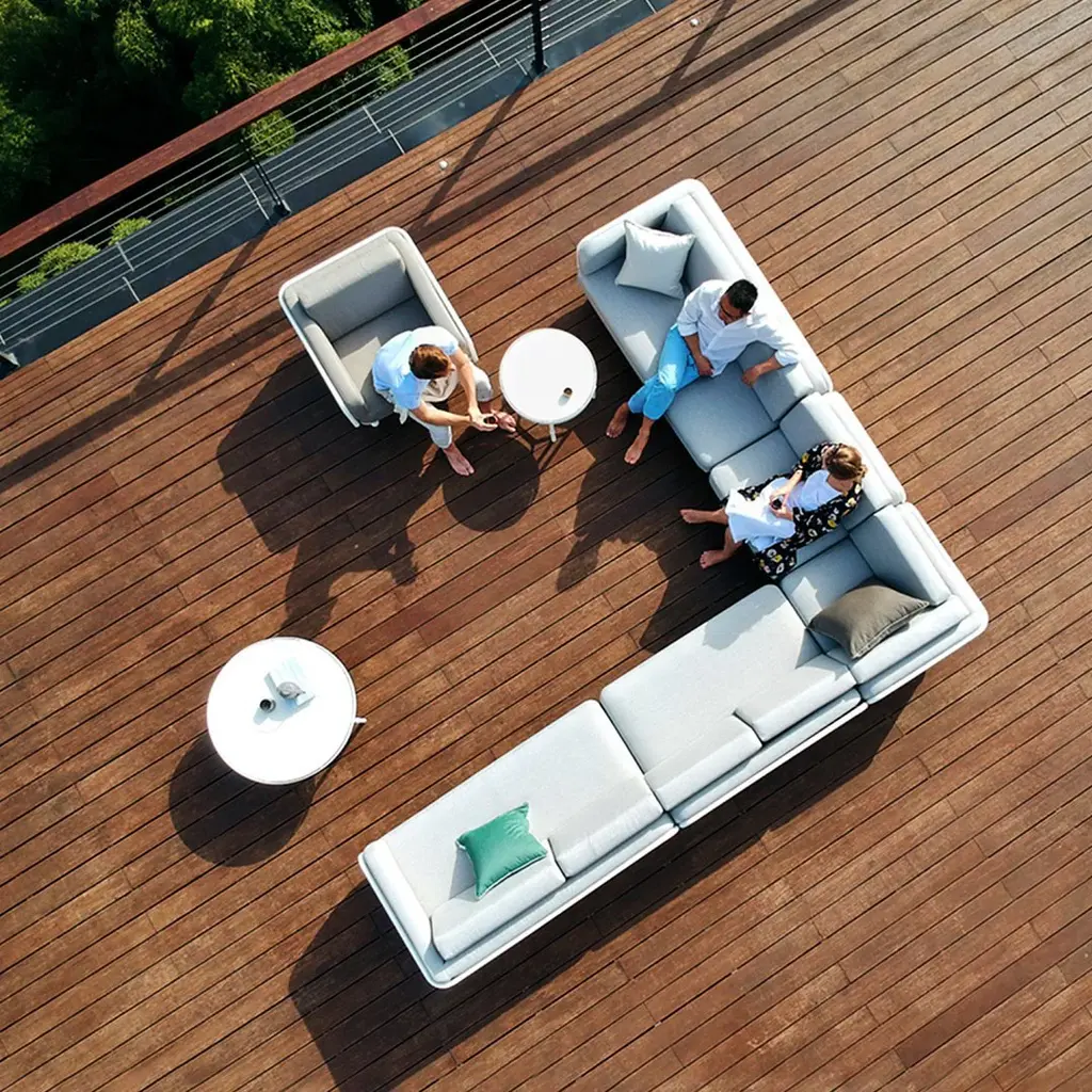 This modular lounge group is inherently versatile. With more than seven modules, a lounge chair and a separate daybed. Designed to stand out and yet blend in, no matter whether you live in the countryside or the city. The teak and the durable aluminium frame ensure it can be placed in a variety of settings and still retain its good looks after years of enjoyment. To complement the lounge group, a choice of coffee tables is available with ceramic and teak tops.