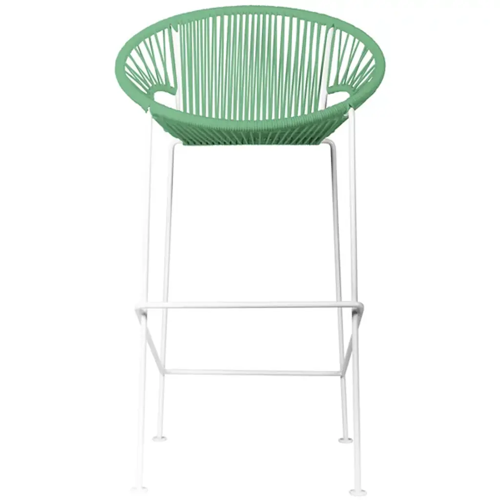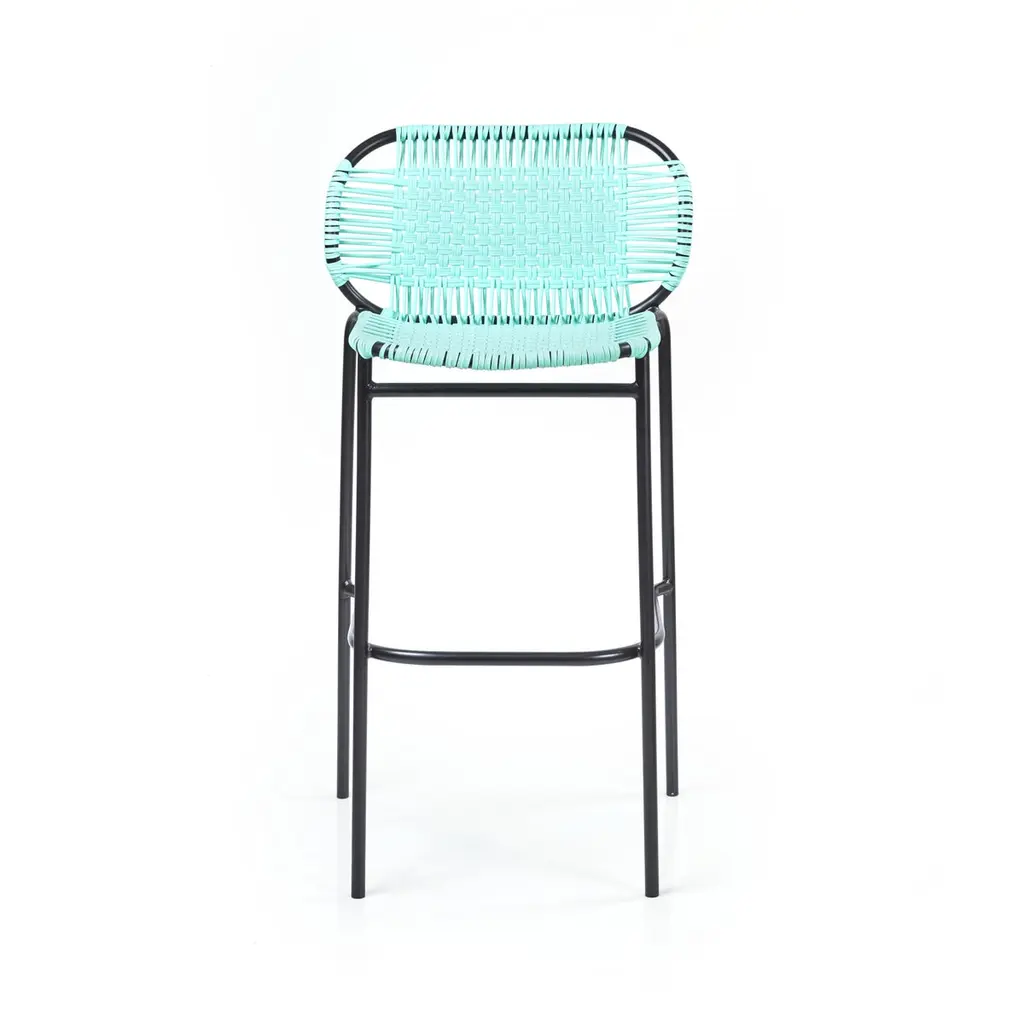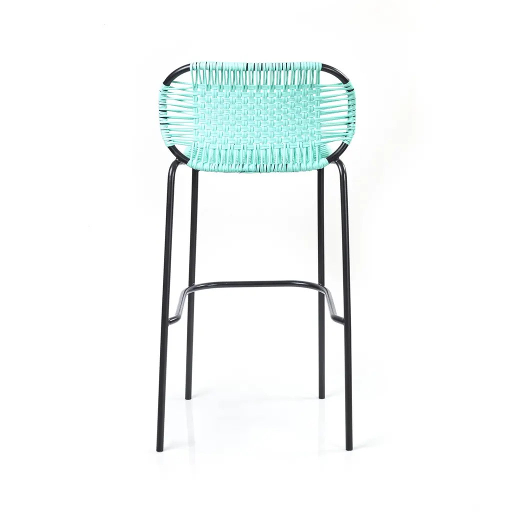 Mint Cielo bar stool by Sebastian HerknerMaterials: Galvanized and powder-coated tubular steel. PVC strings are made from recycled plastic.Technique: Made from recycled plastic and weaved by local craftspeople in Cartagena, Colombia. Dimensions: W 52 x D 46.6 x H 101 cm Also available colors: Brown, mint/ black, black-black, olive/ menta, purple/ carne, honey/ menta.The Cielo bar stool is a light and versatile design by Sebastian Herkner. It’s ready for indoor and outdoor use and will spruce up bar counters at home or in hospitality spaces. Available in various color combinations, the stackable chair can also add personality to dining areas of restaurants or hotels. Like the daybed and lounge chairs of the collection, the colors and look are inspired by Sebastian’s visits to Colombia. There, he not only immersed himself in the culture and beauty of the country but also met the local Ames artisans and learned about their traditional weaving techniques.Each armchair is made in Santa Marta, a city on the Caribbean coast of Colombia, by local craftspeople. They weave the PVC strings, which are made from recycled plastic, around a powder-coated tubular steel frame. The weaving technique the artesanos and artesanas use are called Momposino, a traditional method known for intricate patterns. Just the preparation of all the materials takes ten days, while the production of each armchair takes three days.German designer Sebastian Herkner is a long-term collaborator of Ames and has visited Colombia multiple times to experience the country’s cities, nature and people first hand. He also visited many of the ateliers that Ames has partnered with to learn about the unique traditional crafts of Colombia's regions. A sought-after contemporary designer and recipient of many industry awards, he has worked with many international design brands, creating intriguing pieces that showcase his intuition for interesting material, color, and texture combinations.