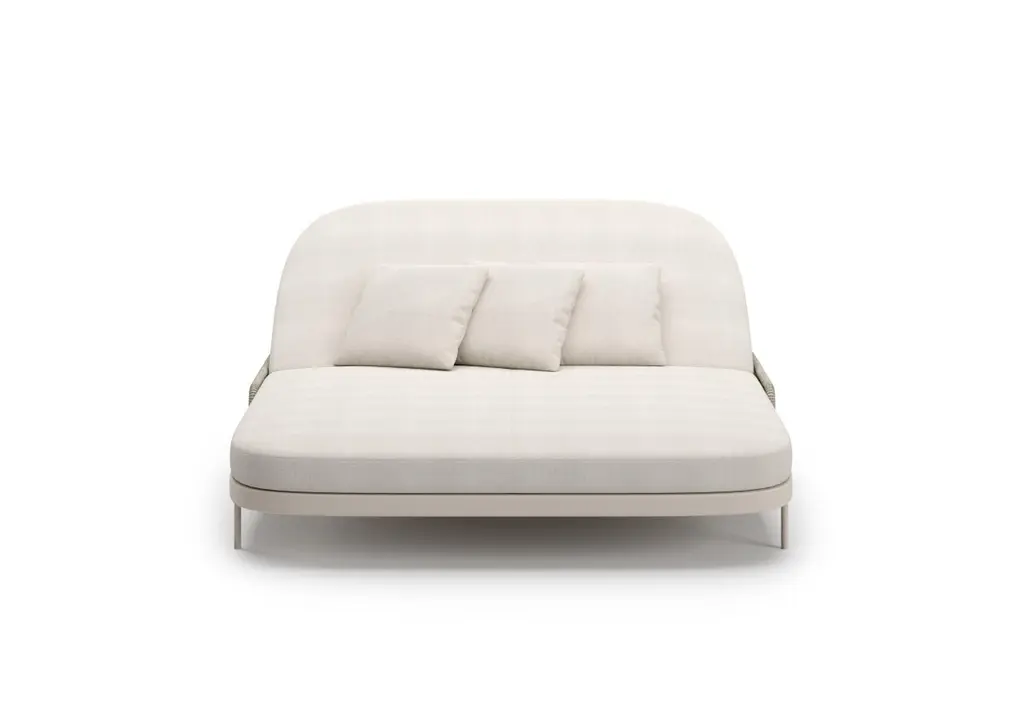 Miura Daybed by SNOCDimensions: W 205.5 x D 166 x H 22.5 cm.Materials: Acrylic Rope, Aluminium. The Miura outdoor collection is an invitation to comfort and elegance. The softly shaped, voluminous seats catch the eye with their woven shell, a distinctive feature achieved through the use of cords of different diameters. This weaving not only gives a unique look but also adds an appealing tactile sensation.Miura offers a diverse range of elements for outdoor environments, guaranteeing solutions for different needs. From lounge elements, which invite relaxation and comfort, to dining sets that combine style and functionality for convivial gatherings, up to sun loungers, each piece is designed to give character to the surrounding environment. The collection comes in two color variations: one bright and warm, suitable for environments surrounded by nature, and the other darker and more formal, perfect for creating a refined and sophisticated atmosphere.SnocSince their foundation in 2004, SNOC’s history has been interwoven with that of international design. Each chapter written with care, each product reflecting its passion. The company understands that a real story exists behind each object and behind that story, a real person desiring something more. Their ever-developing methodology focuses on defining the core of a brand and utilizing those characteristics to help nurture its soul, aiding in forging real connections. This approach , results in their unique “work in progress” style: original, versatile solutions that in their signature blend of sound, vision and design best-suit every environment and situation, arousing a range of emotions on a daily basis as well as standing the test of time.Driven by functional research, an inclusive project and product culture, and deep care for the environment, we exist as the timeless yet present essence of outdoor furniture design elevating private and public space a like with thoughtfully presented, endlessly adaptive creations.