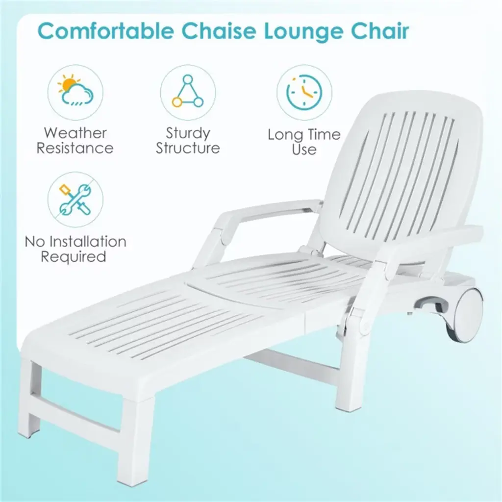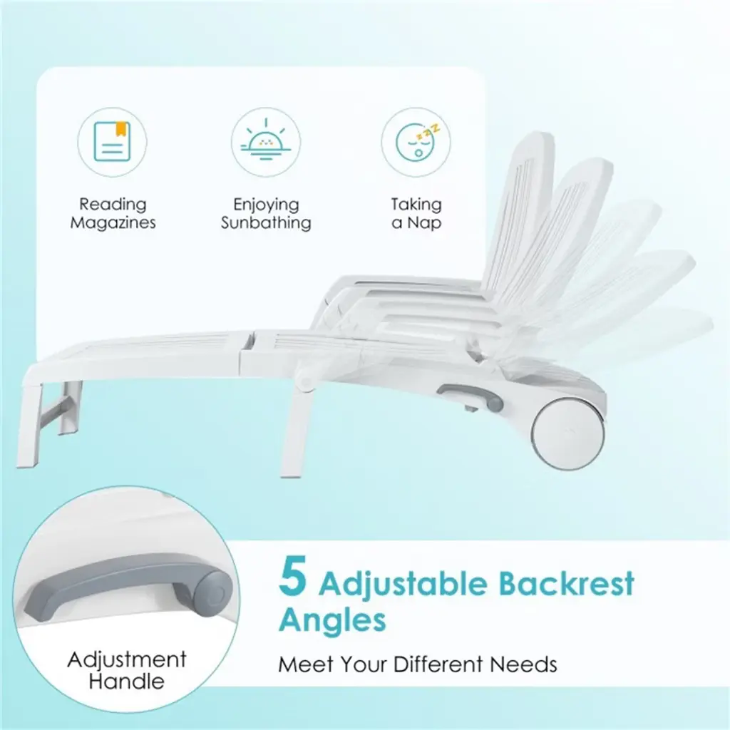 ?Multi-purpose Lounge Chair:This multi-functional chair not only allows you to enjoy the weekend in the backyard by sitting on the chair and chatting with friends but also can be taken to the swimming pool and adjusted to lie down and enjoy the sun. In short, this recliner combines beauty and practicality to beautify your living space.¡ñ?6-Angle Adjustment Design:The backrest of the chair allows you to find the angle that suits you between 90¡ã, 101¡ã, 117.5¡ã, 134¡ã, 150.5¡ã, and 167¡ã. Whether you are reading, chatting, or resting, it can bring you a comfortable leisure time. The high backrest is designed for lumbar support and reduces the burden on the lumbar spine to effectively relieve back fatigue.¡ñ?Foldable Design for Convenient Transportation:This outdoor plastic recliner can be quickly folded into a compact size within 1 minute in a few simple steps for convenient storage. What's more, with two smooth wheels, this sun recliner makes it easy for you to transfer it from outdoors to indoors. In view of the fact that you may need to store some sundries, this recliner is designed with a storage box which is in the back of the backrest to satisfy you.¡ñ?Durable PP for Weather Resistance:?Made of pp, this folding sun lounger perfectly avoids the shortcomings of perishable solid wood, especially on rainy days. The plastics chaise lounge can be perfectly adapt to various harsh outdoor weather to ensure that you can use it outdoors for a longer service time.¡ñ?Sturdy Frame for Better Bearing Capacity:?Due to the sturdy triangular frame, the plastic lounger brings excellent stability, which features a great load-bearing capacity of up to 330 lbs. So you can use it safely to enjoy your leisure time without worrying about breaking easily. The product dimension (90¡ã) is 65.5" x 29" x37" (L x W x H), which is spacious enough to sit.