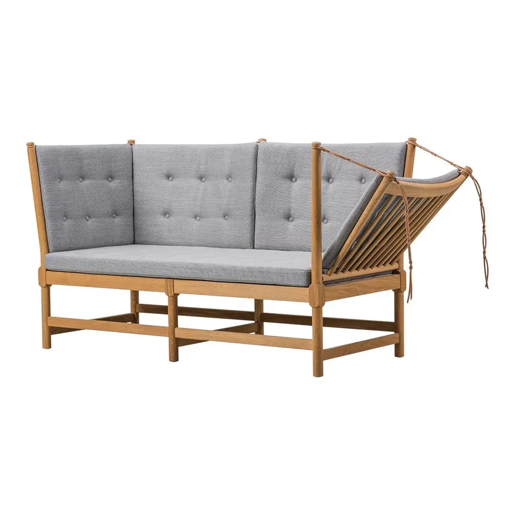 The Mogensen Spoke-back Sofa designed by Borge Mogensen in 1945 as a daybed and chaise lounge hybrid, with a hinged side. The exposed construction was too sophisticated for modest post-war culture and the sofa did not go into production until 1962.