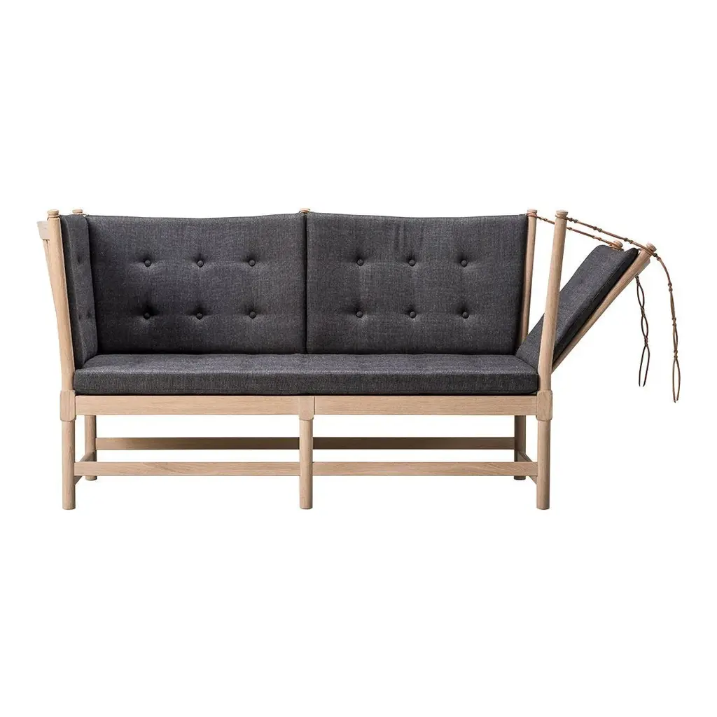 The Mogensen Spoke-back Sofa designed by Borge Mogensen in 1945 as a daybed and chaise lounge hybrid, with a hinged side. The exposed construction was too sophisticated for modest post-war culture and the sofa did not go into production until 1962.