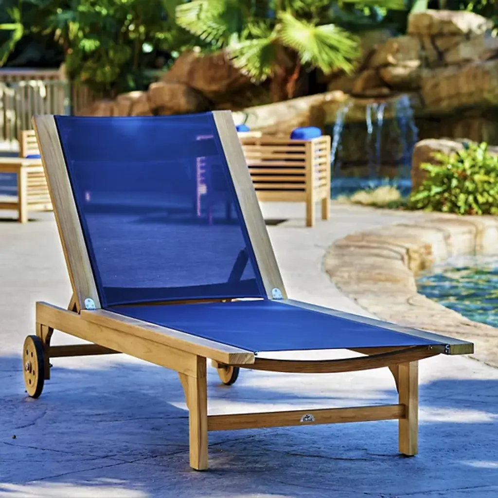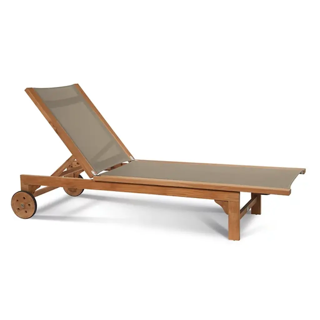 Take in the beauty of your outdoor patio with the Montauk Outdoor Sunlounger from HiTeak Furniture. Made of natural teak wood throughout, this piece expresses a simple elegance that elevates the surrounding décor. Two sturdy legs with subtle curves rest on one end while a pair of wheels connect on the other end, allowing for easy transport and slight adjustments. A soft, textile material runs the length of the piece, providing comfort for hours on end.