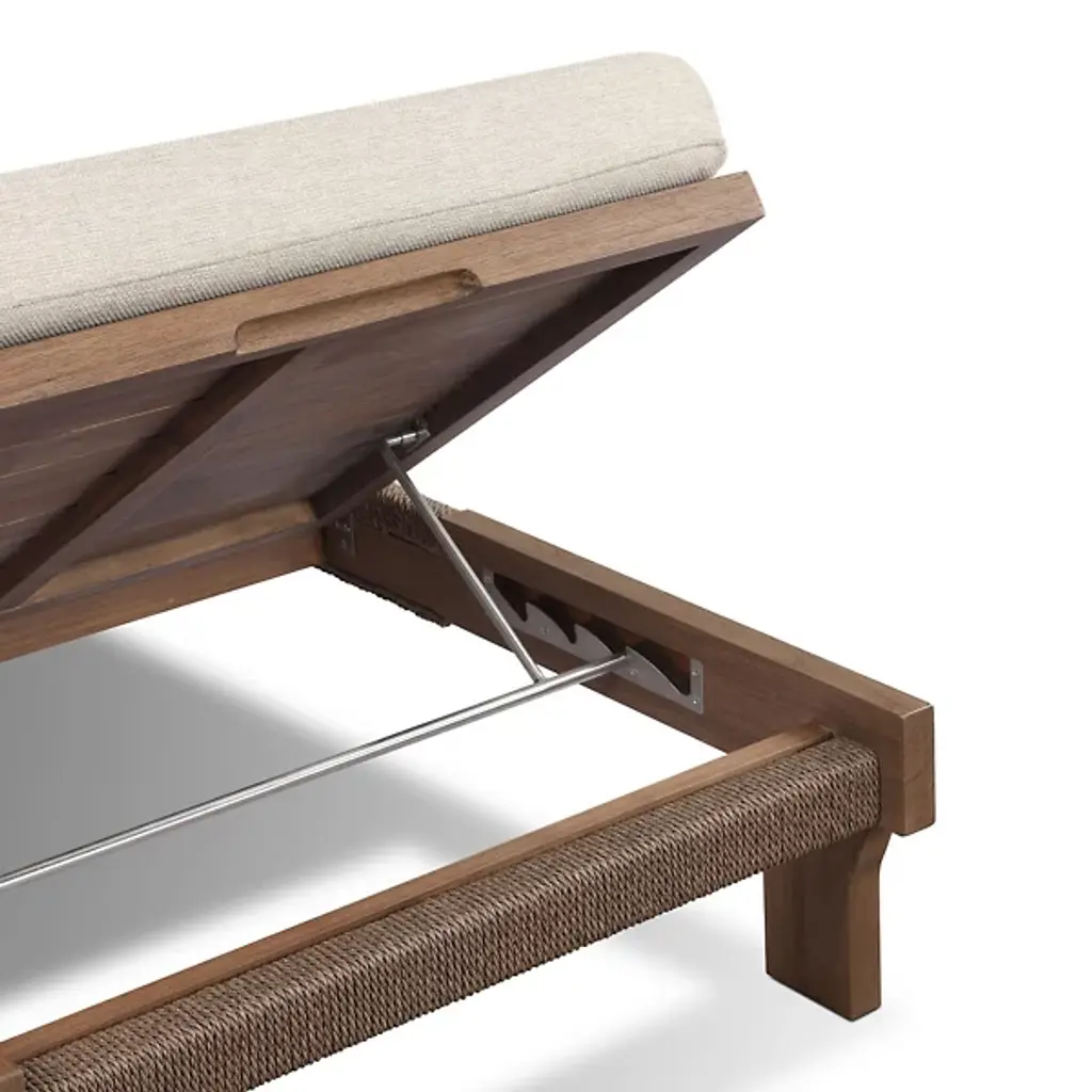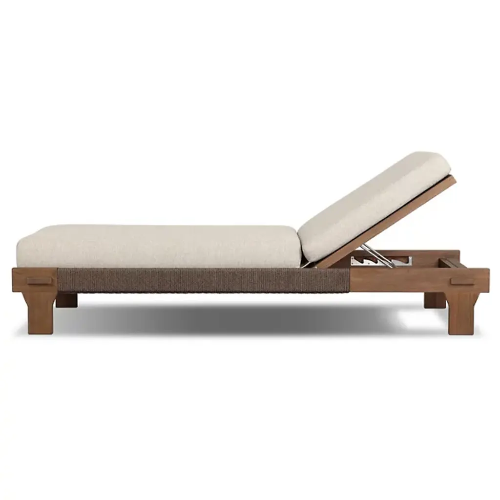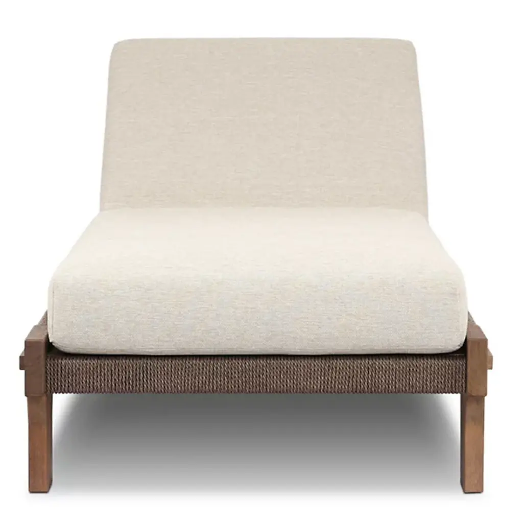 Bring global inspiration to your outdoor space with the Moxie Outdoor Chaise from Four Hands, modeled after traditional Indonesian daybeds. Crafted from FSC-certified solid teak, its expertly constructed frame features pull-through details and intricate monochromatic weaving for a refined yet relaxed look. Plush cushioning provides superior comfort, upholstered in 100% olefin for UV resistance, water repellency, and quick drying. Designed for durability, this piece should be covered or stored indoors during inclement weather and when not in use.