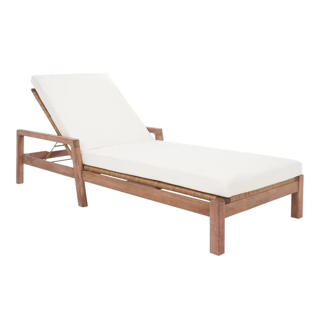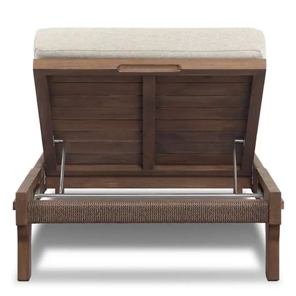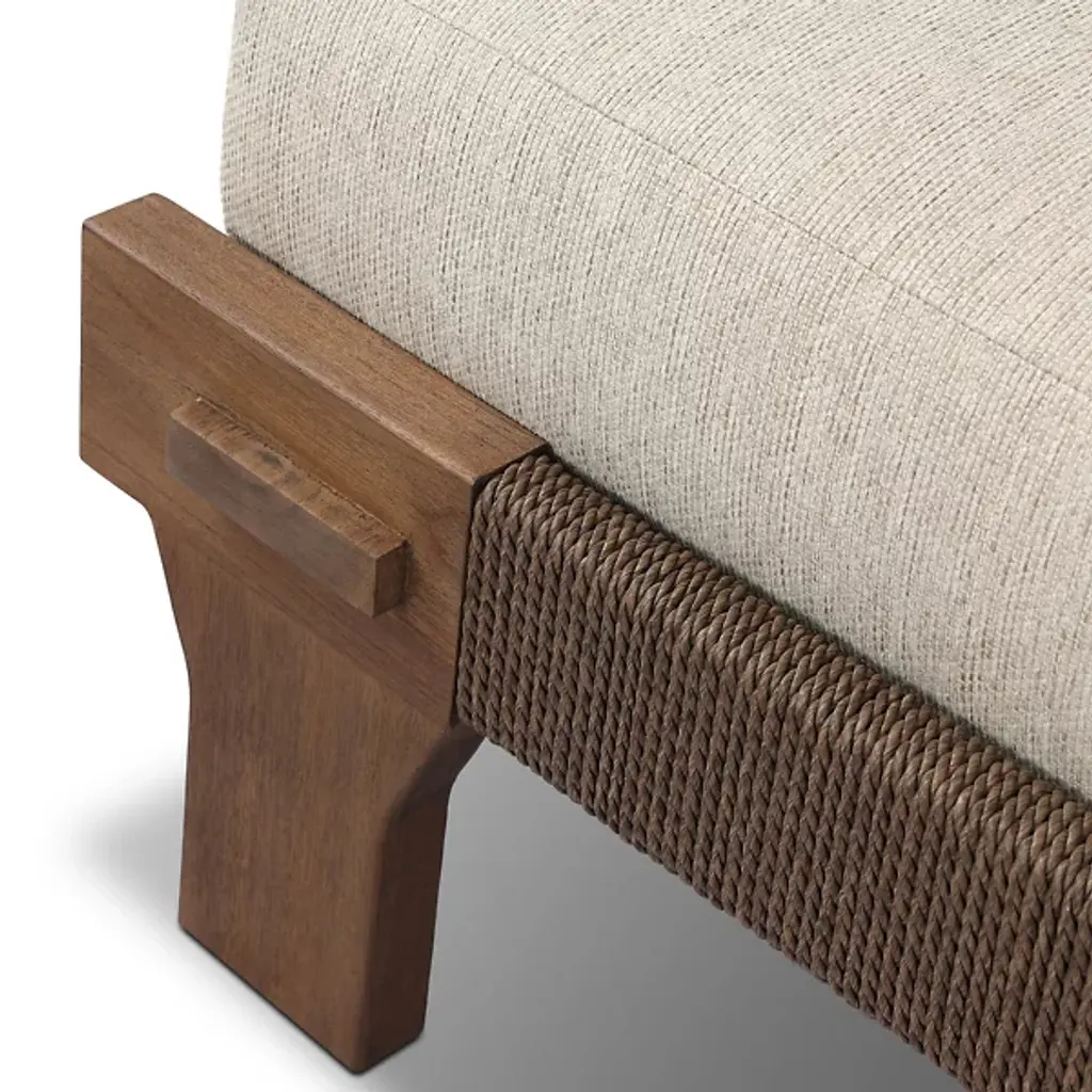 Bring global inspiration to your outdoor space with the Moxie Outdoor Chaise from Four Hands, modeled after traditional Indonesian daybeds. Crafted from FSC-certified solid teak, its expertly constructed frame features pull-through details and intricate monochromatic weaving for a refined yet relaxed look. Plush cushioning provides superior comfort, upholstered in 100% olefin for UV resistance, water repellency, and quick drying. Designed for durability, this piece should be covered or stored indoors during inclement weather and when not in use.