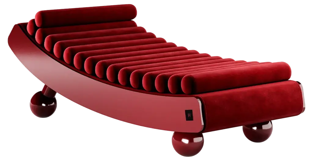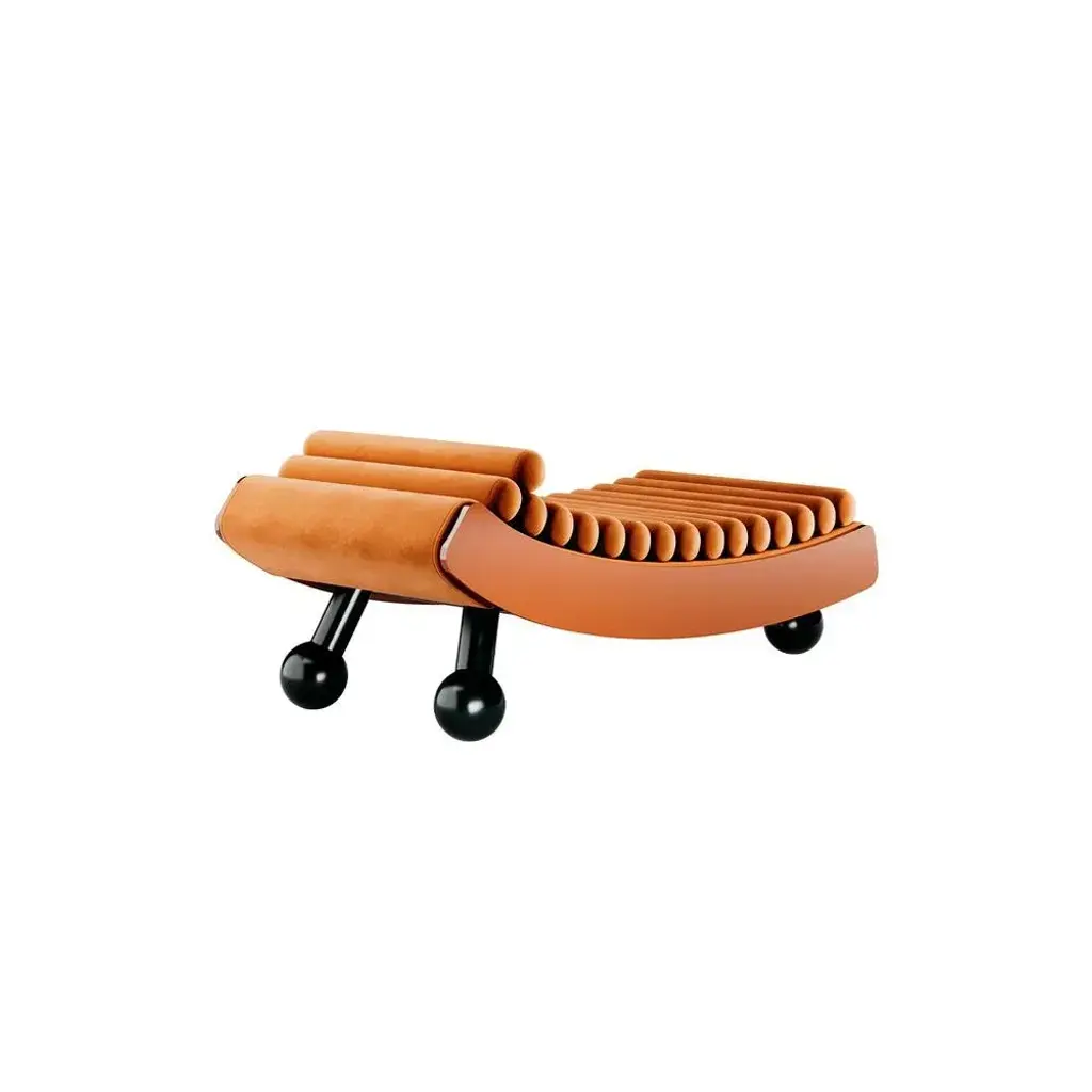 Mykonos Daybed Caramel is a bold and iconic design piece to complement a contemporary interior. The curvy and opulent shapes of the daybed will seduce you and lead you to a bohemian lifestyle. It is composed of caramel pillows running along the entire length, providing exceptional comfort. MATERIALS: Upholstered in Velvet; Structure and Feet in Black Red Lacquer.