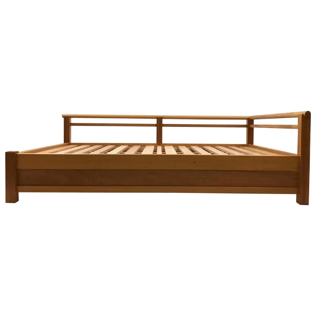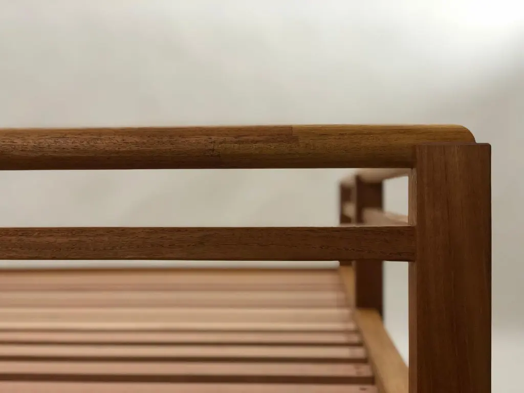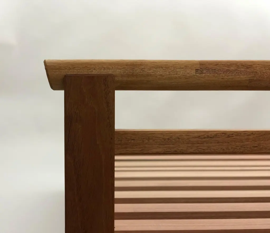 This daybed was inspired by the Uji bridge at Naiku temple in Japan. It is featured in Honduran mahogany and made for indoor/outdoor use in Honduran mahogany. This daybed is also available in oiled walnut or oiled ash. The construction of this daybed utilizes interlocking wooden joinery techniques found in temple carpentry and sashimono.Seating height is listed with 7" thick mattress.