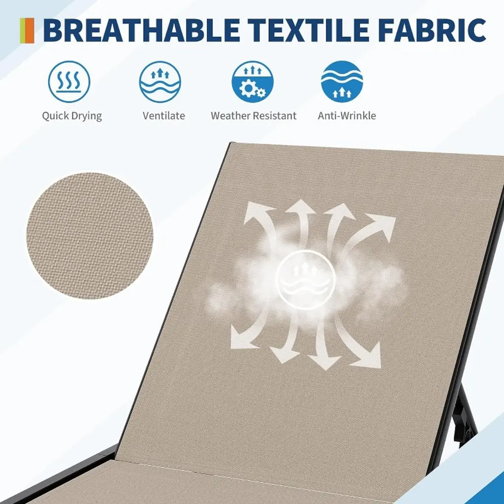 Elevate your outdoor relaxation with the Nasitip 3-Piece Poolside Lounger Set. Designed for comfort and versatility, each chaise lounge features a 5-position adjustable backrest that adapts to your preferred angle for reading, napping, or sunbathing. Made with breathable Textilene fabric, these lounge chairs resist fading, dry quickly, and stay cool under the sun. The lightweight stainless steel frame includes two rear wheels for easy movement, while the included matching side table completes your poolside or patio setup. With a weight capacity of 350 lbs per chair and a stylish khaki finish, this set combines strength, function, and style—ideal for the backyard, balcony, deck, or pool.