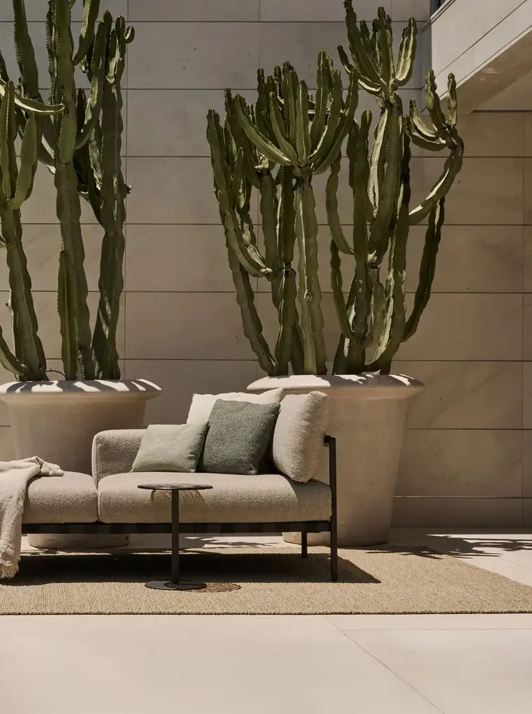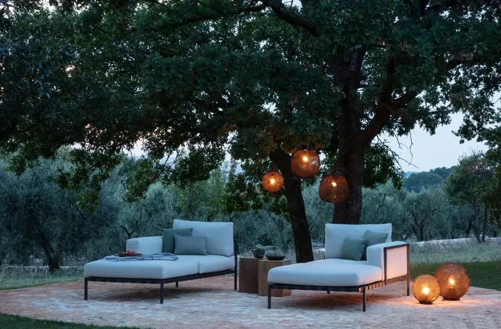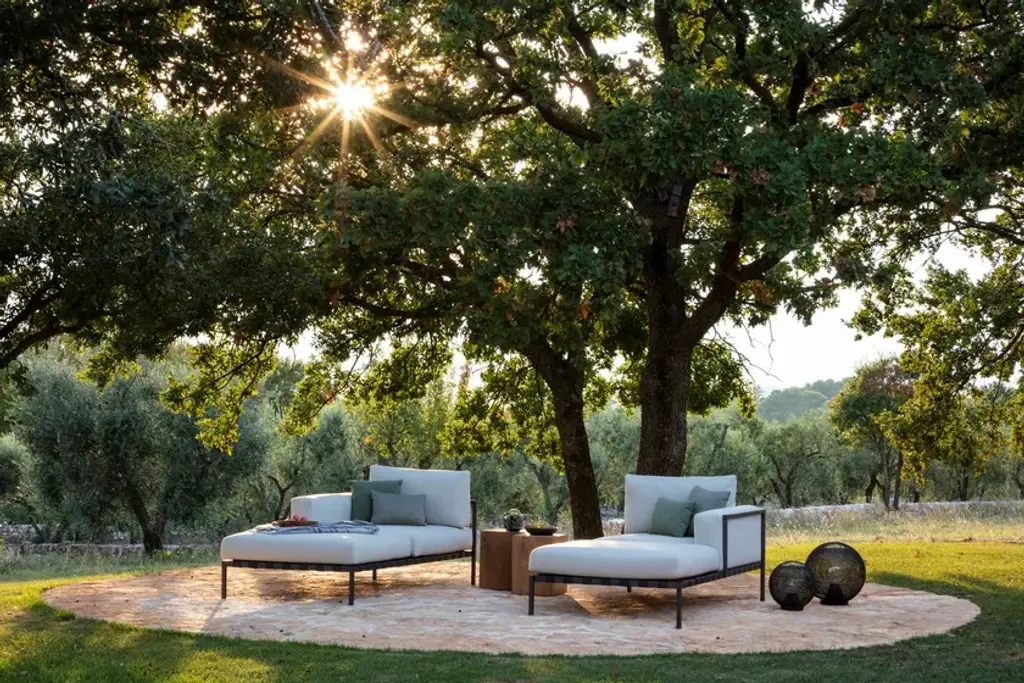 Natal Alu is an upholstered daybed in fabric. The slim frame with curved armrests contrasts with the volume of the cushions supported by a weave of wide Textilene straps. Classic and elegant, the Natal Alu Sofa daybed is a piece that fits any terrace. The aluminum frame is powder-coated with a highly durable textured lacquer, resistant to UV rays and scratches, which also gives it a beautiful matte finish. Special attention has been given to the outdoor cushions, which feature ventilated and water-repellent padding, allowing them to be left outdoors even in the rain. The seams of the covers are turned inward, making the cushion fully waterproof.The Natal Alu collection combines functionality with impeccable class and strong charisma.