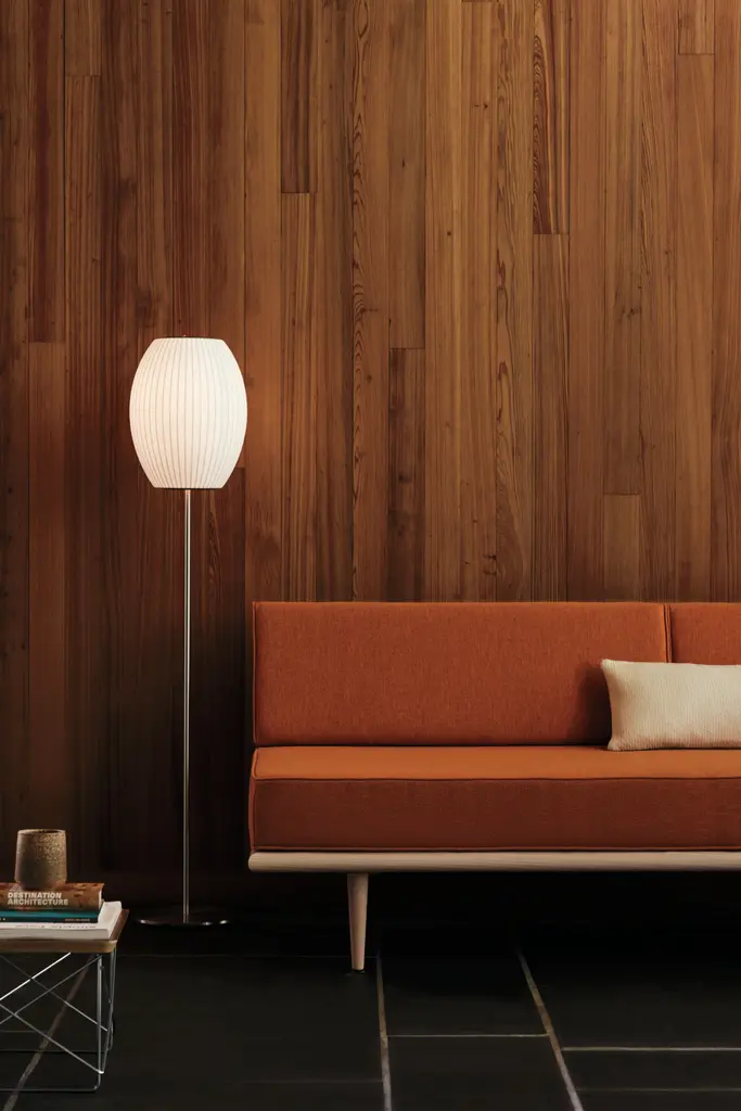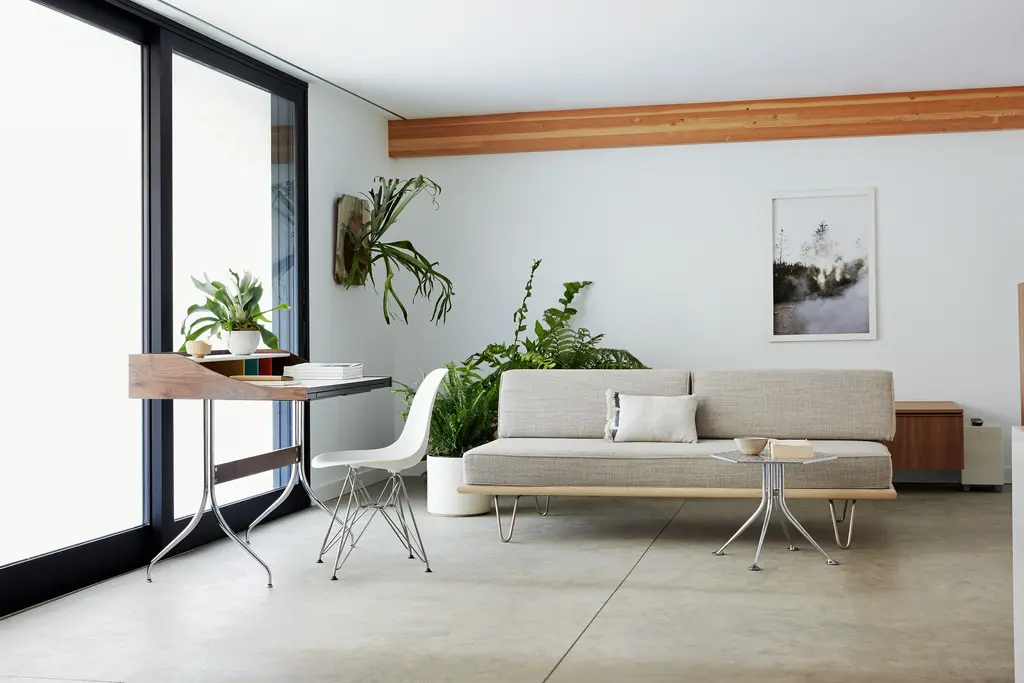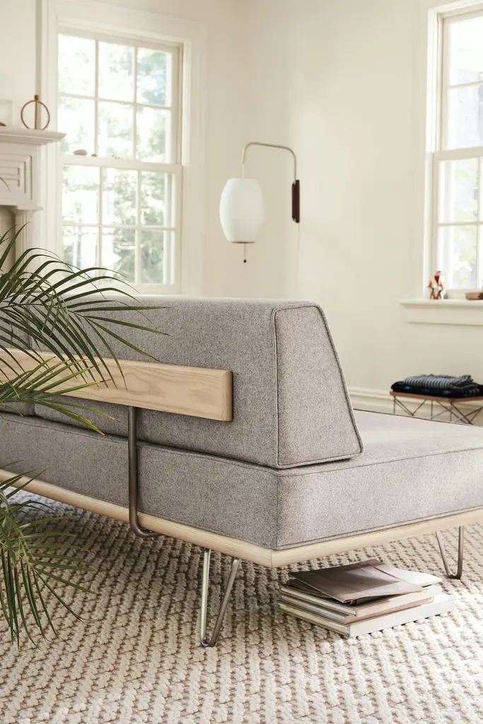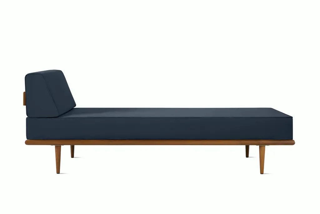 The art of reduction was one of the many areas in which Nelson excelled. The Nelson Daybed (1949) is no exception. Crafted from sustainably-sourced materials, this daybed with bolster cushions features a solid walnut or white-ash frame; it comes with matching tapered or stainless-steel hairpin legs. Three cushion figurations — standard, back, and side — are available, as are a range of upholsteries. This is the authentic Nelson Daybed with Bolsters from Herman Miller.