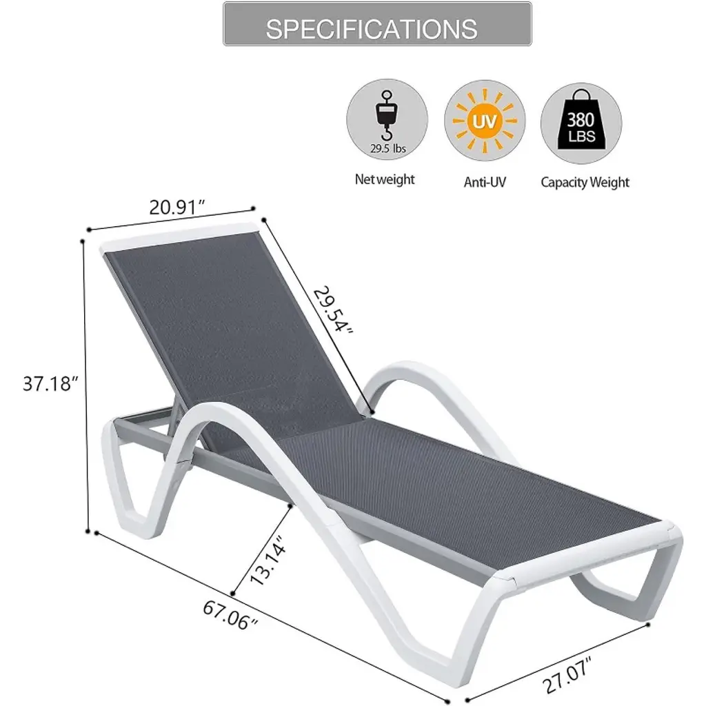 This premium aluminum chaise lounge combines durability with comfort for all your outdoor relaxation needs. The weather-resistant Textilene mesh and 5-position adjustable backrest make it ideal for poolside, lawn, or beach use. With convenient wheels for mobility, sturdy 350lb capacity frame, and comfortable armrests, this patio lounger offers both functionality and style. The quick-drying fabric and rust-proof construction ensure years of maintenance-free enjoyment in any outdoor setting.