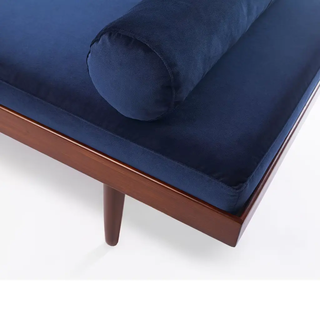 Pure volumes and prized materials define the utterly elegant silhouette of this daybed, exclusive addition to modern bedrooms, living rooms, or foyers that will enrich with its vibrant character. The streamlined structure, comprising four tapered feet, is crafted of first-rate mahogany, its intense shade of brown beautifully harmonizing with the midnight-blue of the soft velvet covering the flat, padded seat and the cylindrical side cushions.