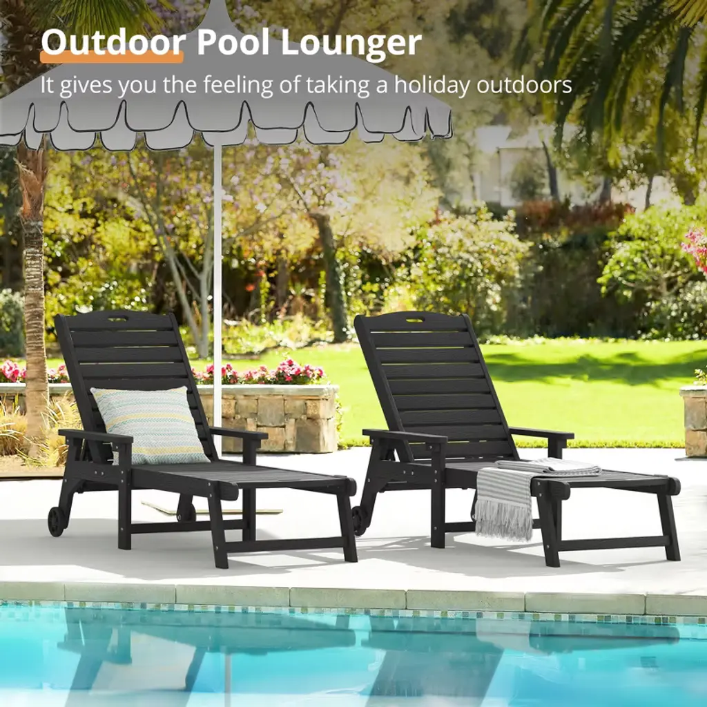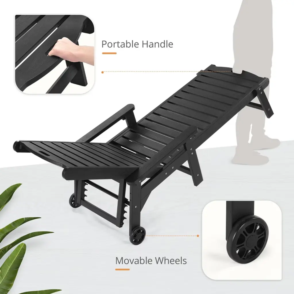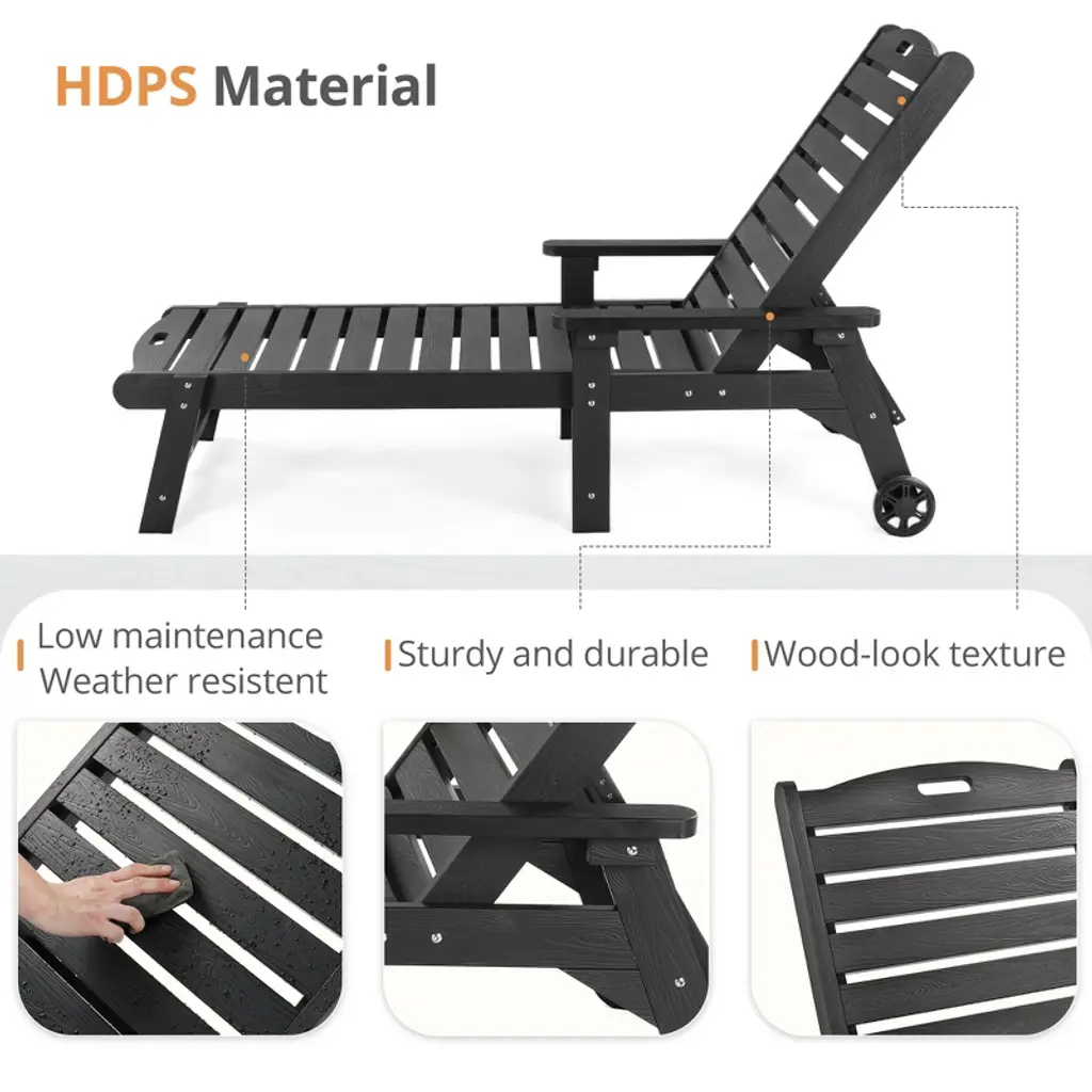 5-Position Adjustable Backrest – This chaise lounge features a 5-position reclining mechanism, perfect for reading, napping, listening to music, or simply relaxing in total comfort. Effortless Mobility – Smooth-rolling wheels allow you to easily move the lounge chair to your preferred spot—by the pool, on the beach, in the backyard, or garden—for maximum outdoor enjoyment. Durable Build – Constructed from high-quality HDPS (High-Density Polyethylene Synthetic) lumber, this outdoor lounge chair resists fading, cracking, and peeling, ensuring long-lasting performance in any weather. Quick & Easy Assembly – No tools required! Set up in just 25 minutes with included hardware and straightforward instructions. Low-Maintenance Design – Unlike traditional wood or metal loungers, the chaise requires no sealing or special care. Its easy-to-clean surface lets you spend more time relaxing and less time maintaining.