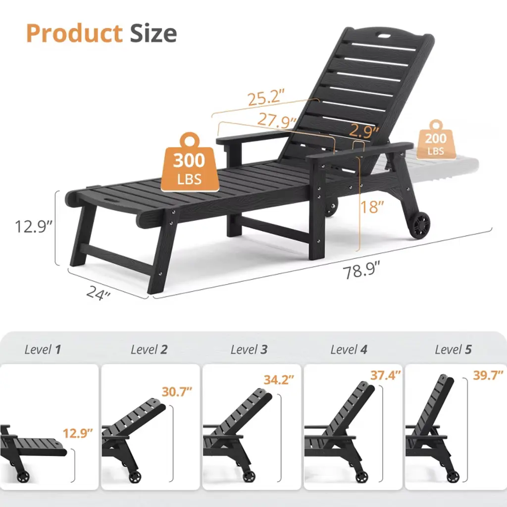 Outdoor Chaise Lounge, 79'' Oversized Hdps Chaise Lounger, 5 Positions Adjustable Lounge Chairs, Pool Lounge Chair With Wheels For Poolside, Backyard