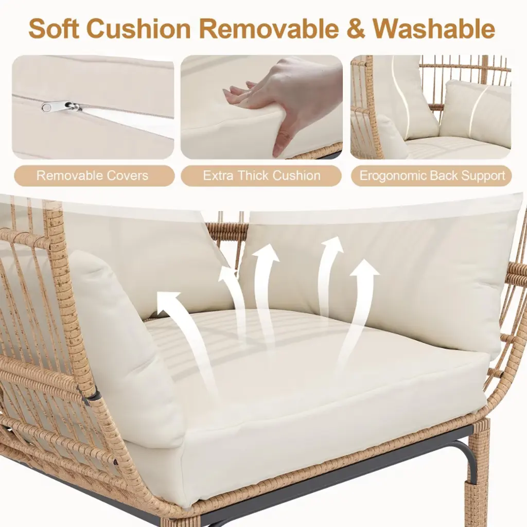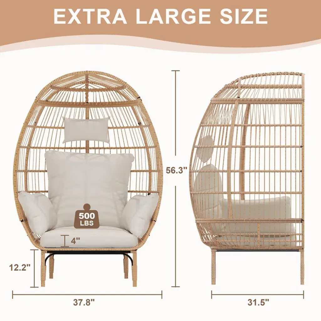 Enjoy ultimate comfort in this oversized wicker egg chair, featuring thick, washable cushions and extra headroom. Built with a sturdy steel frame and weather-resistant rattan, it's perfect for relaxing indoors or outdoors, from the living room to the patio.