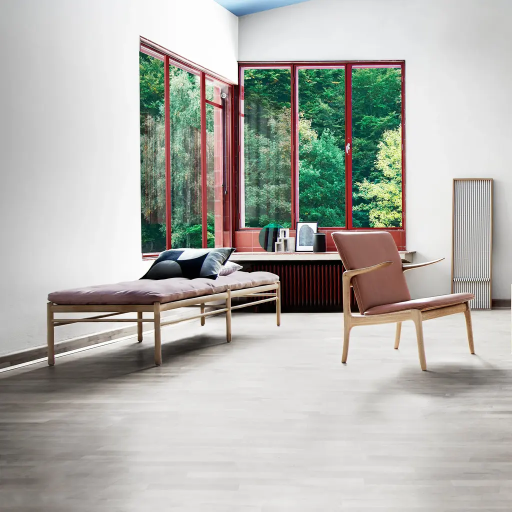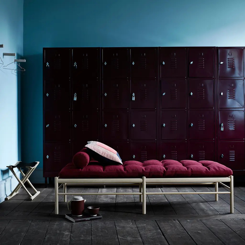 Given their timeless design and exceptional workmanship, Ole Wanscher's furnishings have become collector's items and OW150, debuting in 1963, is no exception. Affording ample comfort, it features a long single cushion filled with plush down and foam that appears to float above the solid oak frame with its sturdy cotton-webbing support. Carl Hansen & Søn's daybed offers upholstery in fabric or leather with hand-sewn button tufting and adds a matching bolster pillow.