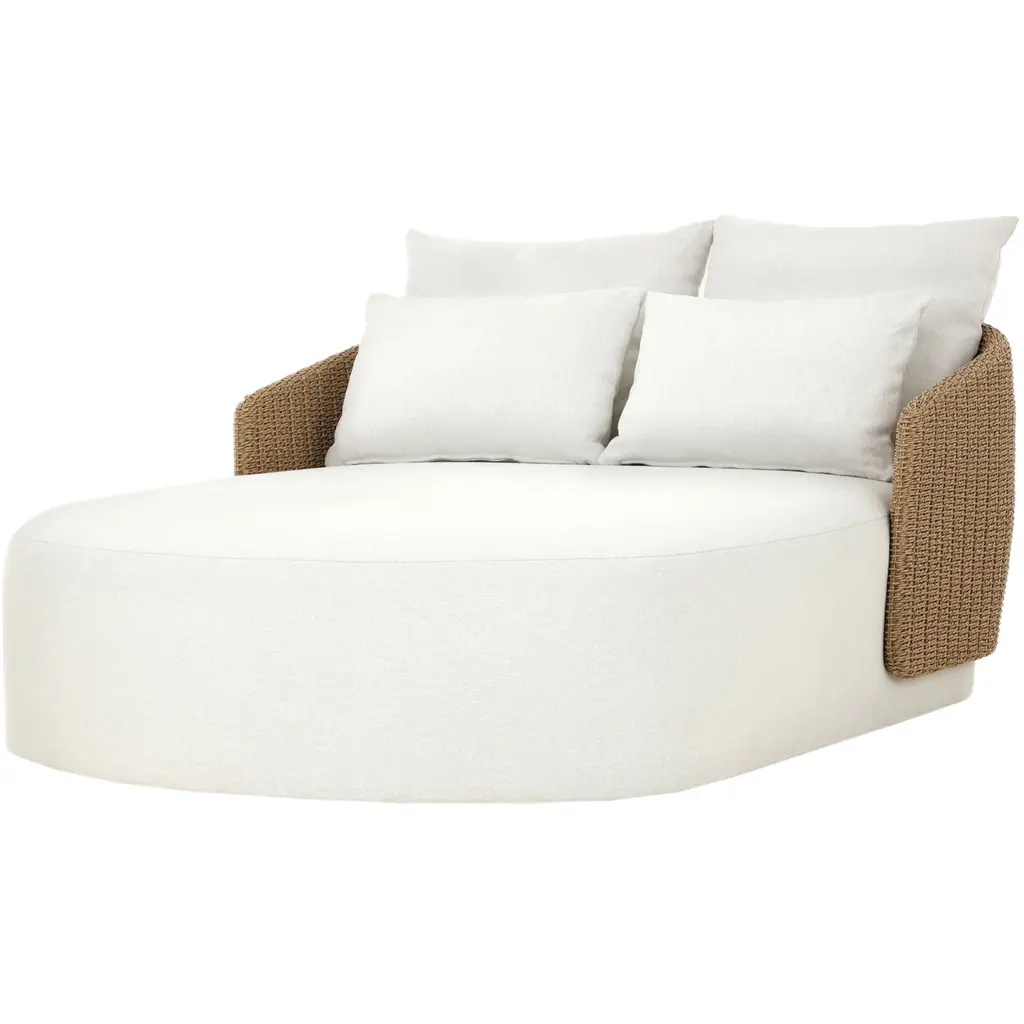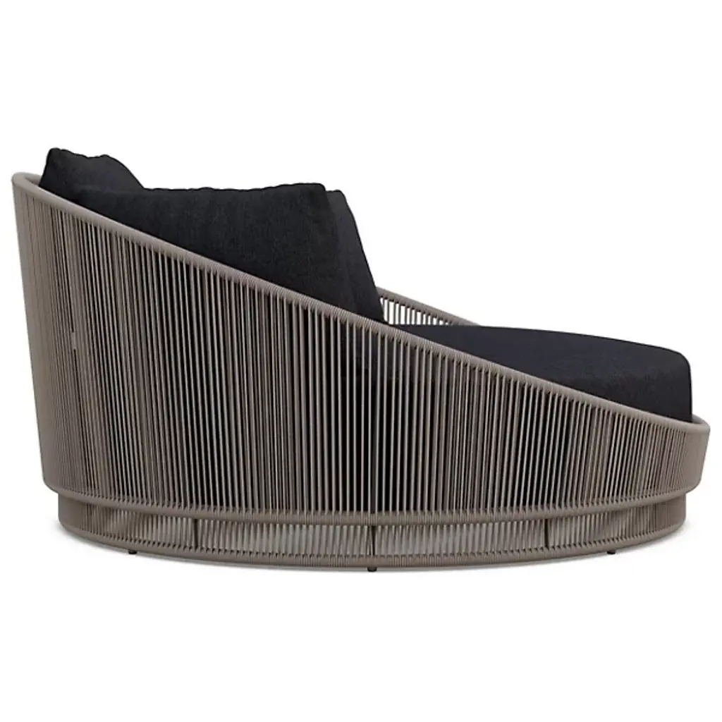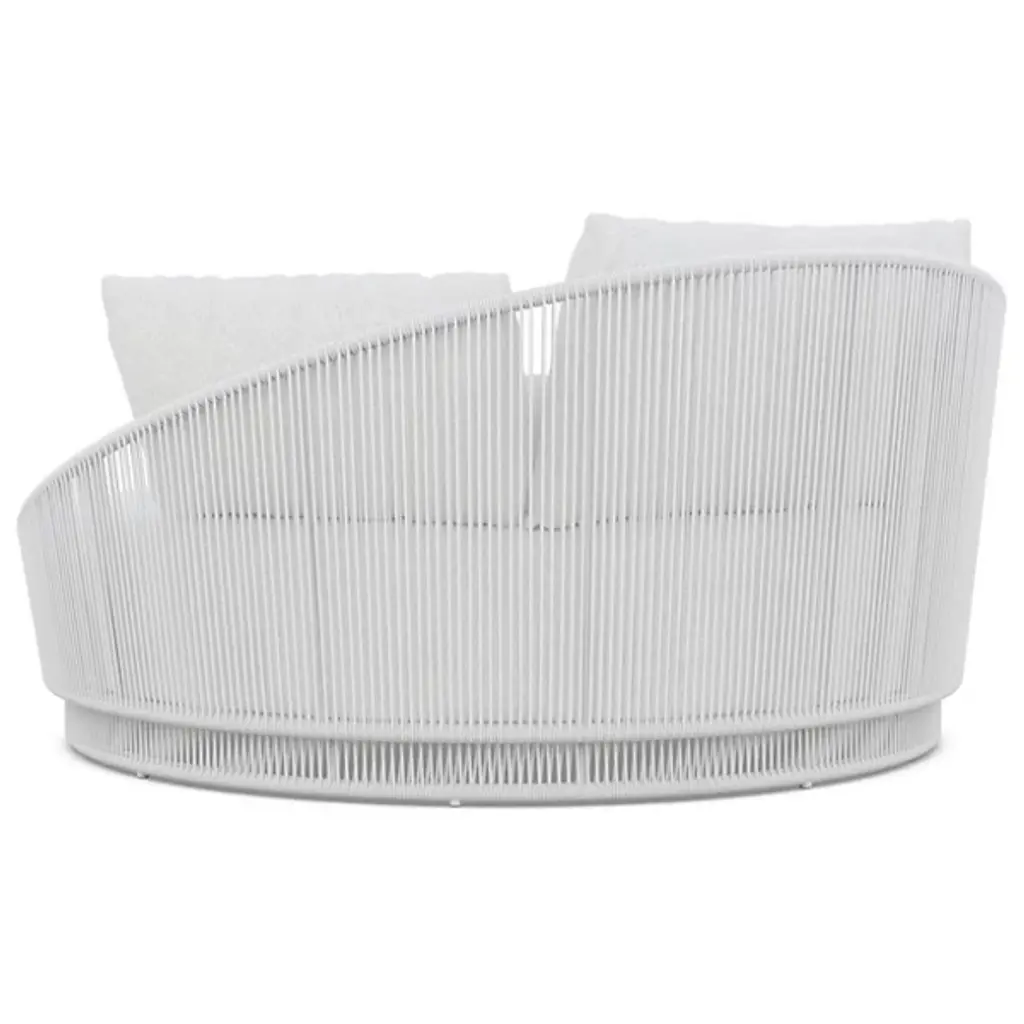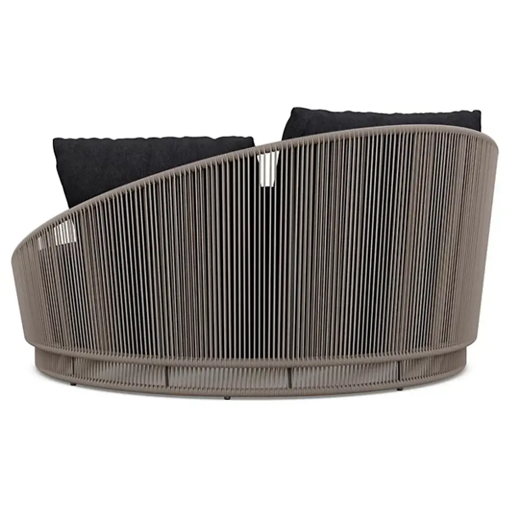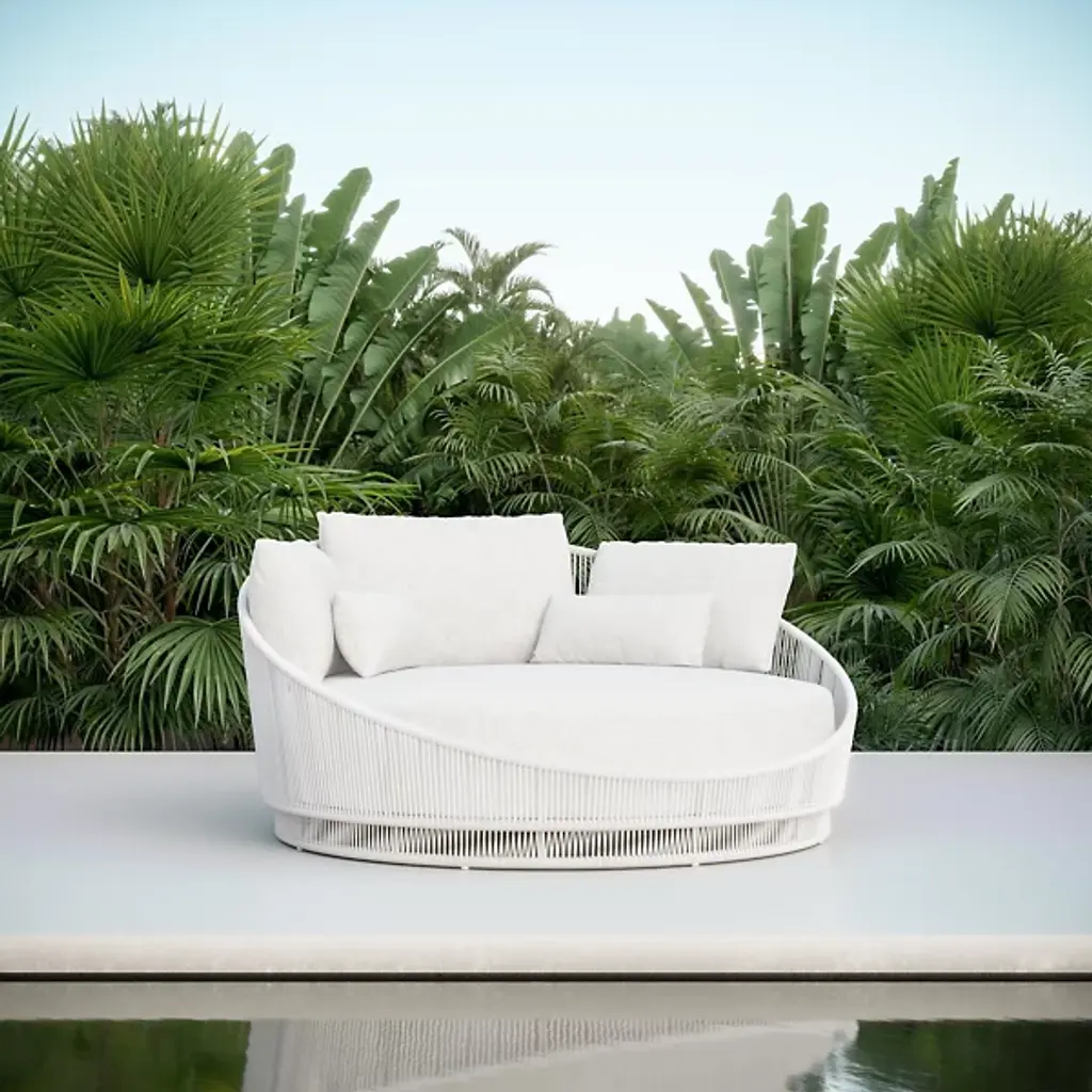 The Palma Outdoor Daybed from Azzurro Living presents a sweeping profile that embodies coastal modern aesthetics through curved lines and luxurious proportions. Innovative textelene rope construction weaves across the aluminum framework while the curved back design promotes relaxation and maintains structural integrity. Colorfast textelene materials resist fading and weather damage over extended outdoor exposure, and boldly proportioned cushions provide generous seating space covered in performance fabric engineered for harsh outdoor conditions.