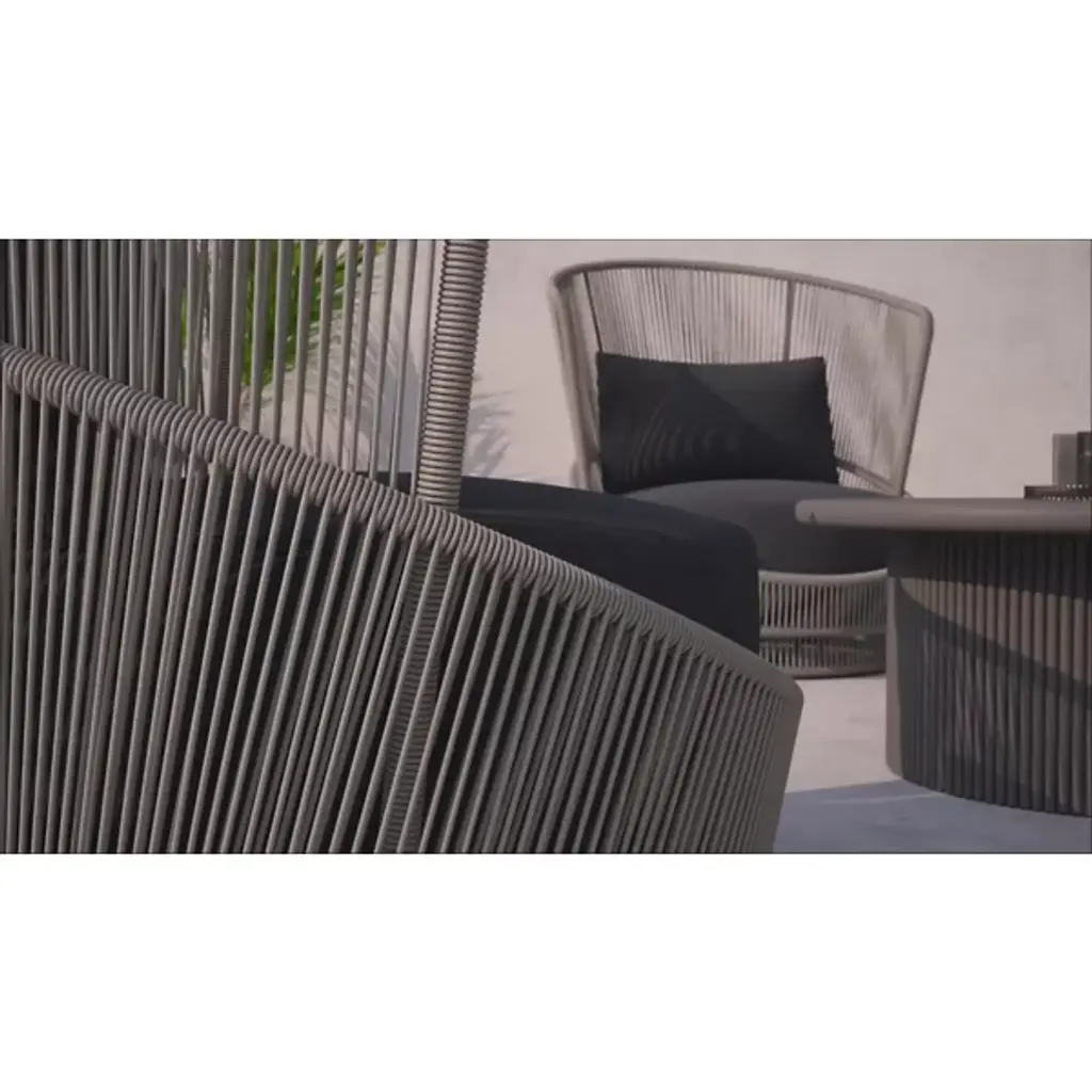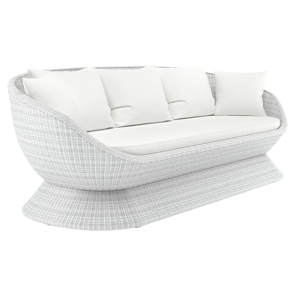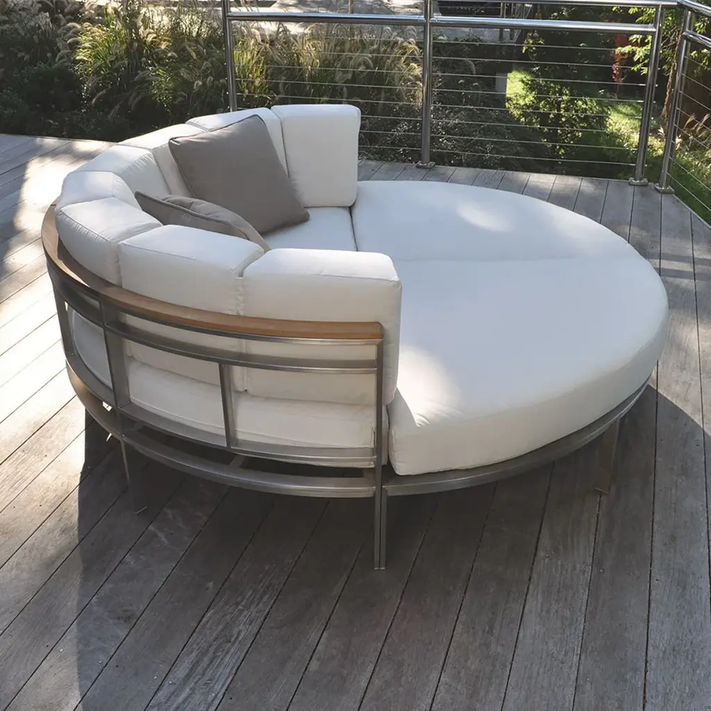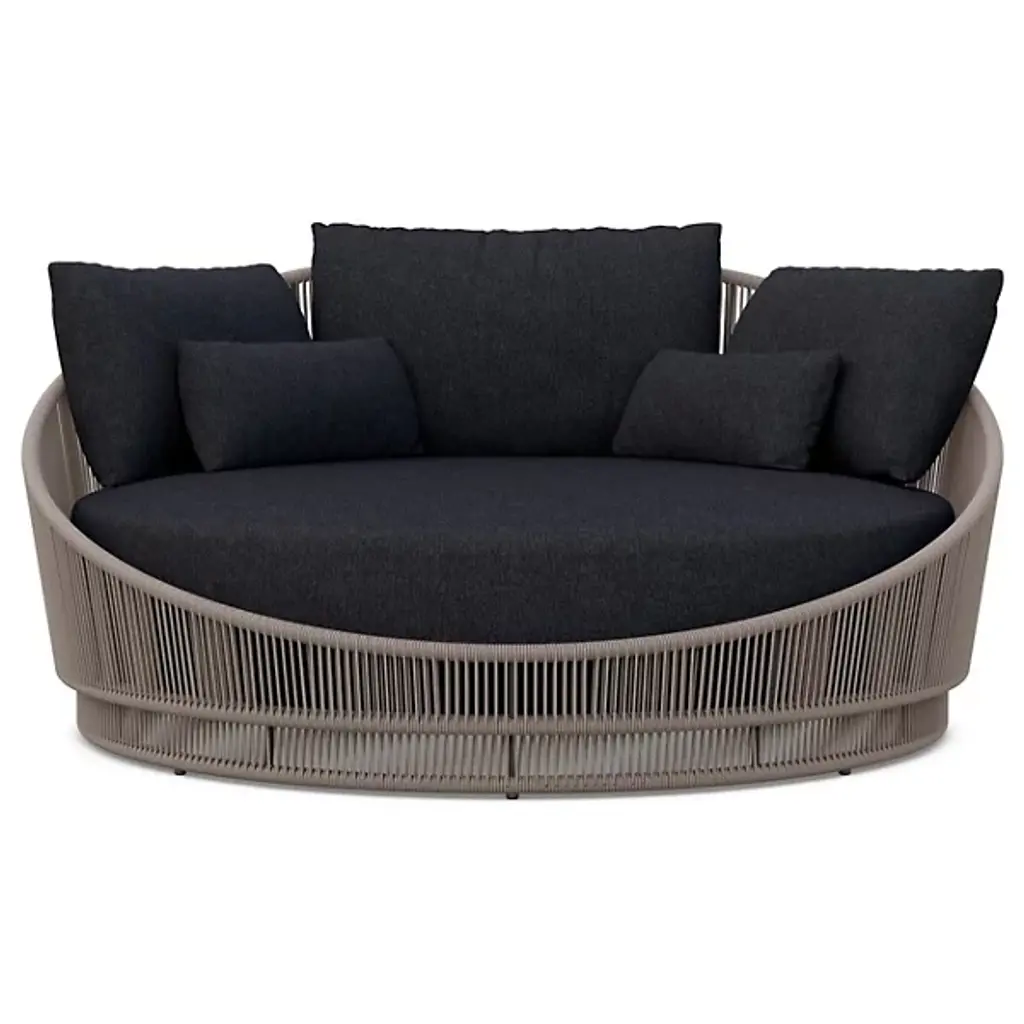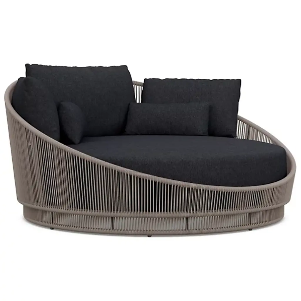 The Palma Outdoor Daybed from Azzurro Living presents a sweeping profile that embodies coastal modern aesthetics through curved lines and luxurious proportions. Innovative textelene rope construction weaves across the aluminum framework while the curved back design promotes relaxation and maintains structural integrity. Colorfast textelene materials resist fading and weather damage over extended outdoor exposure, and boldly proportioned cushions provide generous seating space covered in performance fabric engineered for harsh outdoor conditions.