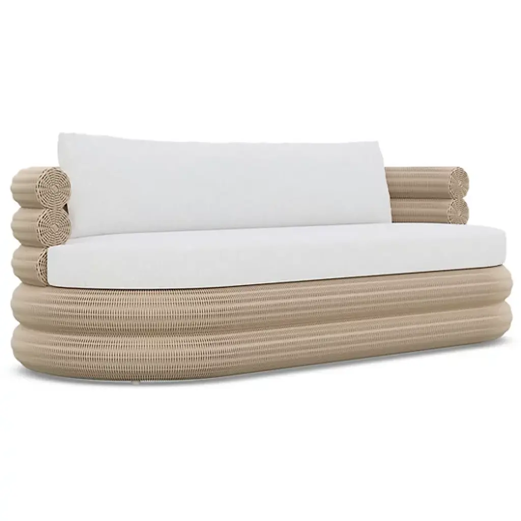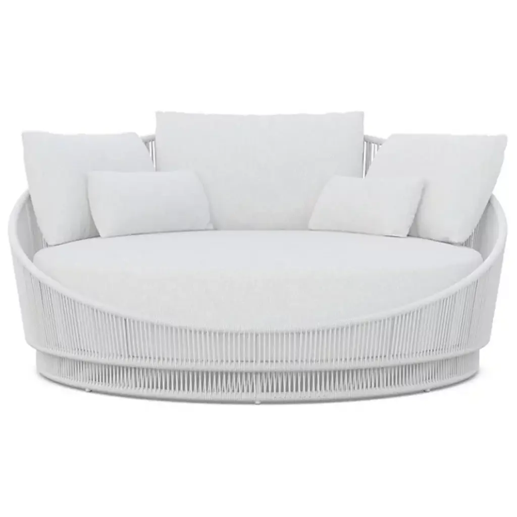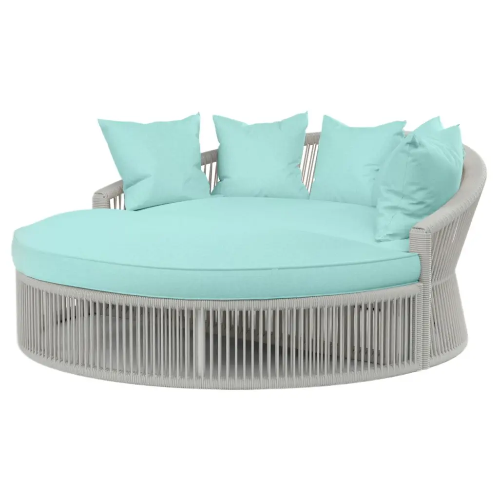The Palma Outdoor Daybed from Azzurro Living presents a sweeping profile that embodies coastal modern aesthetics through curved lines and luxurious proportions. Innovative textelene rope construction weaves across the aluminum framework while the curved back design promotes relaxation and maintains structural integrity. Colorfast textelene materials resist fading and weather damage over extended outdoor exposure, and boldly proportioned cushions provide generous seating space covered in performance fabric engineered for harsh outdoor conditions.