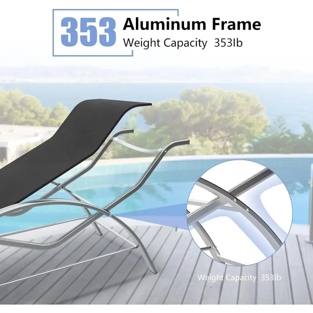 【Multi-functional Outdoor Use】:This lounge chair set includes two lounge chairs and a table,making it ideal for various settings such as gardens,terraces,decks,beaches, and poolside areas.You can relax on it while reading,playing games,or enjoying sunbathing,among other activities 【Attractive Modern Curved Design】:This outdoor lounge chair set features clean lines and smooth,body-contouring curves.The ergonomic shape effortlessly conforms to your body,providing optimal support for sunbathing or relaxing poolside 【Premium Teslin Mesh】:Crafted from durable,weather-resistant Teslin mesh,our lounge chairs offer rapid-drying performance and lightweight comfort.This breathable material keeps you cool and relaxed,even on the hottest days—ideal for sunbathing or poolside lounging 【Convenient & Stackable】:Effortless to assemble and featuring a space-saving,stackable design,this lounge chair set is perfect for patios,gardens,or beach days.Enjoy easy storage and portability 【Aluminum Frame】:Built with weatherproof,rust-resistant aluminum,this 3-piece lounge set delivers sturdy support and withstands harsh outdoor environments.Each chair holds up to 353 lbs