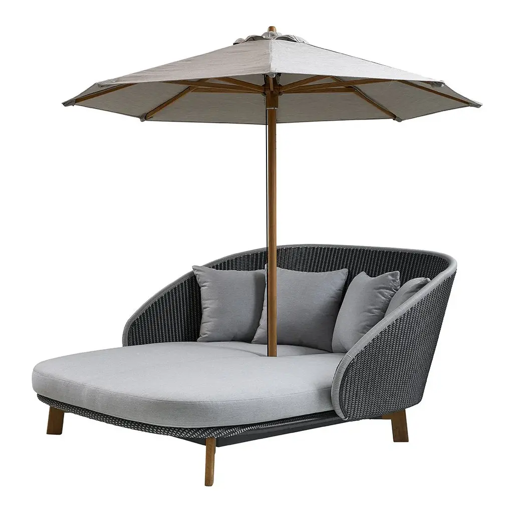 Peacock daybed is a beautiful visual furniture with comfort as the keyword. Peacock is a modern furniture designed by Foersom + Hiort-Lorenzen MDD. Peacock is available in Cane-line Weave ®, which makes Peacock ideal for outdoor use in any climate as it is temperature and UV-resistant. It comes with a cushion set + 4 large back cushions (60x60 cm.) The Daybed cushions comes in an outstanding colour; Cane-line Nattà © light grey. The mix of two colours in the weave gives a very unique look. The Peacock Daybed comes with a small teak table, and can also be combined with our Classic parasol as an acquisition.