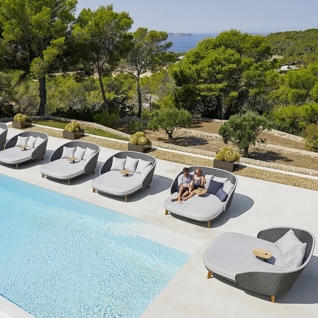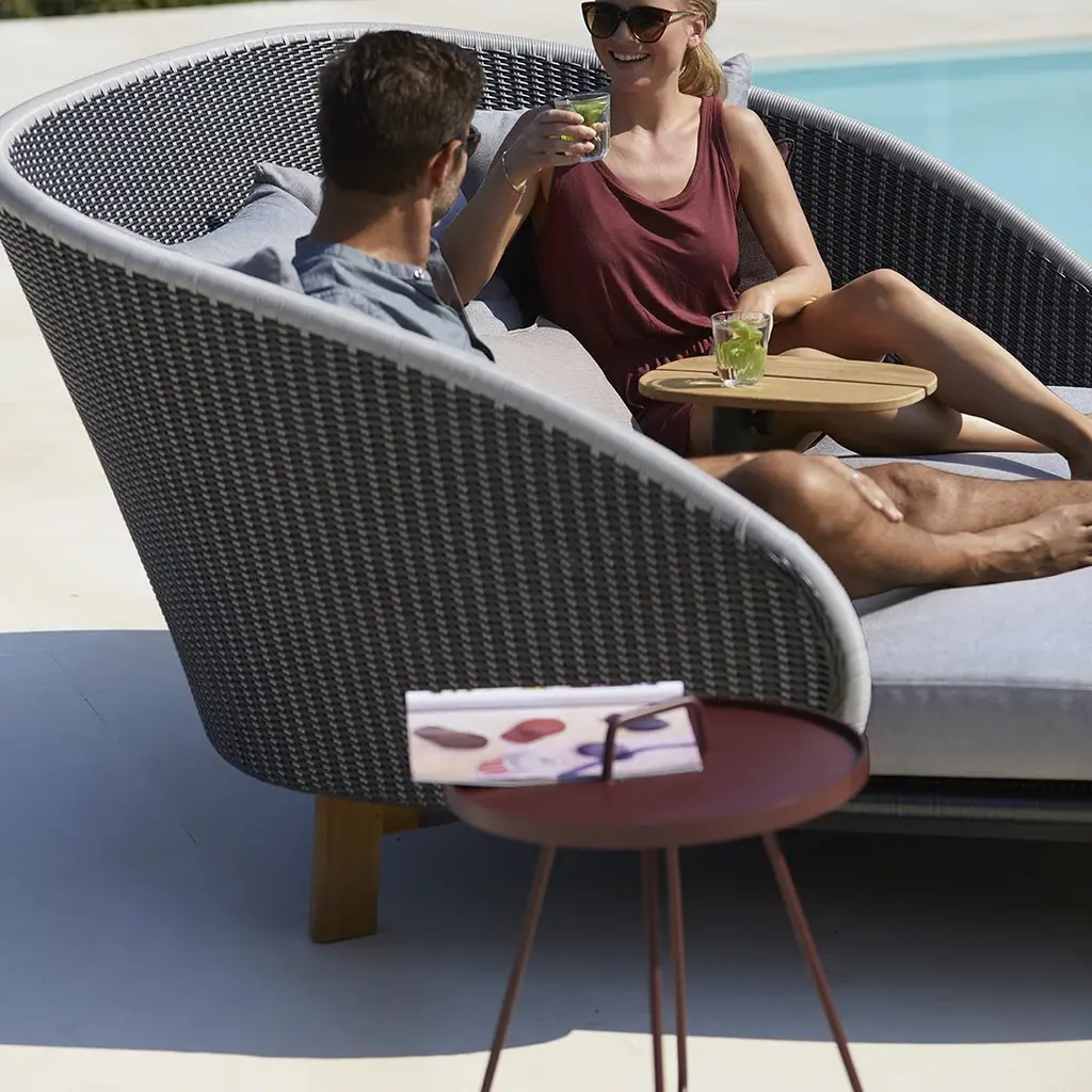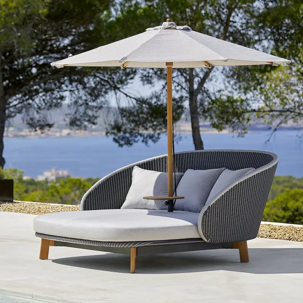 Peacock daybed is a beautiful visual furniture with comfort as the keyword. Peacock is a modern furniture designed by Foersom + Hiort-Lorenzen MDD. Peacock is available in Cane-line Weave ®, which makes Peacock ideal for outdoor use in any climate as it is temperature and UV-resistant. It comes with a cushion set + 4 large back cushions (60x60 cm.) The Daybed cushions comes in an outstanding colour; Cane-line Nattà © light grey. The mix of two colours in the weave gives a very unique look. The Peacock Daybed comes with a small teak table, and can also be combined with our Classic parasol as an acquisition.