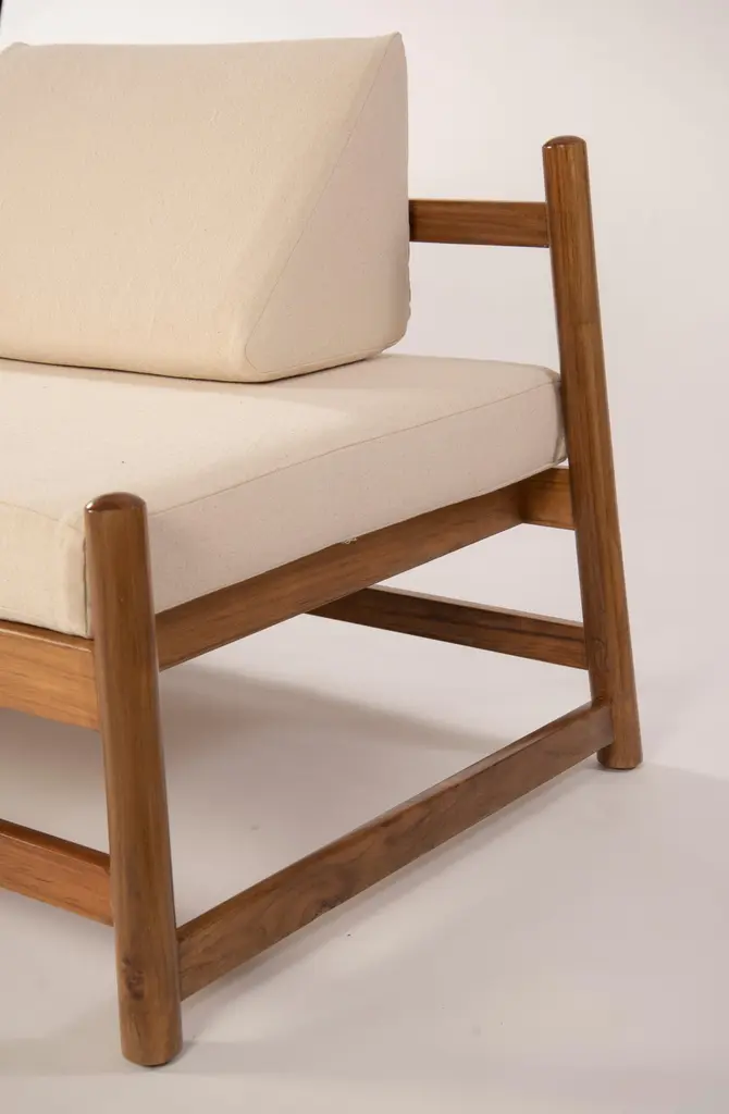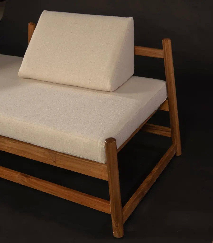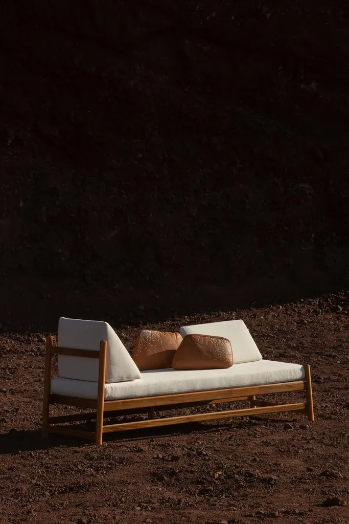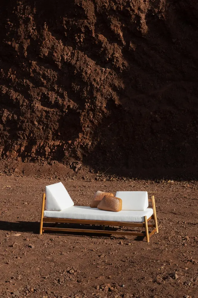 Pita daybed outdoors was created to bring you a much needed relax time. Handcrafted in teak wood and upholstered in off-white denim or sunbrella neutrals. Kick back wherever you feel like: in the patio, terrace or even up on the rooftop garden!Materials: Teak Wood and Off-White Denim or CAMPlease note: This price does not include the cayenne leather cushion embroidered by hand with pita (maguey fiber).