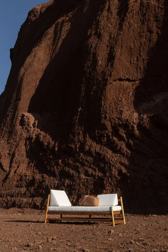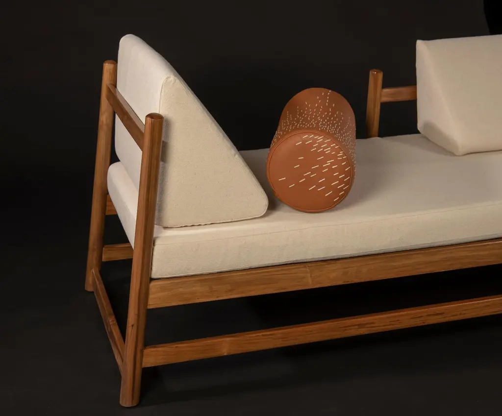 Pita daybed outdoors was created to bring you a much needed relax time. Handcrafted in teak wood and upholstered in Sunbrella color Sailcloth Shell Kick back wherever you feel like: in the patio, terrace or even up on the rooftop garden!Materials: Teak Wood and SunbrellaPlease note: This price includes the cayenne leather cushion embroidered by hand with pita (maguey fiber).