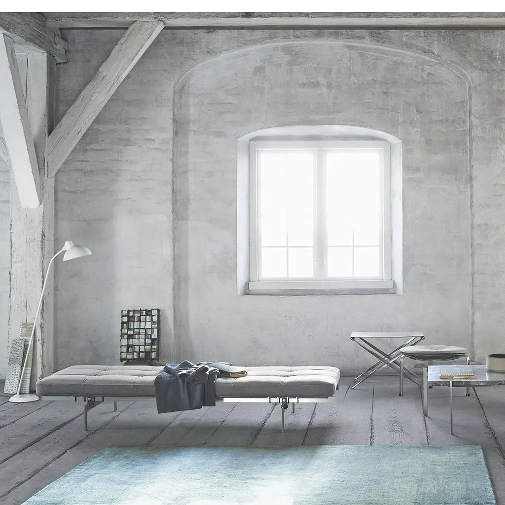 In an ongoing attempt to unite the sublime with the absolutely necessary, Poul Kjaerholm designed the PK80 daybed. The result is one of Kjaerholm's most sophisticated and iconic designs with a striking beauty. The daybed is a clear illustration of Poul Kjaerholm's method of refining historical models and distilling them down to the essence and demonstrating his superior ability to balance construction and choice of materials. The inspiration for the daybed came from Bauhaus, which in turn, were inspired by ancient Roman couches. PK80 is upholstered in leather or canvas and rests on a painted plywood bedplate. Its frame is made of satin brushed stainless steel. The purchase of the PK80 for the galleries of the Museum of Modern Art in New York, in 2004, recognizes the daybed's natural place in furniture history.