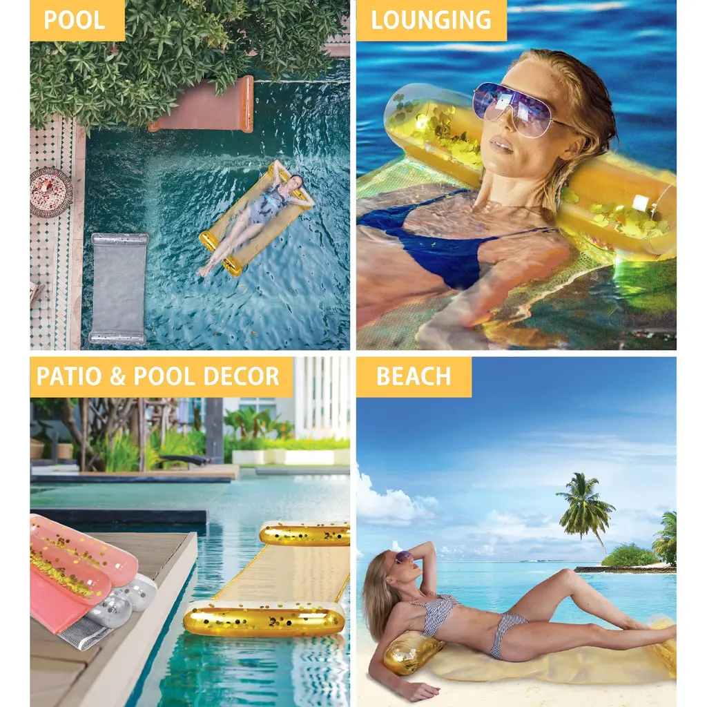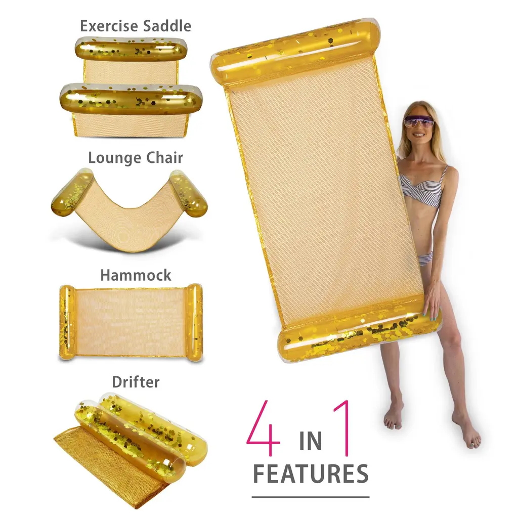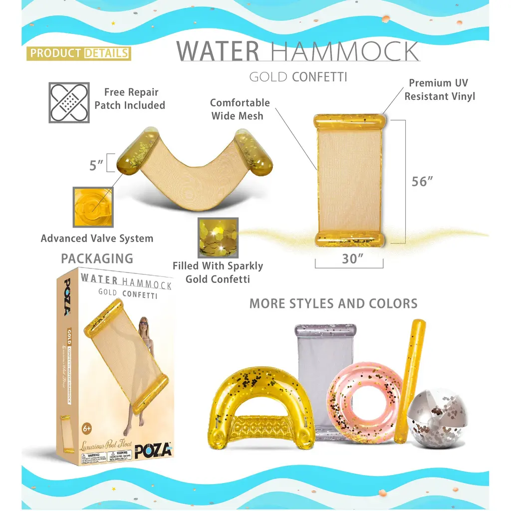 A Sparkly Confetti Filled Inflatable Gold Water Hammock will make a BIG splash for summer-filled fun. The lightweight hammock design makes the lounger a great summer accessory for your next beach or pool party. Whether you are resting or looking for a tan, lay on the float comfortably and chill in the water as you soak up the summer sun. Add cute inflatable swimming accessories to make the pool party more exciting and memorable. Use the inflatable hammock in multiple purposes for a relaxing time in the water, use it as exercise saddle, lounge chair, hammock, & drifter. The stylish water hammock is one addition to your summer wish list you cannot do without. Easy to inflate/deflate with the advanced valve system and gold confetti inside makes a magical time under the sun. The perfect summer gift of pool floater for kids and adults looking to spend their vacation in a swimming pool, lake, water park, ocean or a beach. Includes 1 POZA Gold Water Hammock filled with Gold Confetti and designed with a comfortable wide mesh lining. Use electric air pump with our advanced quick air valve system to easily inflate or deflate the floating hammock. Comes with a repair patch in the box. Gold Confetti Inflatable Floating Hammock is a heavy-duty floater made of premium quality PVC vinyl materials. Crafted with UV resistance and tear resistance to protect the inflatable hammock from color fading or cracking. Designed with eye-catchy and gold Confetti inside the tubes. Use the pool hammock floater in various fun outdoor events and activities at the beach, swimming pool, or lake. Floating confetti hammock measures 56″ x 30″ x 5″ inches. Recommended for age 6 years and up.