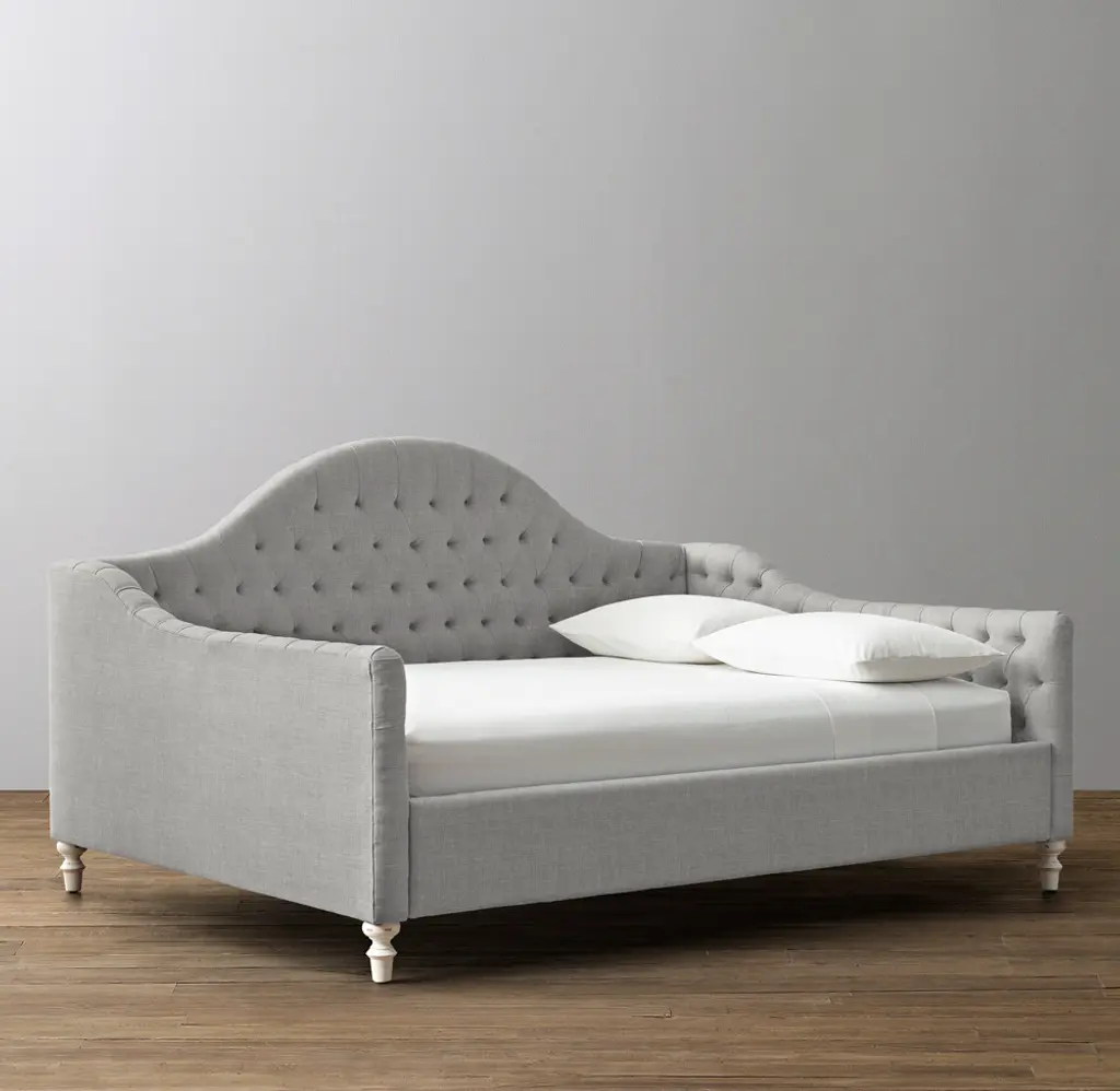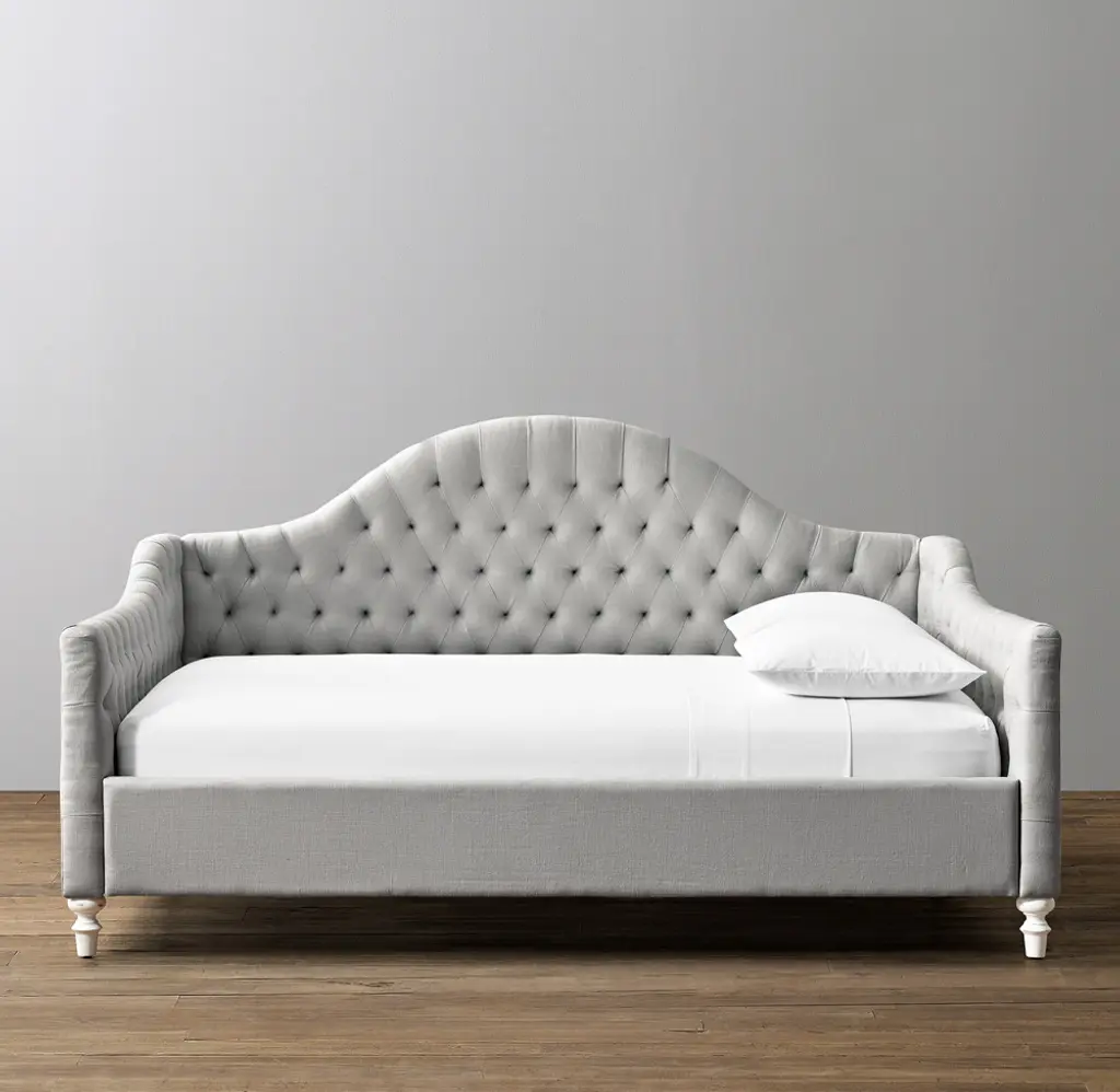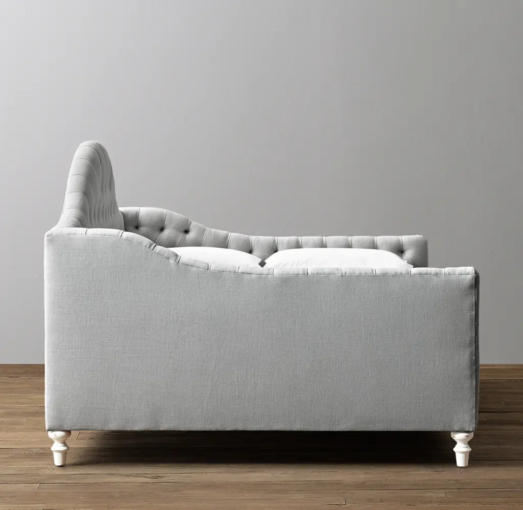 Its high camelback design gives Reese a dramatic countenance, while its delicate, turned feet lend feminine appeal. Hand-tufted upholstery softens the silhouette and ensures plenty of padding for lounging, reading and resting.