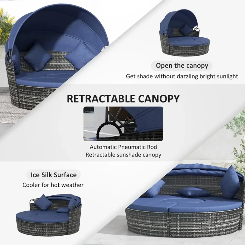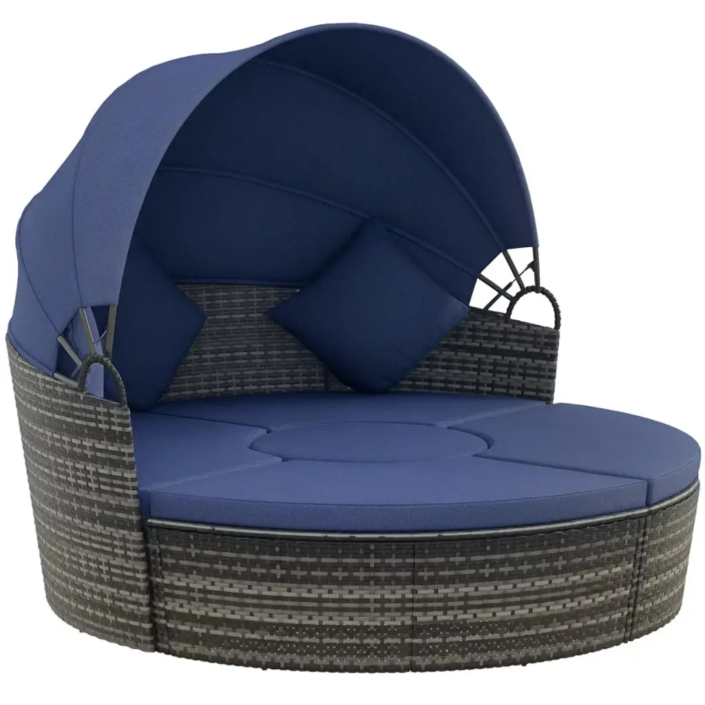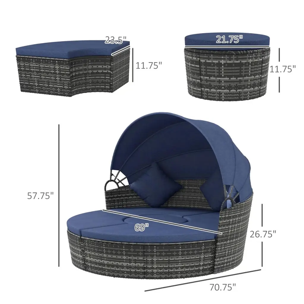 Experience ultimate relaxation with the Resenkos 4-Piece Round Convertible Daybed, a perfect blend of comfort and style for your outdoor space. This versatile set includes a sunbed with an adjustable sun canopy, a sectional sofa, 2 chairs, a table, and 3 plush pillows. Crafted from durable PE rattan, this patio wicker sofa set is ideal for any weather. Embrace the outdoors in style with our gray outdoor PE rattan patio wicker sofa set, featuring a round convertible daybed, sun canopy, sectional sofa, chairs, table, and 3 pillows. Perfect for lounging, entertaining, or simply unwinding, this set is a must-have for any outdoor enthusiast. Enhance your patio with Resenkos's top-quality outdoor PE rattan furniture, designed to withstand the elements and provide years of enjoyment. Transform your outdoor area into a serene retreat with the Resenkos 4-Piece Round Convertible Daybed and Outdoor PE Rattan Patio Wicker Sofa Set.