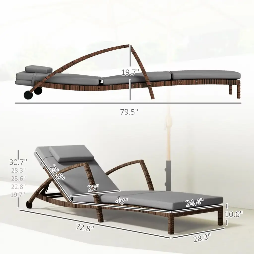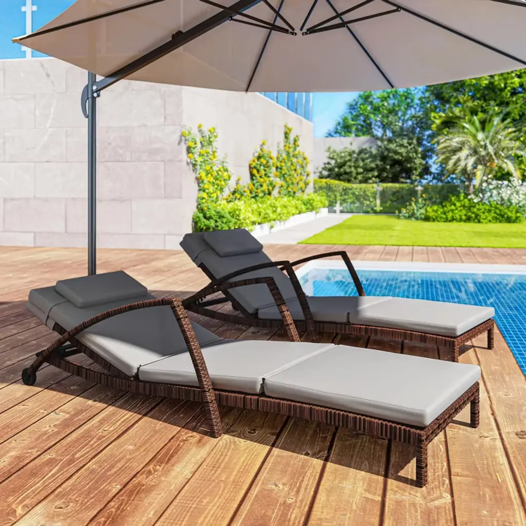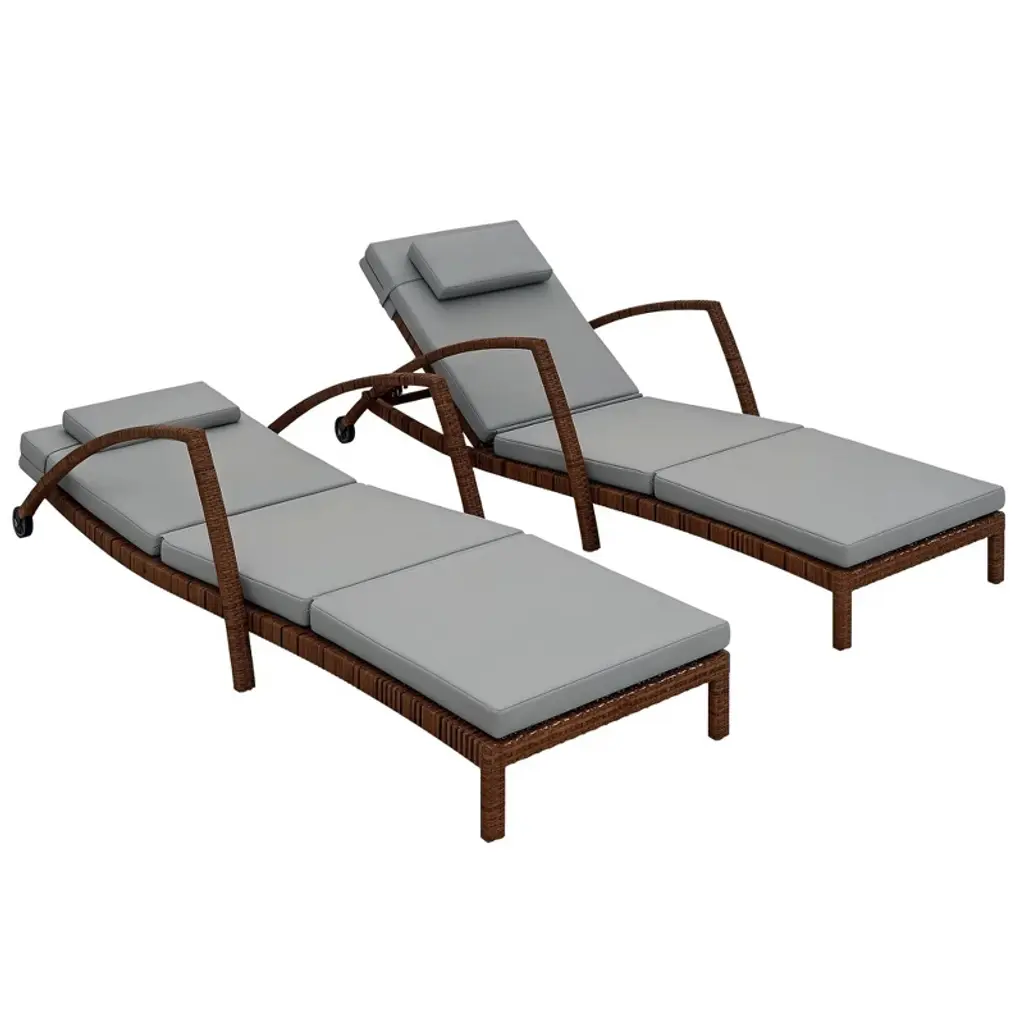 **Indulge in Luxury with the Resenkos Outdoor Chaise Lounge Chair Set at !**Enjoy the ultimate in outdoor relaxation with the ultra-comfortable Resenkos chaise lounge chair set. Designed for shared comfort and support, this set of two luxurious loungers offers ergonomic "S" shape conformity to the natural curves of the back, ensuring optimal relaxation in any position. Built with a galvanized steel frame wrapped in sturdy PE wicker, this set is both weather-resistant and durable, making it a great choice for any outdoor space.With adjustable backrests in five positions, integrated cushions and head pillows, this lounge chair set elevates your outdoor experience. The splash-resistant zipper covers make cleaning a breeze, while the straps securely hold the cushions in place. Easy mobility is ensured with built-in wheels and protective foot pads, allowing you to effortlessly move the chairs around your garden, patio, or poolside.The Resenkos outdoor chaise lounge chair set is constructed from high-quality materials, including galvanized steel, polyethylene rattan, and polyester, ensuring longevity and durability. With a weight capacity of 265 lbs., this set can accommodate a wide range of users. The brown and gray color combination seamlessly blend into your outdoor space, adding a touch of luxury and style.This premium pool lounger chair set includes two sun loungers, two cushions, two head pillows, and a comprehensive assembly manual. It is the perfect addition to your outdoor living space, allowing you to sit down, sunbathe, sleep, and enjoy peace and comfort. With its combination of comfort, durability, and style, the Resenkos outdoor chaise lounge chair set is a must-have at . Don't miss out on this premium offering - order yours now! Key Features: Outdoor Chaise Lounge Chair Set, Ergonomic Design, Adjustable Backrest, Galvanized Steel Frame, Cushions and Head Pillows for Enhanced Comfort, Splash-resistant Zipper Covers for Easy Cleaning, Easy Mobility, Durable Materials, Color Options, Weight Capacity.A must-have for any outdoor living space at ! Indulge in luxury with the Resenkos outdoor chaise lounge chair set today!