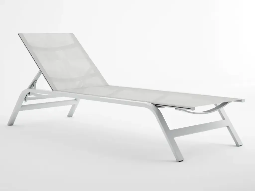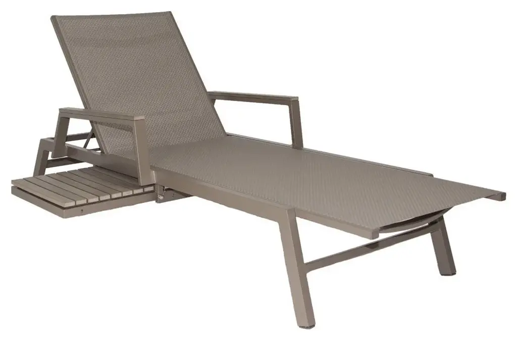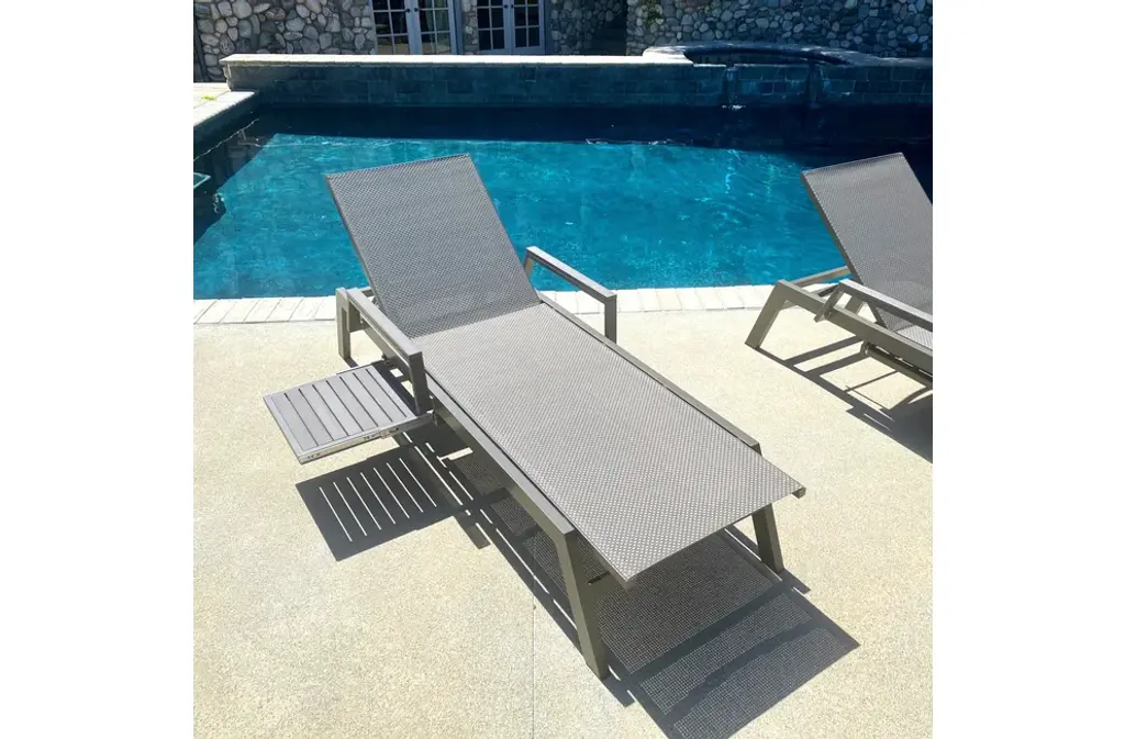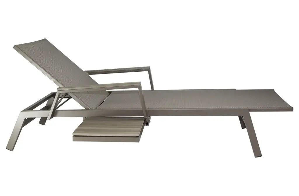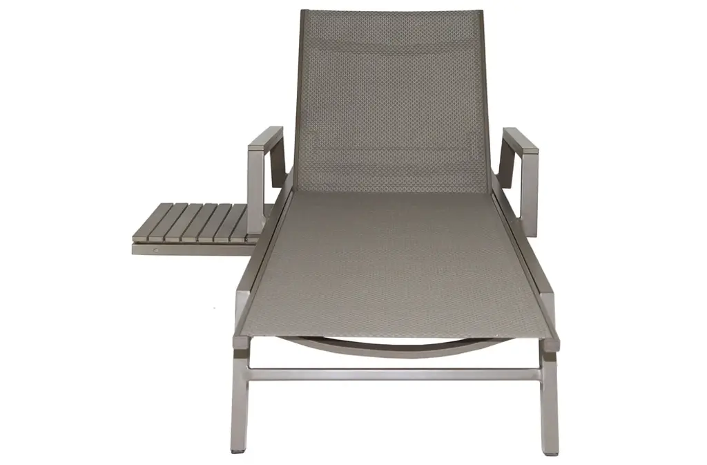 The Riviera Outdoor Lounger offers sophisticated form and steady function to be appreciated in your home for all seasons. Slip onto this sleek chaise and let your troubles drift away, rain or shine, the all-weather vinyl won't disturb your relaxation. Sink into the gentle curves of its therapeutic, ergonomic design and adjustable backrest.Materials: Powder coated aluminum, Faux Wood, and Woven Vinyl MeshAssembly: NoDimensions: W 30" x D 78" x H 18"Color: Gray