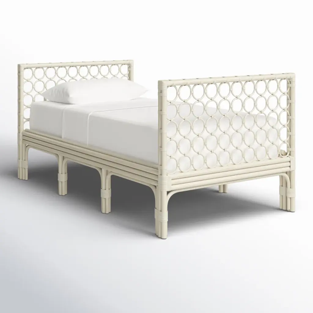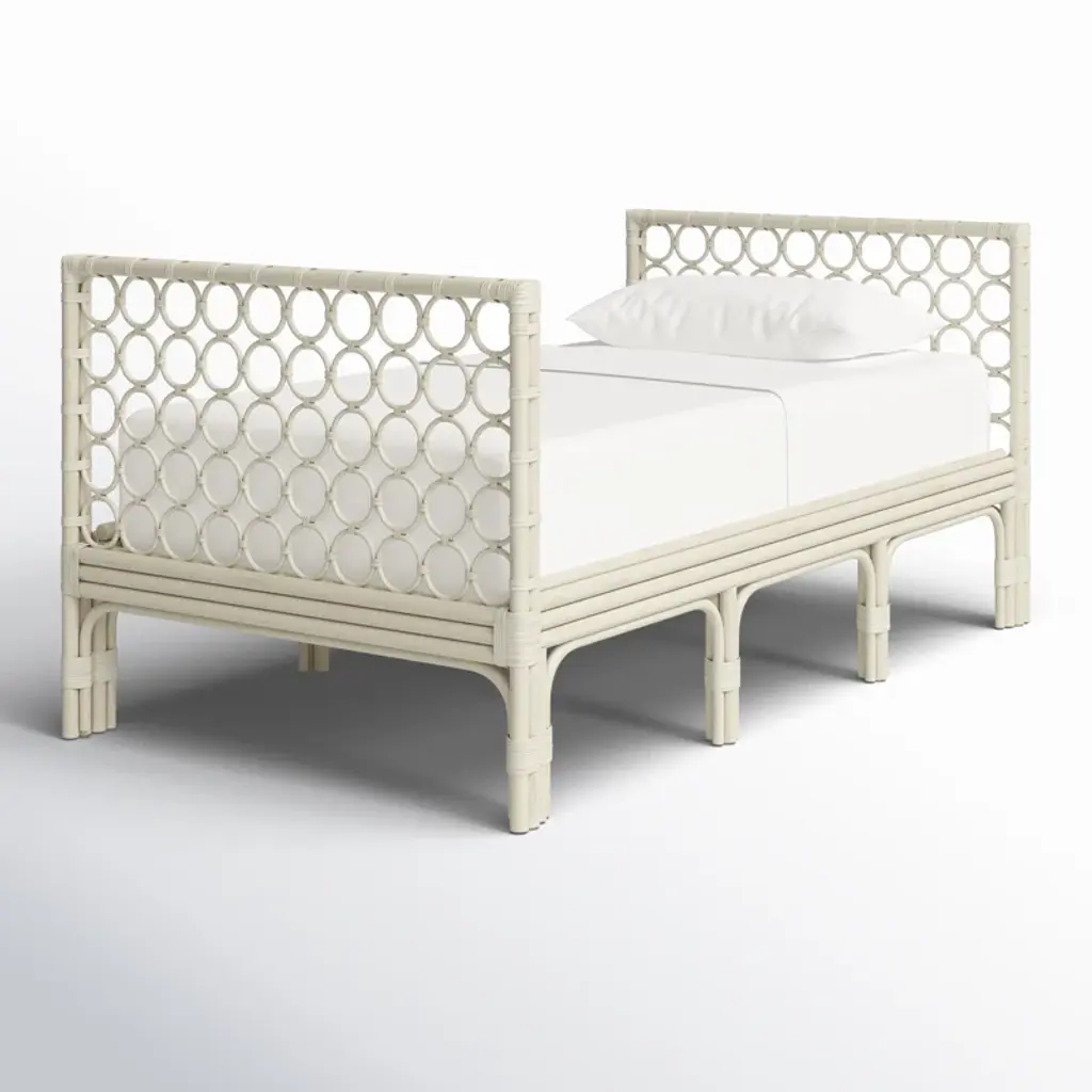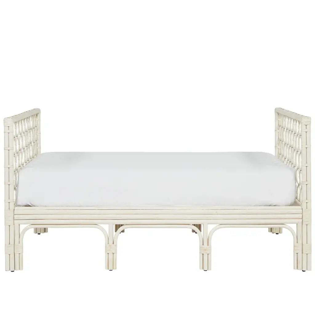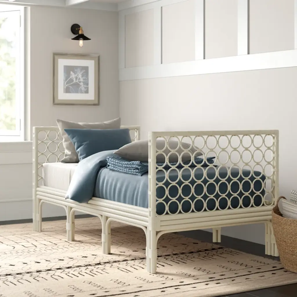 Ideal for a midday snooze or a nap after hitting the beach, the Rooney day bed is the epitome of coastal style. Featuring a layered silhouette with circular textured accents in a distressed egret finish.