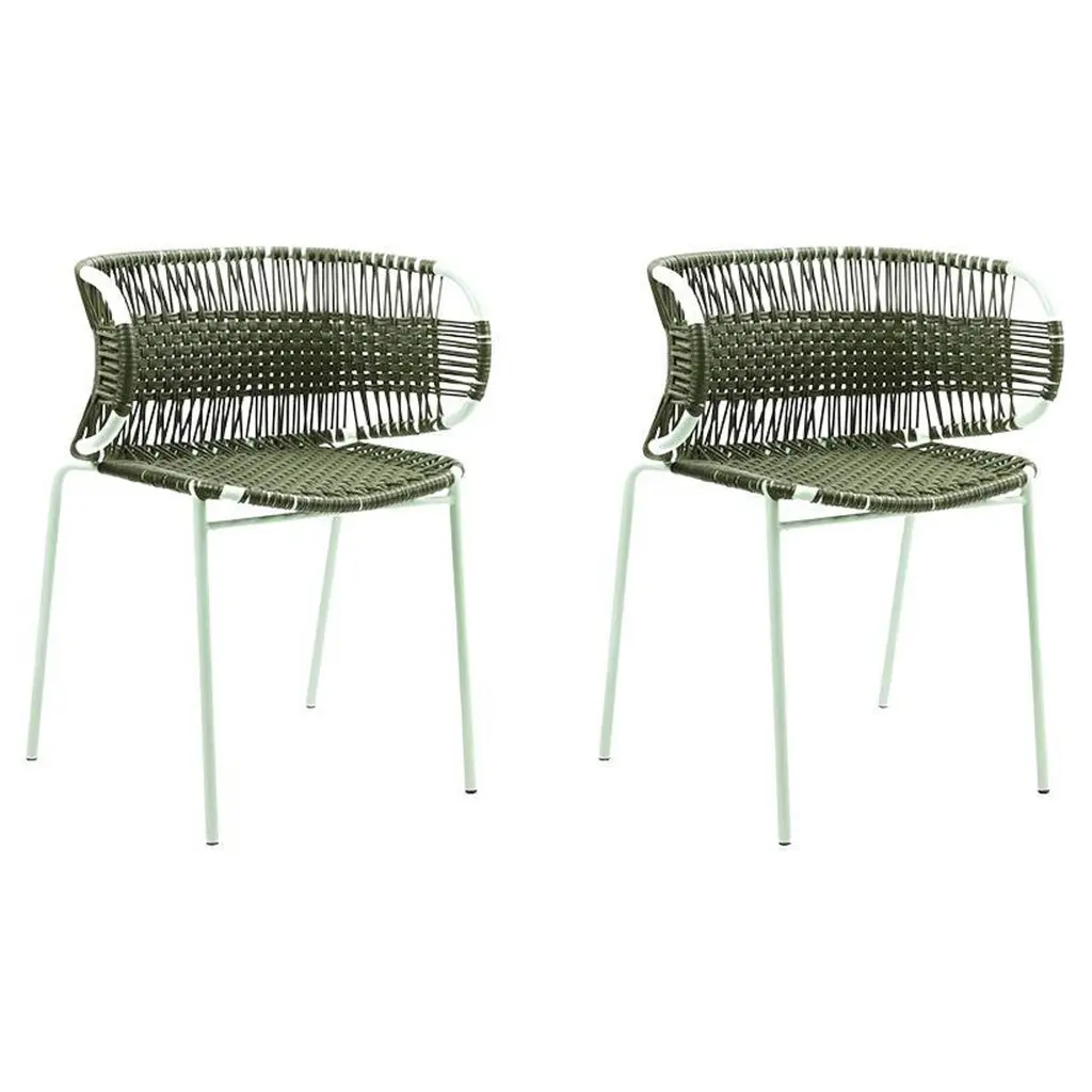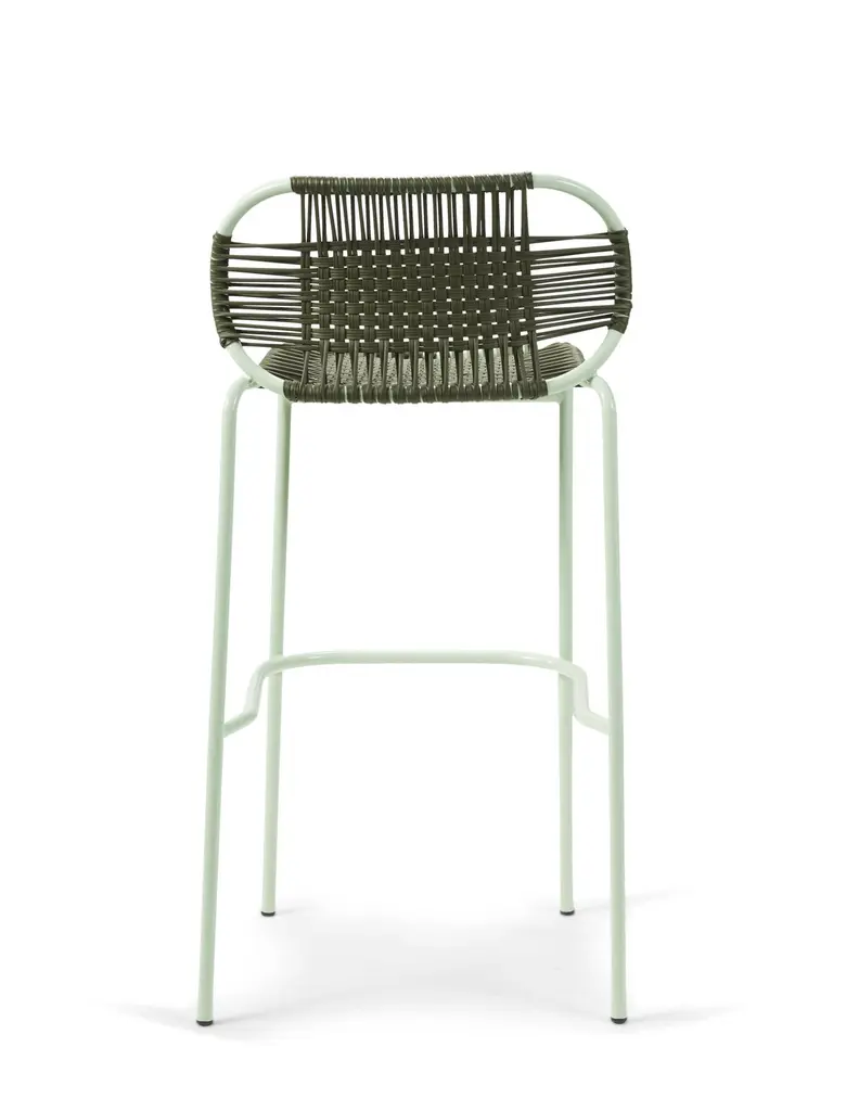 Set of 2 olive Cielo bar stool by Sebastian HerknerMaterials: galvanized and powder-coated tubular steel. PVC strings are made from recycled plastic.Technique: made from recycled plastic and weaved by local craftspeople in Cartagena, Colombia. Dimensions: W 52 x D 46.6 x H 101 cm Also available colors: brown, mint/ black, black-black, olive/ menta, purple/ carne, honey/ menta.The Cielo bar stool is a light and versatile design by Sebastian Herkner. It’s ready for indoor and outdoor use and will spruce up bar counters at home or in hospitality spaces. Available in various color combinations, the stackable chair can also add personality to dining areas of restaurants or hotels. Like the daybed and lounge chairs of the collection, the colors and look are inspired by Sebastian’s visits to Colombia. There, he not only immersed himself in the culture and beauty of the country but also met the local Ames artisans and learned about their traditional weaving techniques.Each armchair is made in Santa Marta, a city on the Caribbean coast of Colombia, by local craftspeople. They weave the PVC strings, which are made from recycled plastic, around a powder-coated tubular steel frame. The weaving technique the artesanos and artesanas use are called Momposino, a traditional method known for intricate patterns. Just the preparation of all the materials takes ten days, while the production of each armchair takes three days.German designer Sebastian Herkner is a long-term collaborator of Ames and has visited Colombia multiple times to experience the country’s cities, nature and people first hand. He also visited many of the ateliers that Ames has partnered with to learn about the unique traditional crafts of Colombia's regions. A sought-after contemporary designer and recipient of many industry awards, he has worked with many international design brands, creating intriguing pieces that showcase his intuition for interesting material, color, and texture combinations