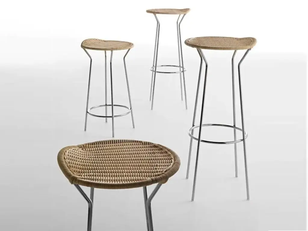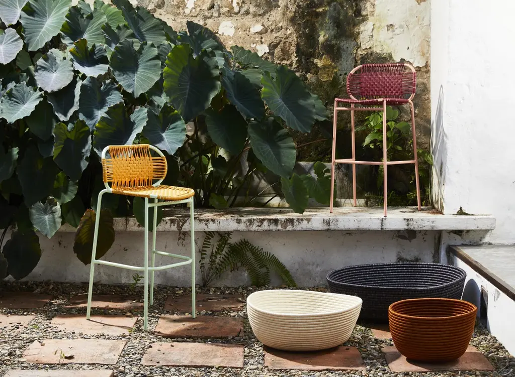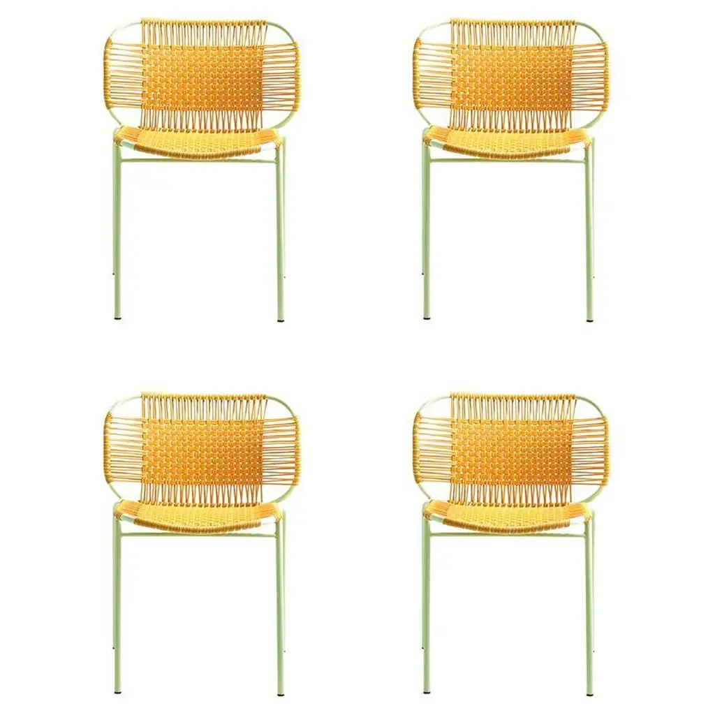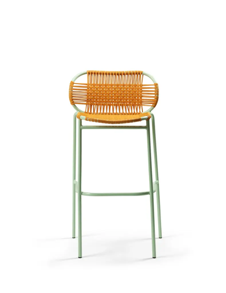 Set of 4 honey Cielo bar stool by Sebastian Herkner.Materials: galvanized and powder-coated tubular steel. PVC strings are made from recycled plastic.Technique: Made from recycled plastic and weaved by local craftspeople in Cartagena, Colombia. Dimensions: W 52 x D 46.6 x H 101 cm Also available colors: brown, mint/ black, black-black, olive/ menta, purple/ carne , honey/ menta.The Cielo bar stool is a light and versatile design by Sebastian Herkner. It’s ready for indoor and outdoor use and will spruce up bar counters at home or in hospitality spaces. Available in various color combinations, the stackable chair can also add personality to dining areas of restaurants or hotels. Like the daybed and lounge chairs of the collection, the colors and look are inspired by Sebastian’s visits to Colombia. There, he not only immersed himself in the culture and beauty of the country but also met the local Ames artisans and learned about their traditional weaving techniques.Each armchair is made in Santa Marta, a city on the Caribbean coast of Colombia, by local craftspeople. They weave the PVC strings, which are made from recycled plastic, around a powder-coated tubular steel frame. The weaving technique the artesanos and artesanas use are called Momposino, a traditional method known for intricate patterns. Just the preparation of all the materials takes ten days, while the production of each armchair takes three days.German designer Sebastian Herkner is a long-term collaborator of Ames and has visited Colombia multiple times to experience the country’s cities, nature and people first hand. He also visited many of the ateliers that Ames has partnered with to learn about the unique traditional crafts of Colombia's regions. A sought-after contemporary designer and recipient of many industry awards, he has worked with many international design brands, creating intriguing pieces that showcase his intuition for interesting material, color, and texture combinations.