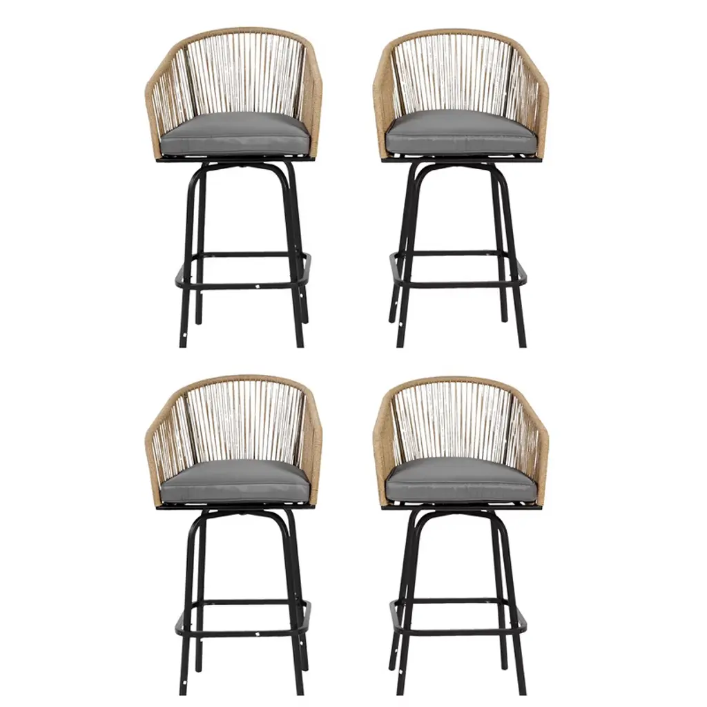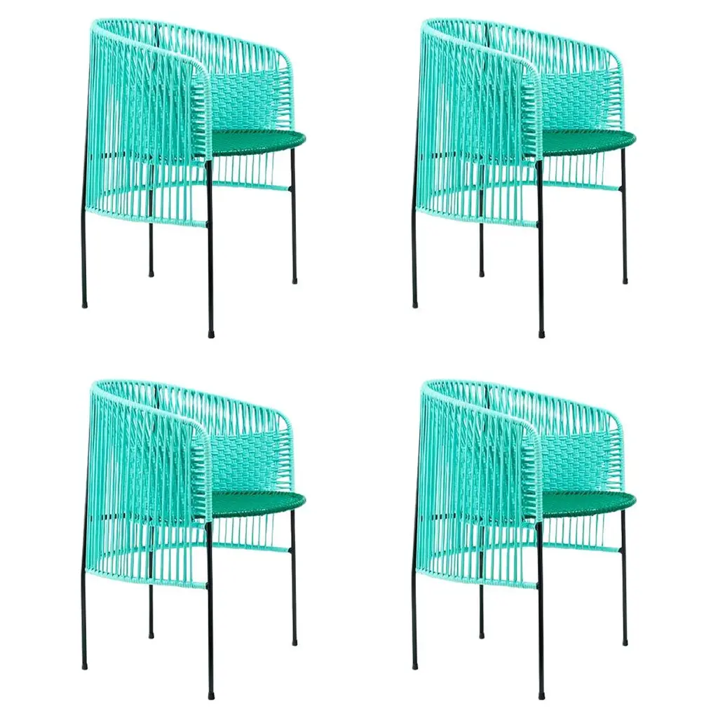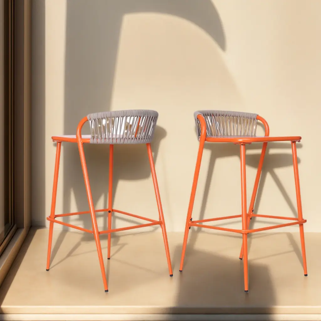 Set of 4 honey Cielo bar stool by Sebastian Herkner.Materials: galvanized and powder-coated tubular steel. PVC strings are made from recycled plastic.Technique: Made from recycled plastic and weaved by local craftspeople in Cartagena, Colombia. Dimensions: W 52 x D 46.6 x H 101 cm Also available colors: brown, mint/ black, black-black, olive/ menta, purple/ carne , honey/ menta.The Cielo bar stool is a light and versatile design by Sebastian Herkner. It’s ready for indoor and outdoor use and will spruce up bar counters at home or in hospitality spaces. Available in various color combinations, the stackable chair can also add personality to dining areas of restaurants or hotels. Like the daybed and lounge chairs of the collection, the colors and look are inspired by Sebastian’s visits to Colombia. There, he not only immersed himself in the culture and beauty of the country but also met the local Ames artisans and learned about their traditional weaving techniques.Each armchair is made in Santa Marta, a city on the Caribbean coast of Colombia, by local craftspeople. They weave the PVC strings, which are made from recycled plastic, around a powder-coated tubular steel frame. The weaving technique the artesanos and artesanas use are called Momposino, a traditional method known for intricate patterns. Just the preparation of all the materials takes ten days, while the production of each armchair takes three days.German designer Sebastian Herkner is a long-term collaborator of Ames and has visited Colombia multiple times to experience the country’s cities, nature and people first hand. He also visited many of the ateliers that Ames has partnered with to learn about the unique traditional crafts of Colombia's regions. A sought-after contemporary designer and recipient of many industry awards, he has worked with many international design brands, creating intriguing pieces that showcase his intuition for interesting material, color, and texture combinations.
