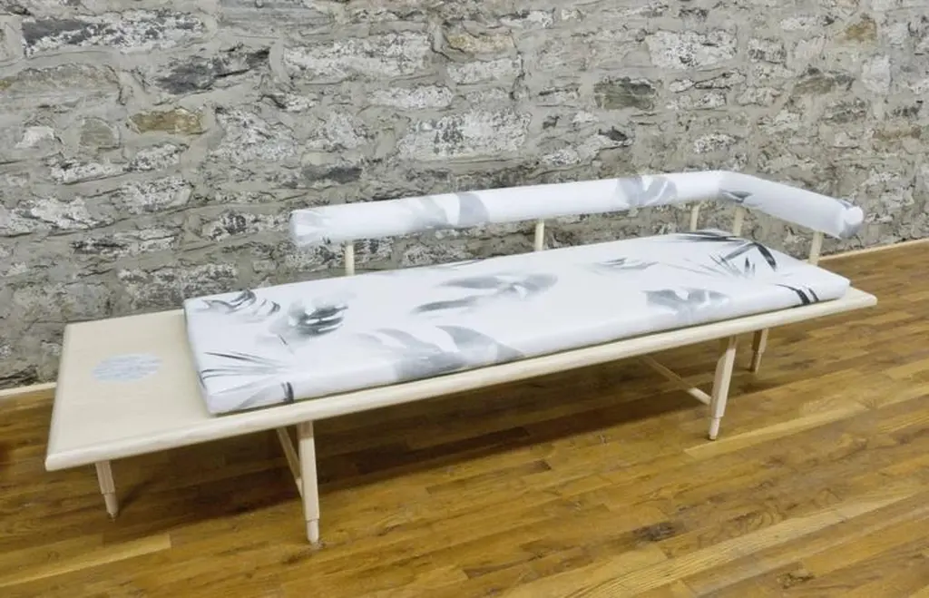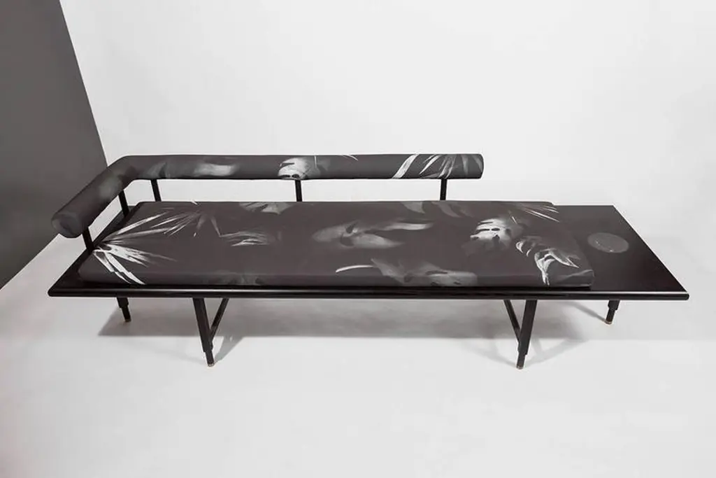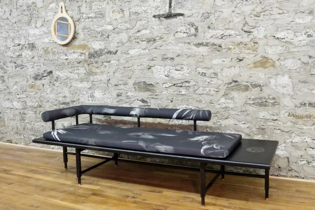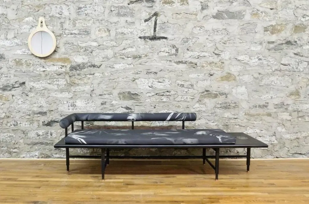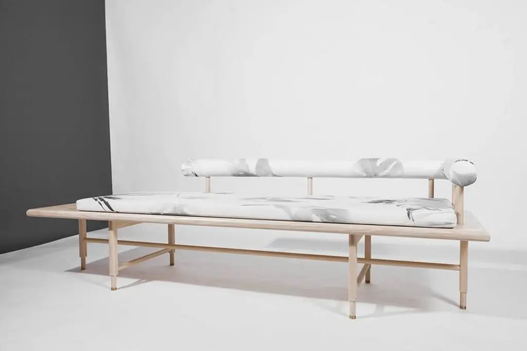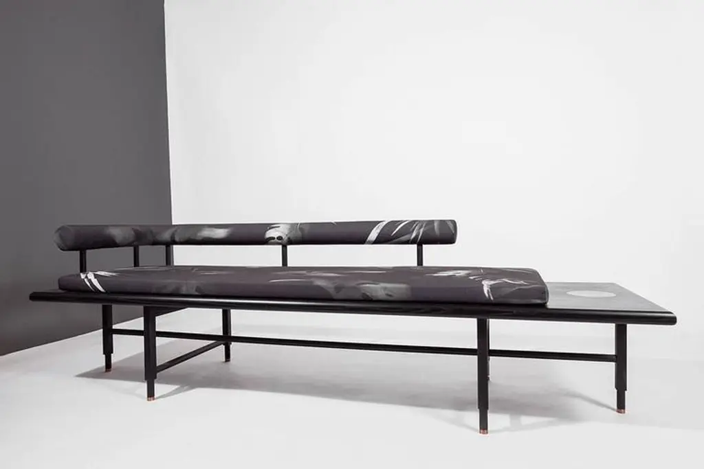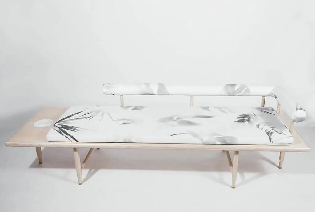 As shown:Bleached or blackened ash veneer with solid ash and inset marble.Flat waterborne finish.Tropical fabric pattern developed in collaboration with Kate Wall.Offered in a black or white colorway with left or right oriented bolster.Dimensions: 15.5” H x 86” W x 26” D.COM fabric and upholstery options available.Offered in a variety of woods and finishes.