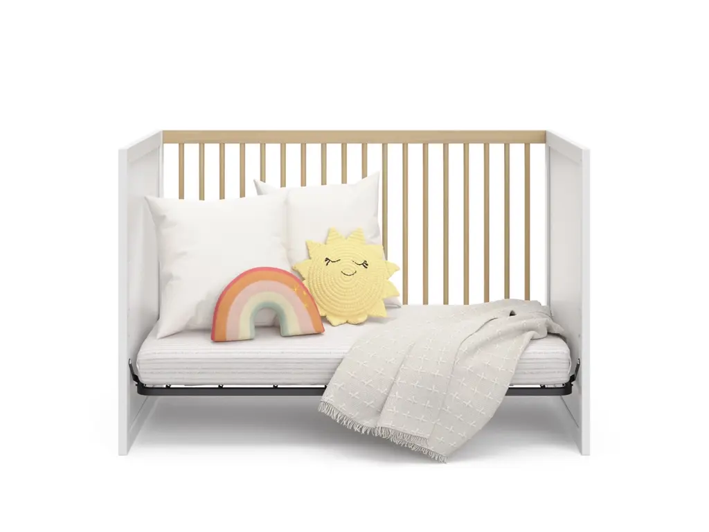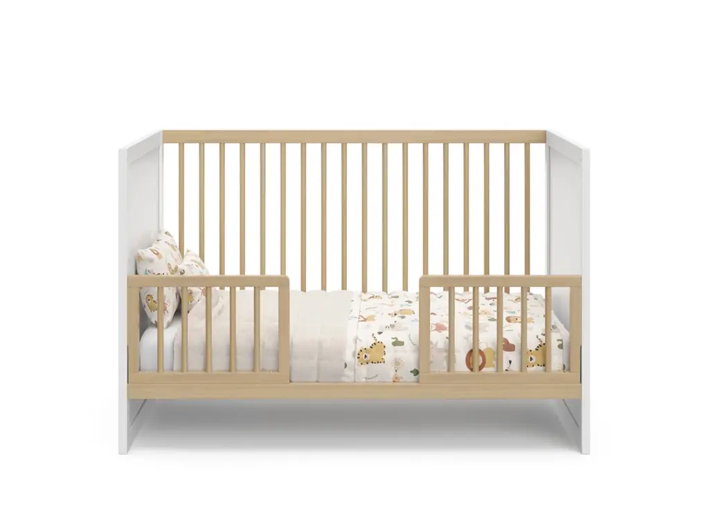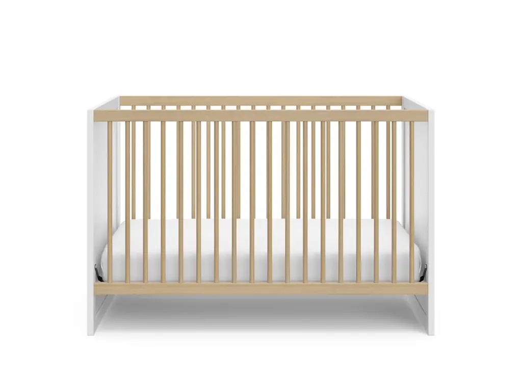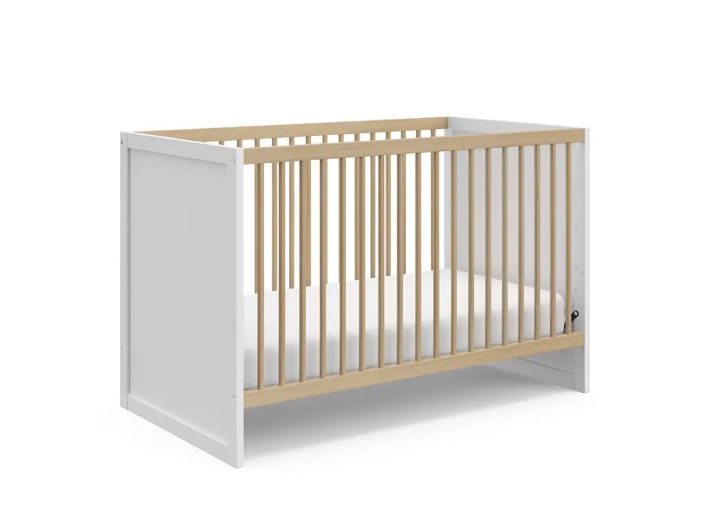 Bring your dream nursery to life with the Storkcraft Calabasas 3-in-1 Convertible Crib. Versatile design and California style, all at an incredible value. With its solid side panels and modern-minimalist aesthetic, the Calabasas is a fitting addition to any nursery. The Calabasas is crafted from pine wood and wood composites, and its applied finish has been tested to meet or exceed the applicable ASTM and CPSIA safety standards. The Storkcraft Calabasas 3-in-1 Convertible Crib is JPMA Certified, meaning it's been expert tested by third-party, accredited laboratories to meet or exceed all of the applicable category voluntary and mandatory safety standards. Designed to adapt to your growing baby, the Calabasas is equipped with an adjustable mattress support base with 4 different height options so the mattress support base's position can be lowered as your child grows [please note, this crib may only be used until your child can easily climb out or is taller than 35 inches (89 cm)]. To support your child's journey from babyhood to toddlerhood (and beyond), the Calabasas is able to be converted from a crib to a toddler bed (compatible toddler guardrail kit sold separately), and daybed. The Storkcraft Calabasas 3-in-1 Convertible Crib is designed to accommodate any standard full-size crib & toddler mattress (mattress sold separately). Storkcraft is the proud recipient of the Parent Tested Parent Approved (PTPA) Seal of Approval for nursery and children's bedroom furniture, 2023 PTPA Top Product Award, and the 2018-2023 Women's Choice Award for 9 out of 10 Recommended Baby & Kids Furniture. Backed by a 1-year limited manufacturer's warranty. Assembly required. Mattress sold separately.