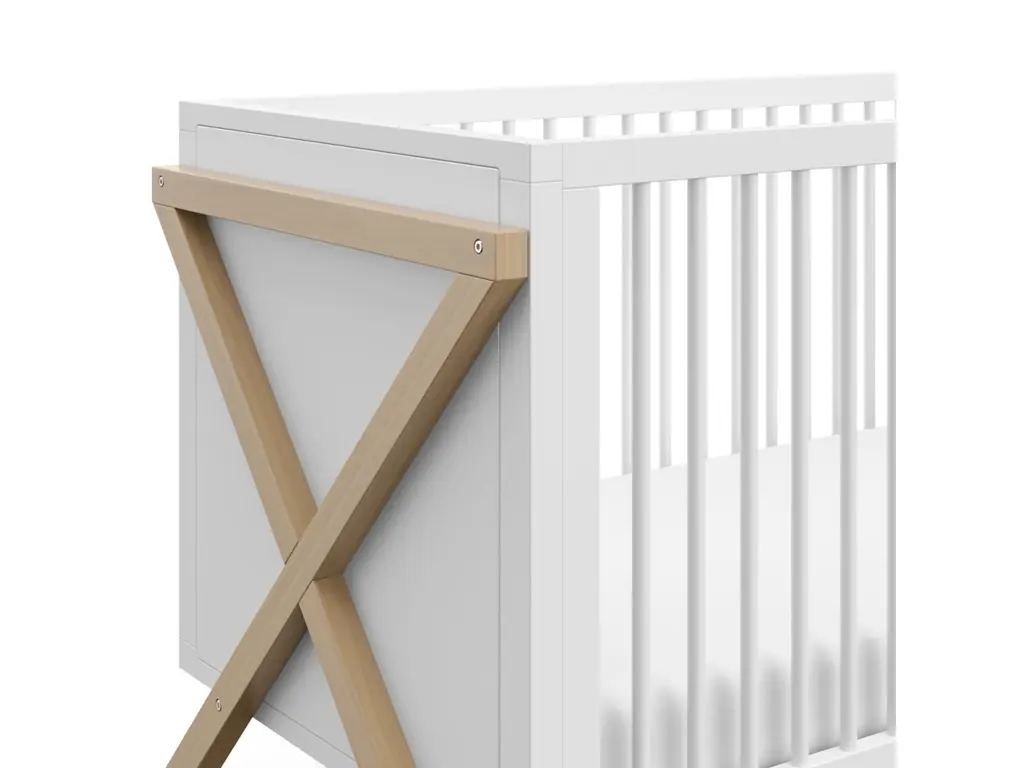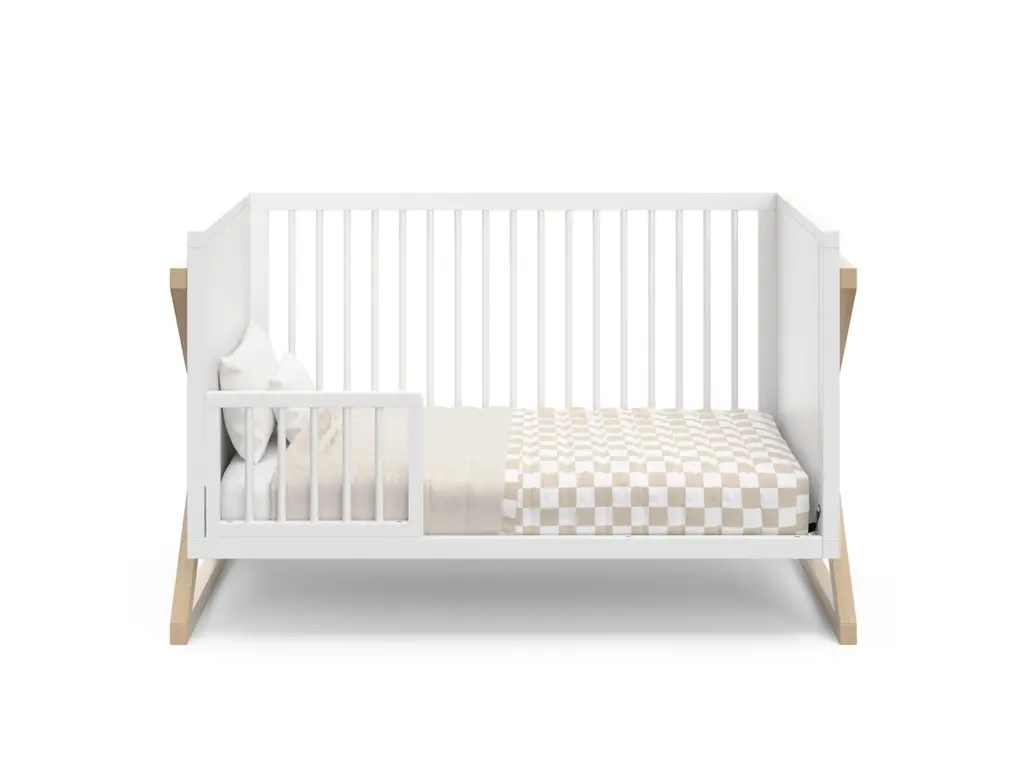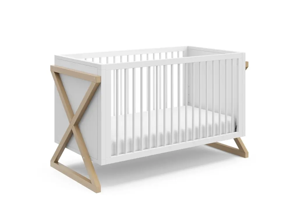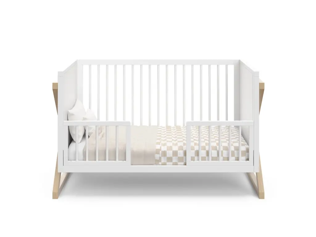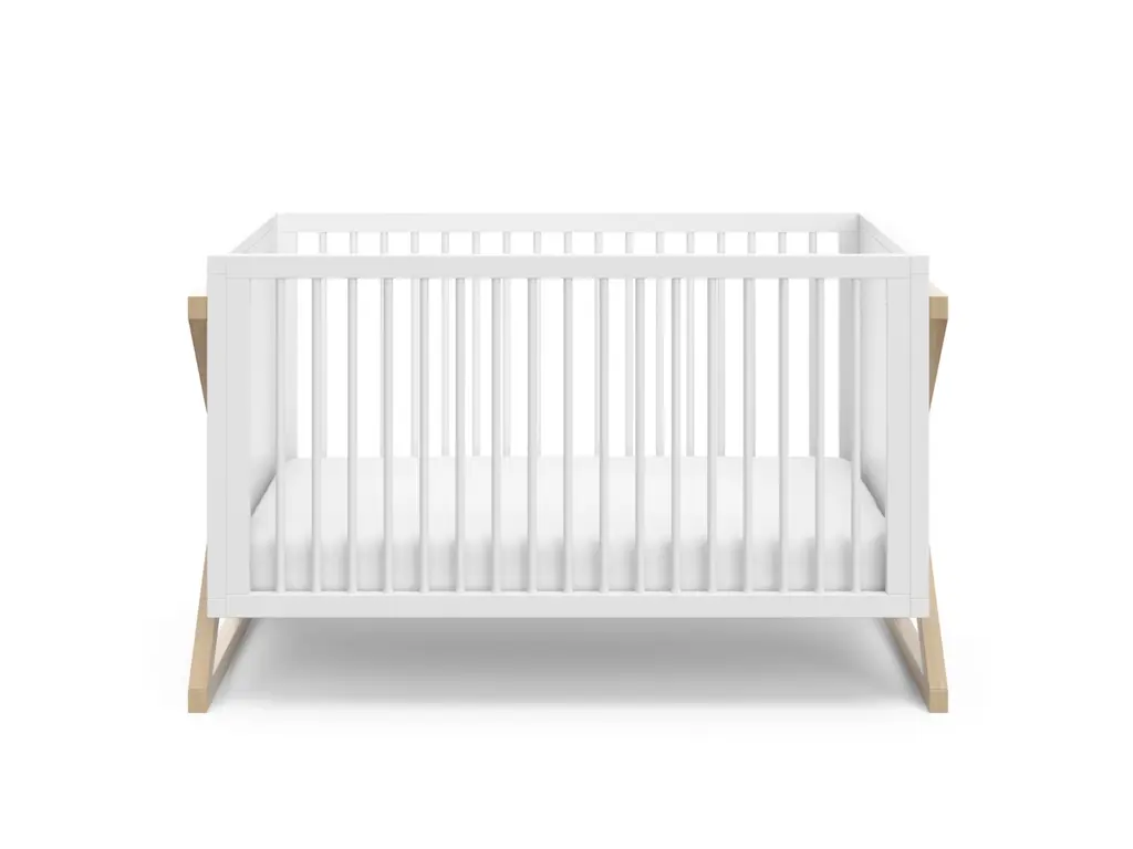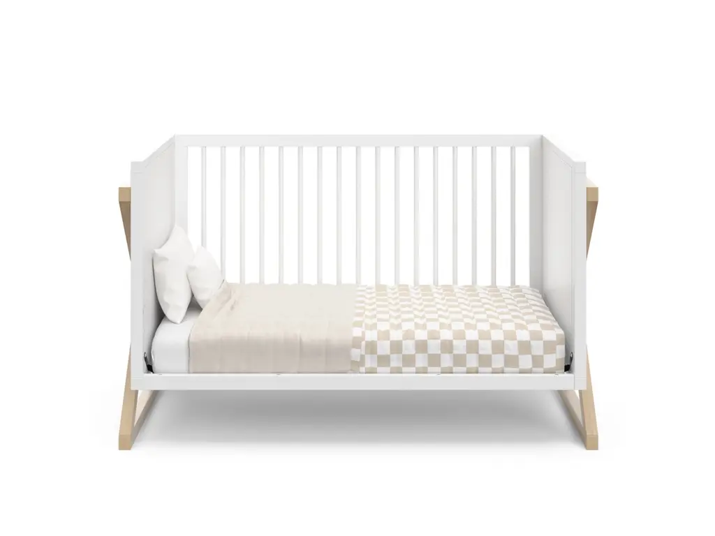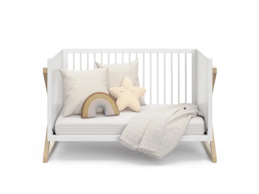 The Storkcraft Equinox 3-in-1 Convertible Crib is a stunning addition to the modern nursery. With its clean lines, two-tone finish, and signature "X" design, the Equinox is an eye-catching baby crib that add a designer look to any nursery. Designed to adapt to your growing baby, the Storkcraft Equinox 3-in-1 Convertible Crib is equipped with a 3-position adjustable mattress support base, and can convert from a crib into a daybed and toddler bed. JPMA certified and compliant with all applicable federal safety standards, rest easy knowing that the Equinox is backed by Storkcraft's 1-year limited warranty and supportive customer care. Exclusively from Storkcraft, proud recipient of the 2023 Women's Choice Award for 9 out of 10 Customer Recommended Baby & Kids Furniture.