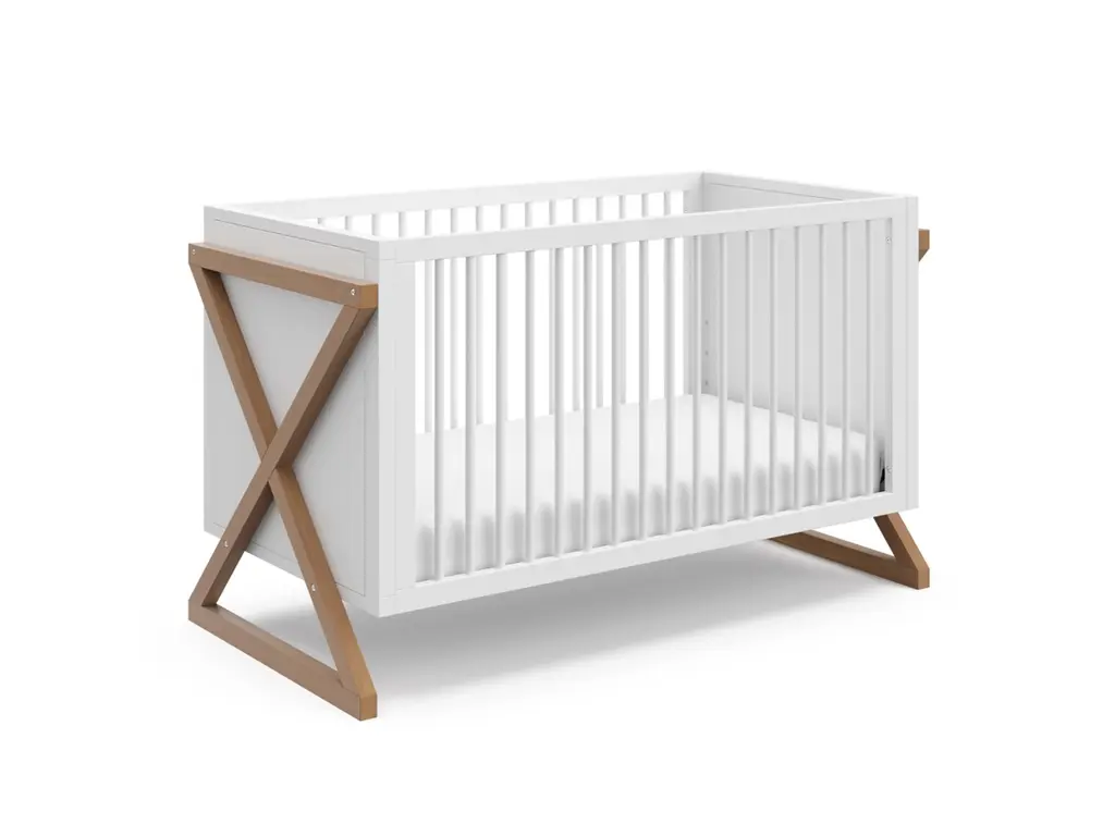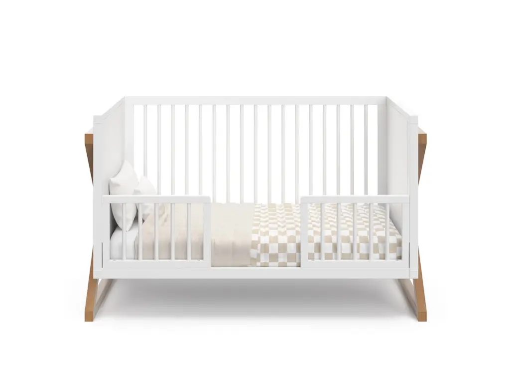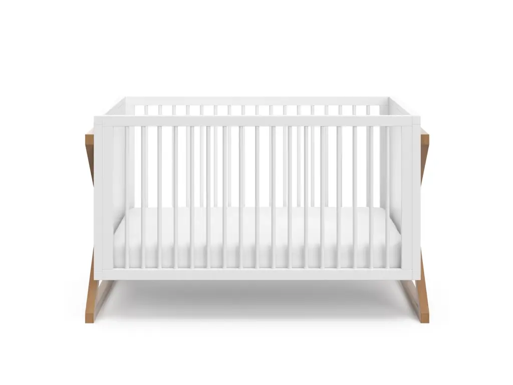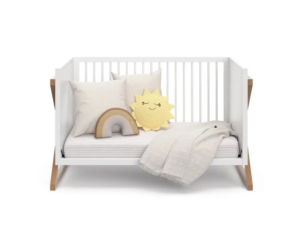 The Storkcraft Equinox 3-in-1 Convertible Crib is a stunning addition to the modern nursery. With its clean lines, two-tone finish, and signature "X" design, the Equinox is an eye-catching baby crib that add a designer look to any nursery. Designed to adapt to your growing baby, the Storkcraft Equinox 3-in-1 Convertible Crib is equipped with a 3-position adjustable mattress support base, and can convert from a crib into a daybed and toddler bed. JPMA certified and compliant with all applicable federal safety standards, rest easy knowing that the Equinox is backed by Storkcraft's 1-year limited warranty and supportive customer care. Exclusively from Storkcraft, proud recipient of the 2023 Women's Choice Award for 9 out of 10 Customer Recommended Baby & Kids Furniture.