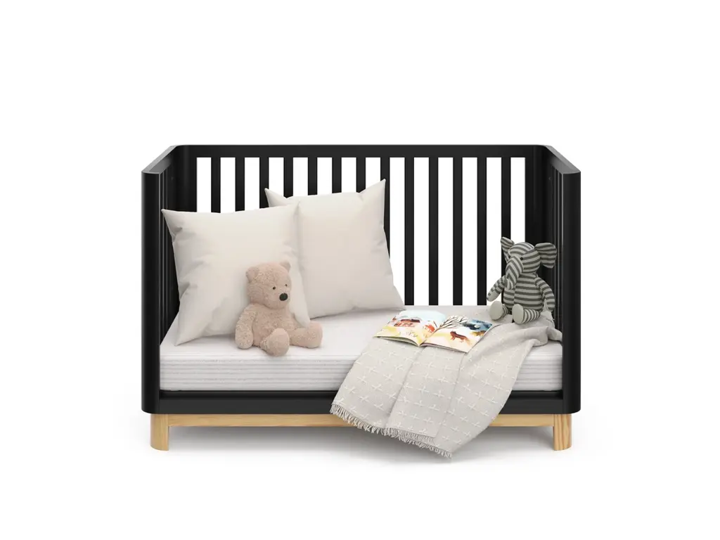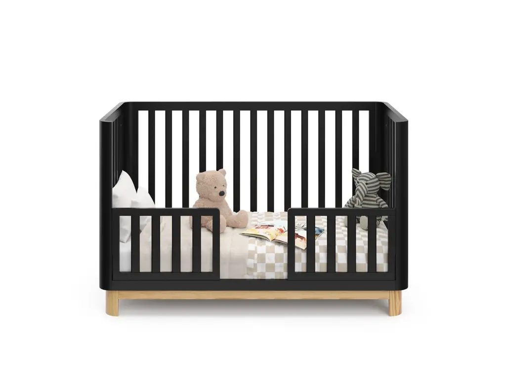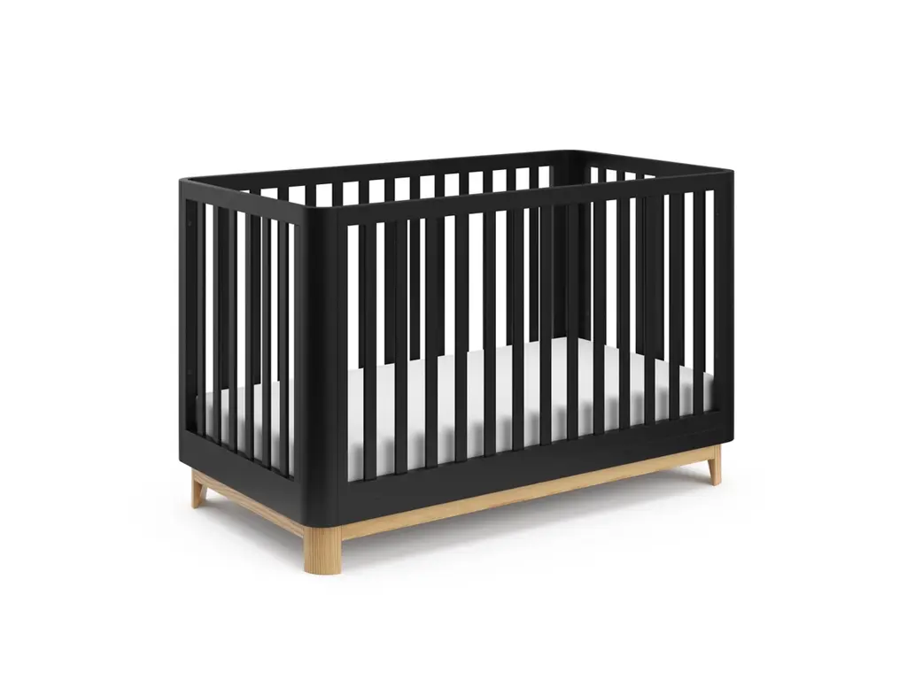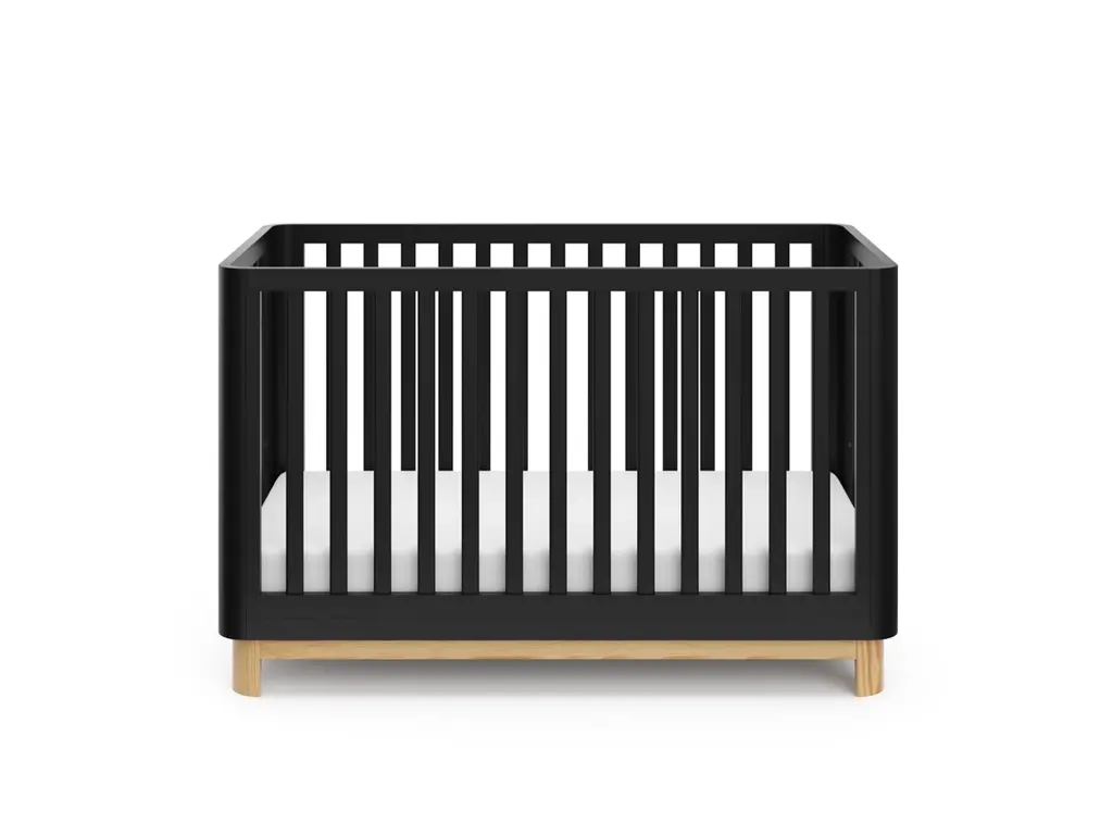 Introducing the Storkcraft Santos 3-in-1 Convertible Crib – an incredibly beautiful two-tone convertible crib with elegantly rounded posts. A signature Storkcraft design, the Santos has rounded posts for a soft silhouette, and a natural wood base for stylish two-tone flair. Complete your Storkcraft Santos Collection with the matching Storkcraft Santos 6 Drawer Double Dresser for the perfect pair. The Santos is designed to fit any standard full-size crib mattress (sold separately – we recommend any Graco crib mattress), is crafted from pine wood and engineered wood, and its applied finish has been tested to meet or exceed the applicable ASTM and CPSIA safety standards. The Santos is JPMA Certified, meaning it has been expert tested by independent laboratories to meet or exceed all applicable category safety standards. Designed to adapt to your growing baby, the Santos features an adjustable mattress support base with four height options (including a higher mattress position, which is suitable for newborns). Transform the Santos from a crib to a toddler bed (compatible with 1 or 2 toddler safety guardrails – each guardrail sold separately), and to a daybed. Exclusively from Storkcraft – makers of quality nursery and kids bedroom furniture since 1945. Storkcraft is the proud recipient of the Parent Tested Parent Approved (PTPA) Seal of Approval, 2024 PTPA Top Product Award, and Women’s Choice Award for 9 out of 10 Recommended Baby & Kids Furniture. Backed by Storkcraft’s supportive, passionate Customer Care team and 1-year limited manufacturer's warranty. Assembly required. Mattress and toddler safety guardrails each sold separately.